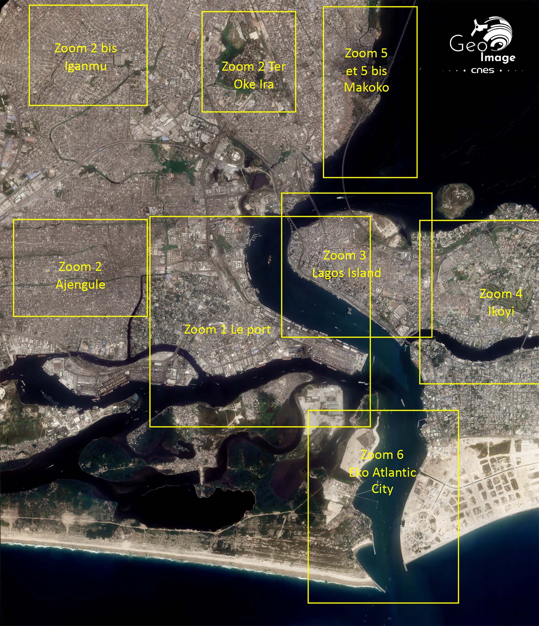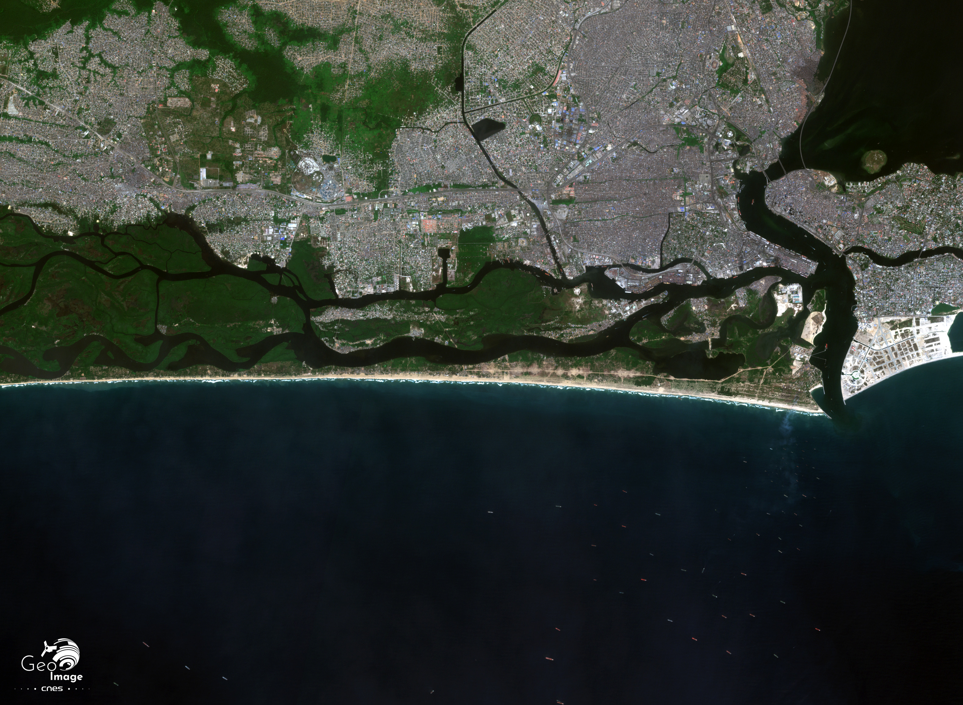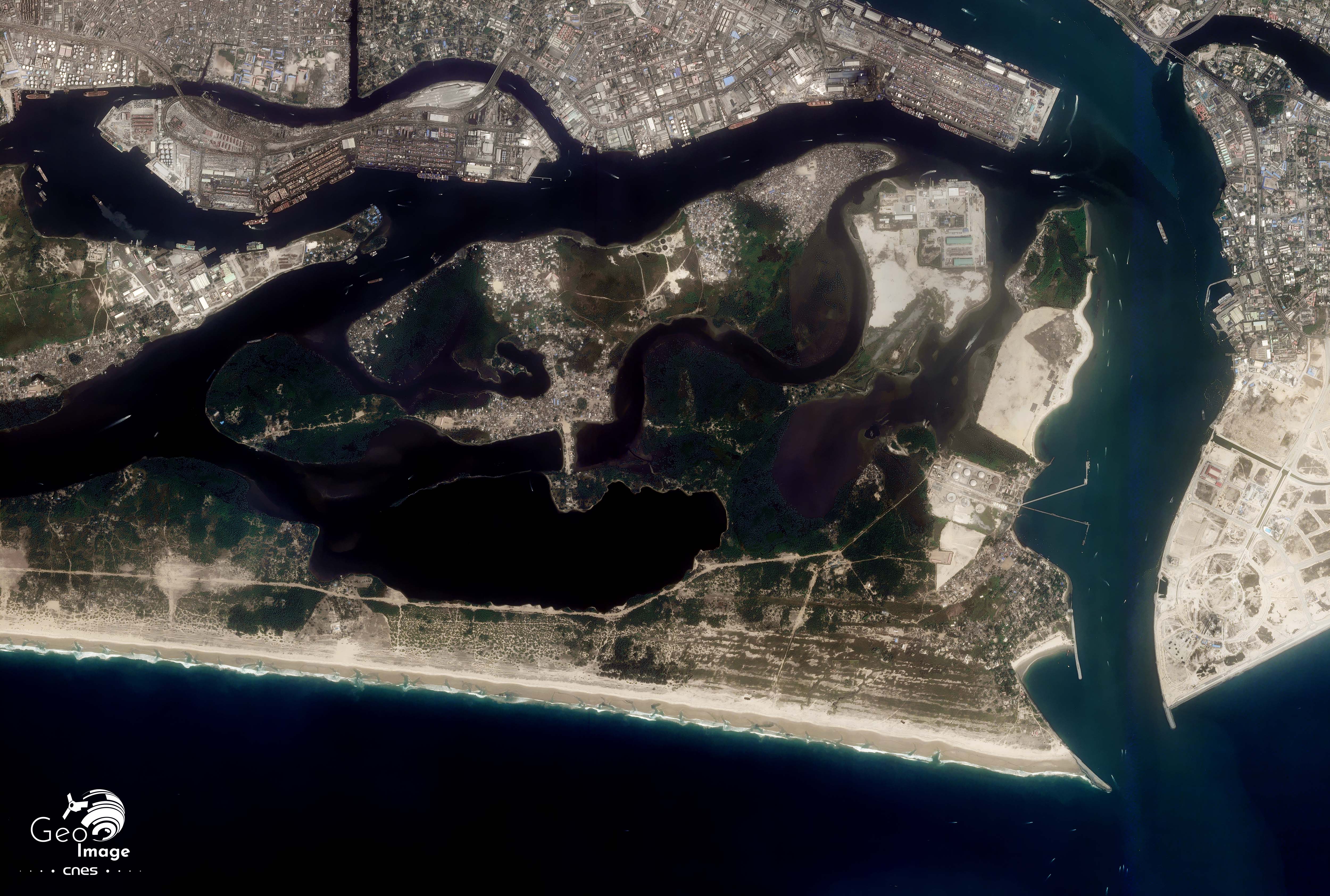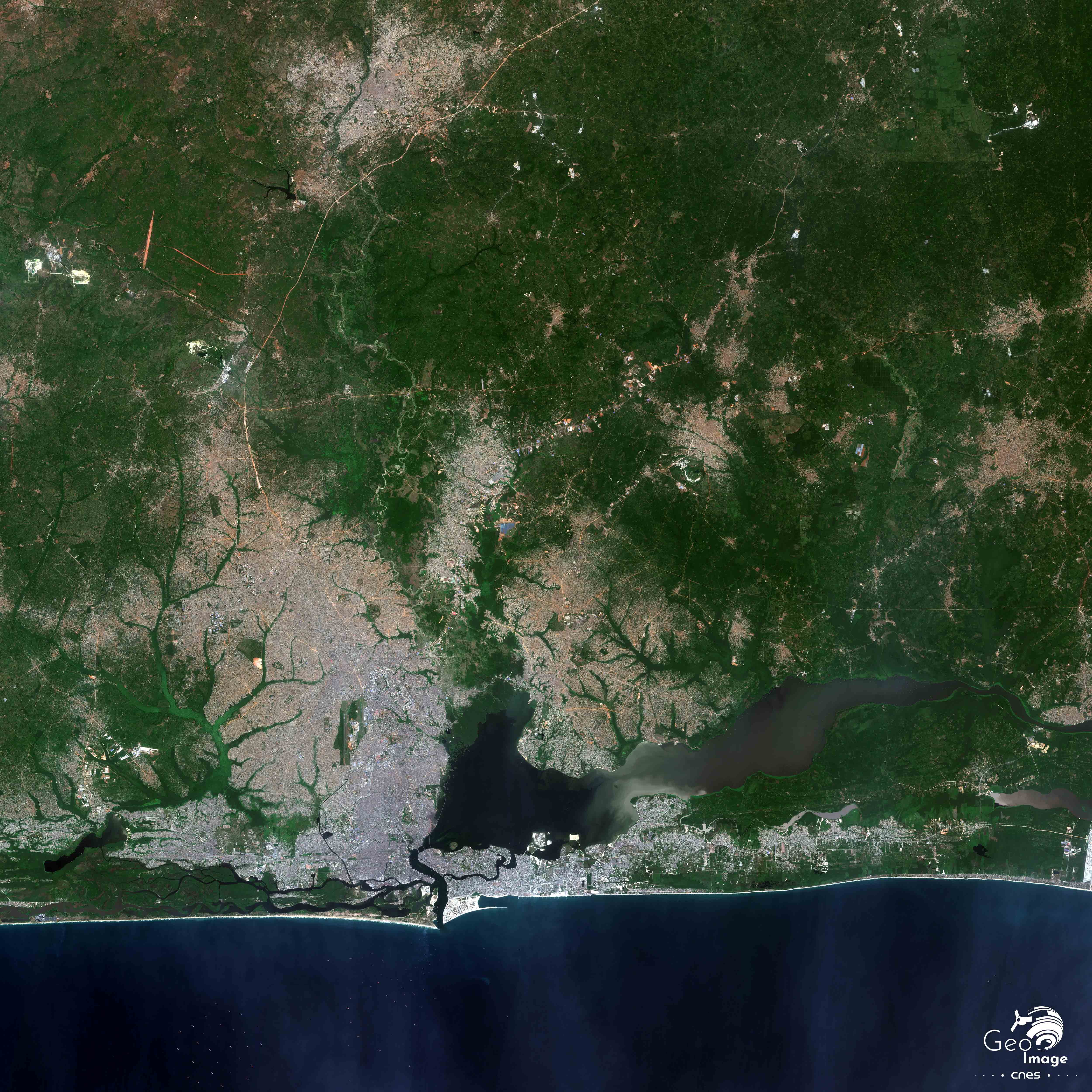 Cette image de la ville de Lagos, la plus grande ville du Nigéria, a été prise par un satellite Pléiades le 24 décembre 2018. Il s’agit d’une image en couleur naturelle, de résolution native à 0,70m, ré-échantillonnée à 0,5m.