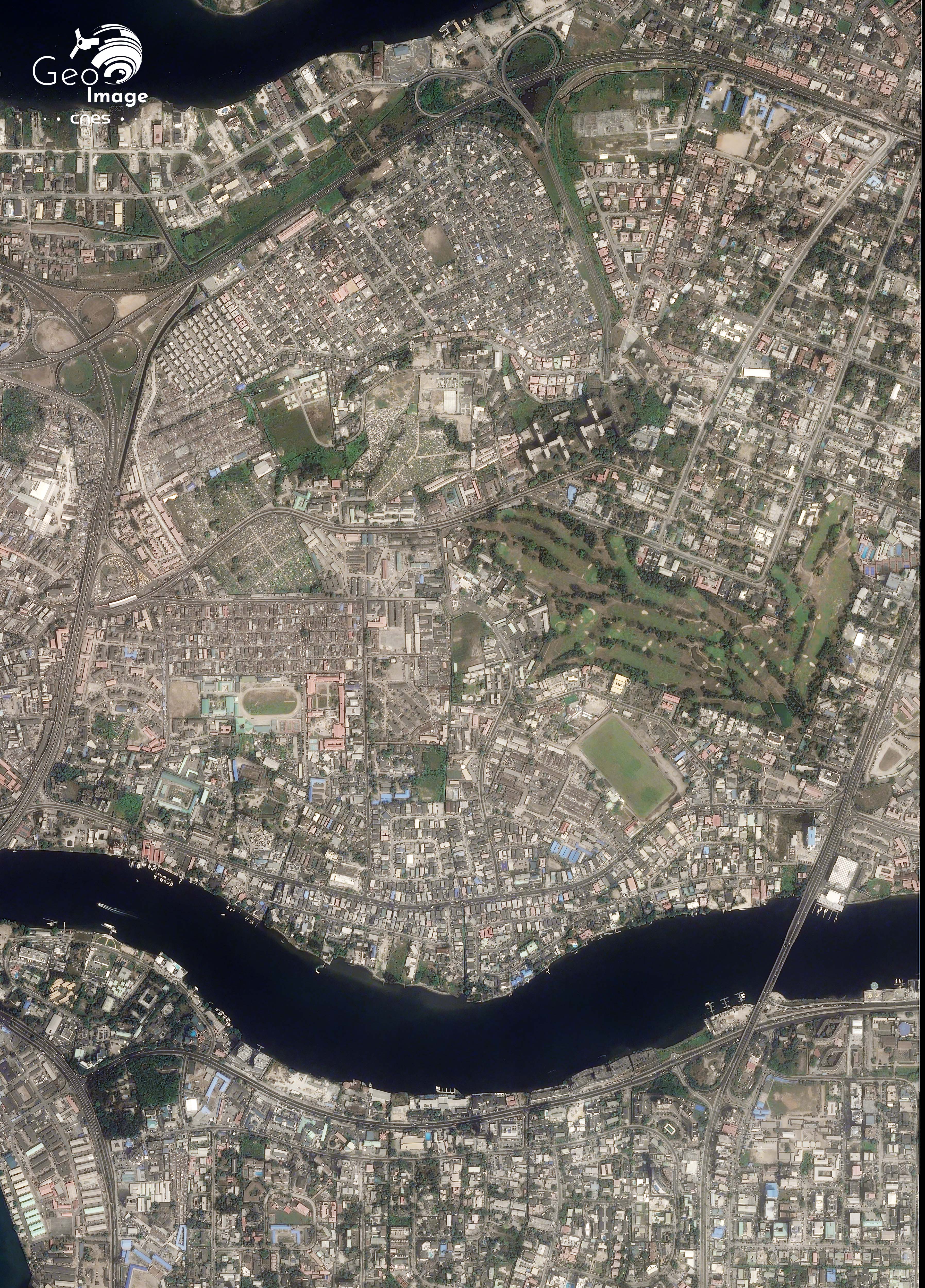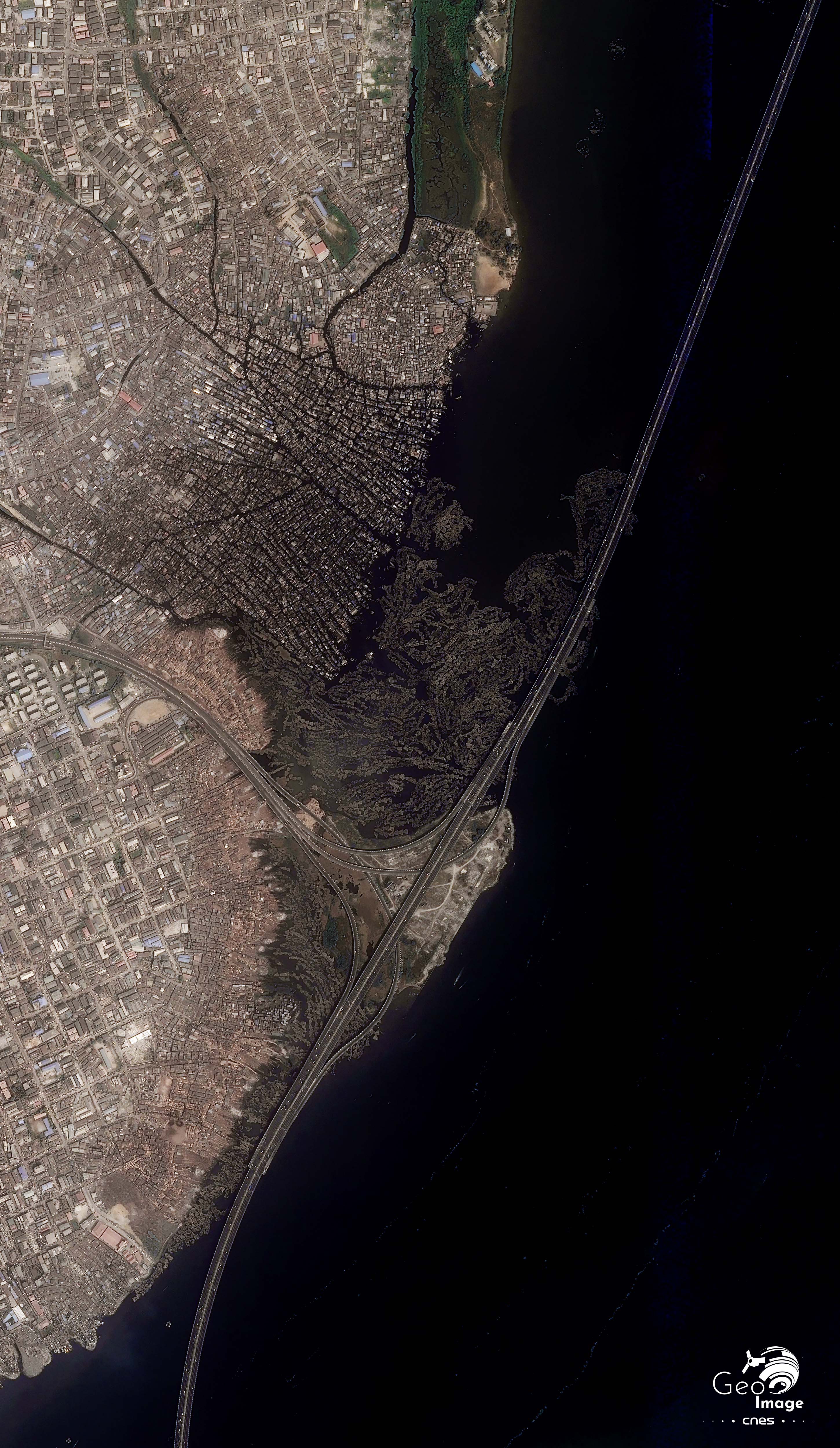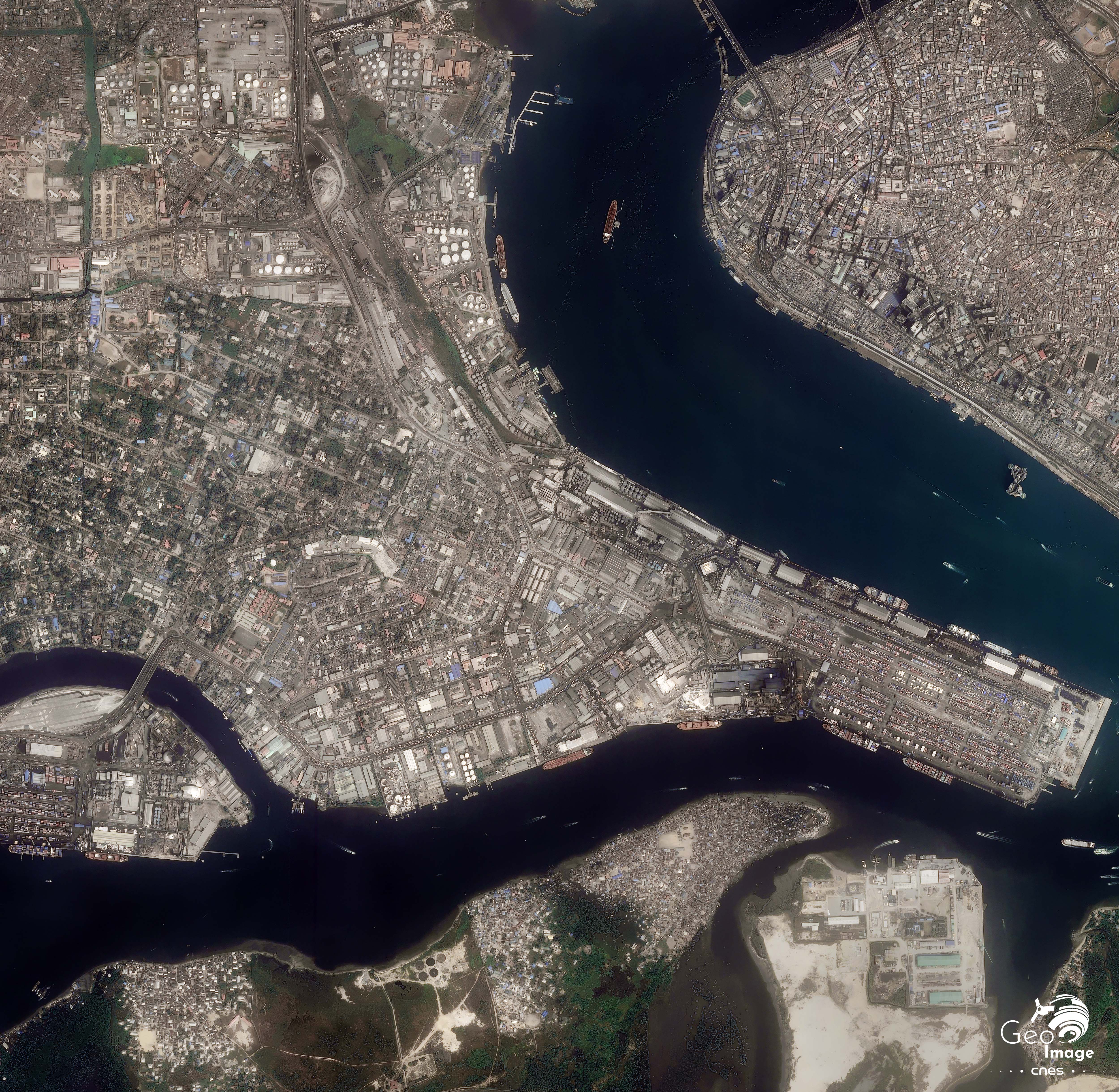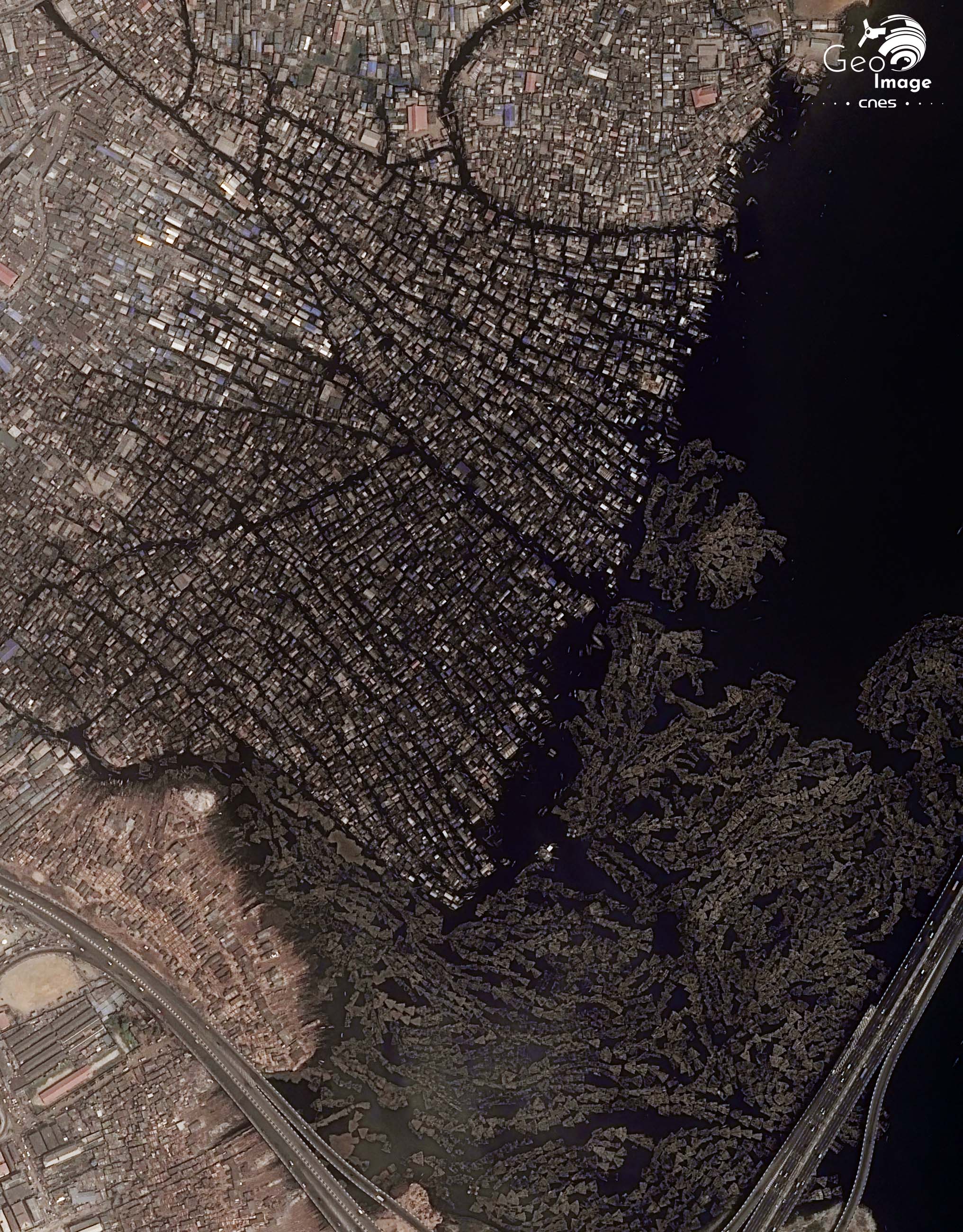 Cette image de la ville de Lagos, la plus grande ville du Nigéria, a été prise par un satellite Pléiades le 24 décembre 2018. Il s’agit d’une image en couleur naturelle, de résolution native à 0,70m, ré-échantillonnée à 0,5m.