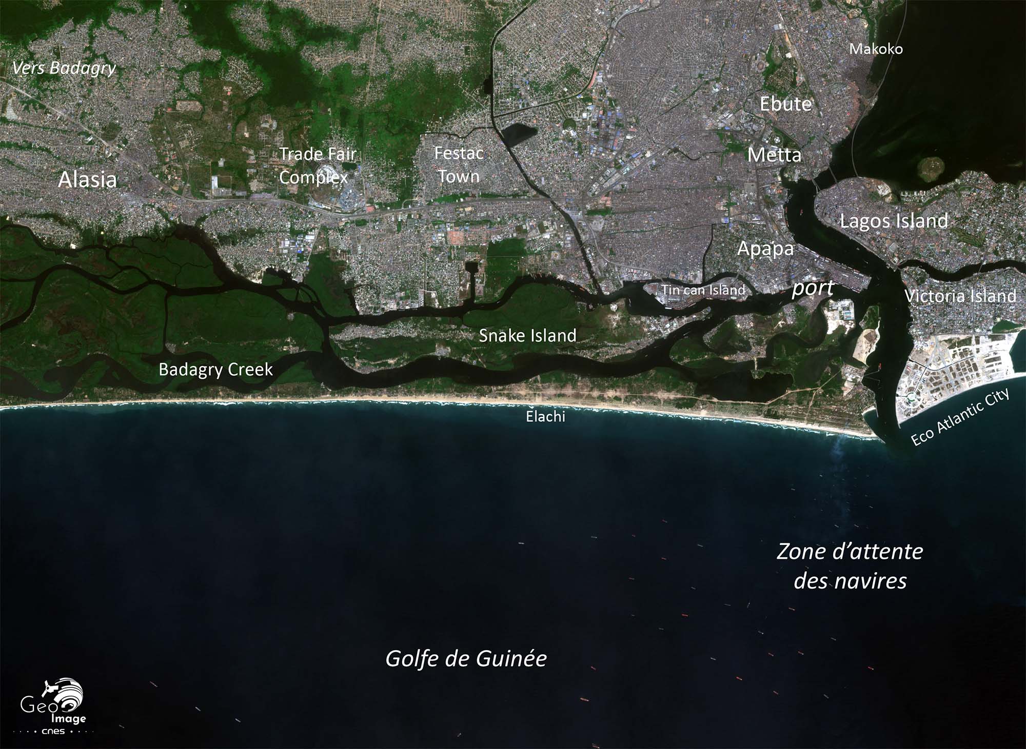 Au large de l’entrée du chenal d’accès au port, une vaste zone de stationnement maritime est dédiée au stationnement des navires en attente d’accès au port pour charger ou décharger leurs cargaisons. Sur le cordon littoral isolé des îles intérieures par la Badagry Creek, certaines portions (cf. Elachi) sont occupées par des résidences de luxe avec piscine, témoignant ainsi des profondes inégalités socio-spatiales qui organise l’agglomération.