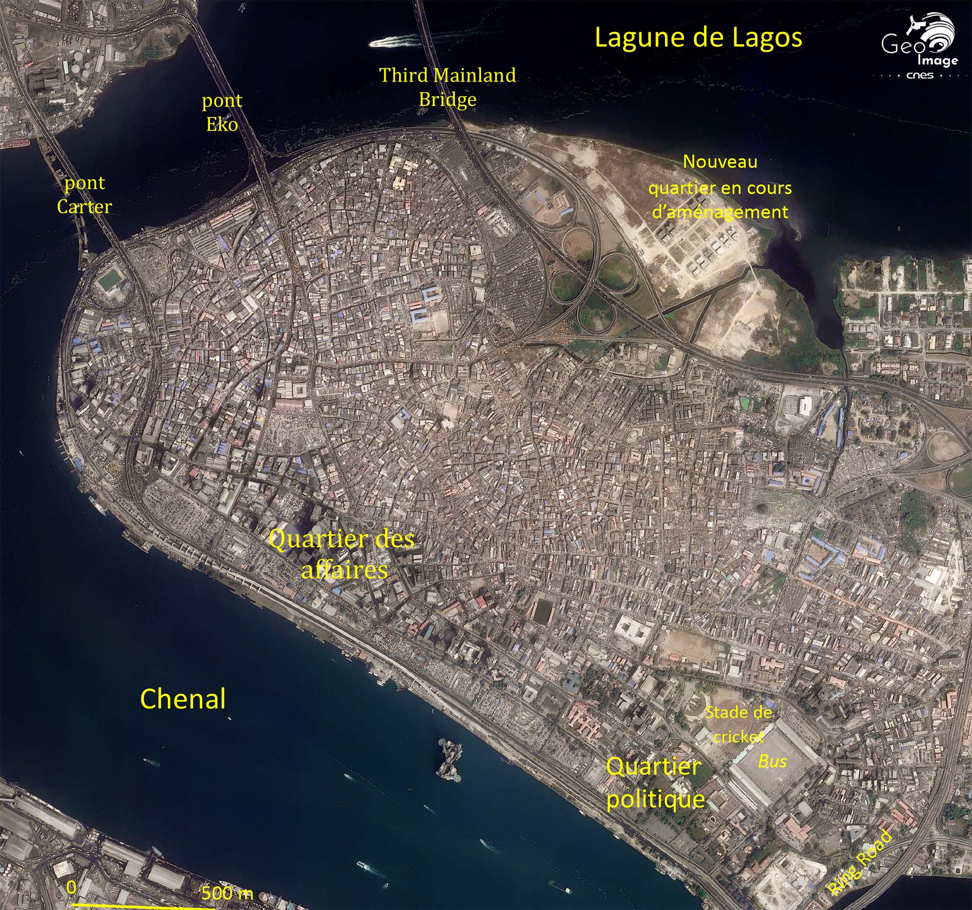 Priorité a été donnée au rattachement de Lagos Island au continent, comme en témoignent les trois ponts au nord de l’île : le pont Carter, le pont Eko et le Third Mainland Bridge). Un quatrième pont la relie à Victoria Island au sud. Cette vue de l’espace témoigne sur certaines portions des voies rapides et autoroutes de la densité des flux automobiles.