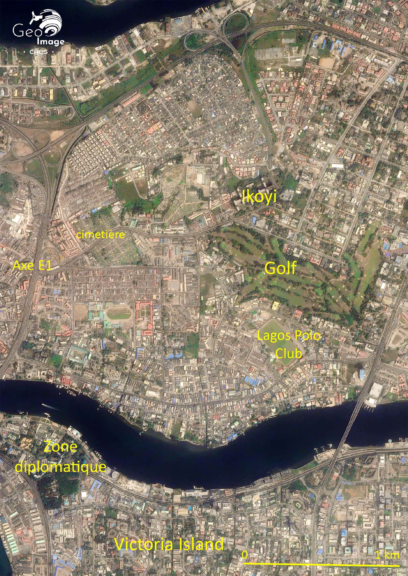 Enfin dans l’angle sud-ouest de l’image, la zone arborée de Victoria Island peut être considérée comme la « zone diplomatique », car si Lagos n’est plus la capitale politique, elles accueillent du fait de ses fonctions économiques et financières une vaste communauté d’expatriés. On retrouve sur un espace réduit de nombreuses ambassades ou consulats : Etats-Unis, Japon, Inde, Italie, Allemagne, Pays-Bas, Bulgarie, Liban, Émirats Arabes Unis, Russie...