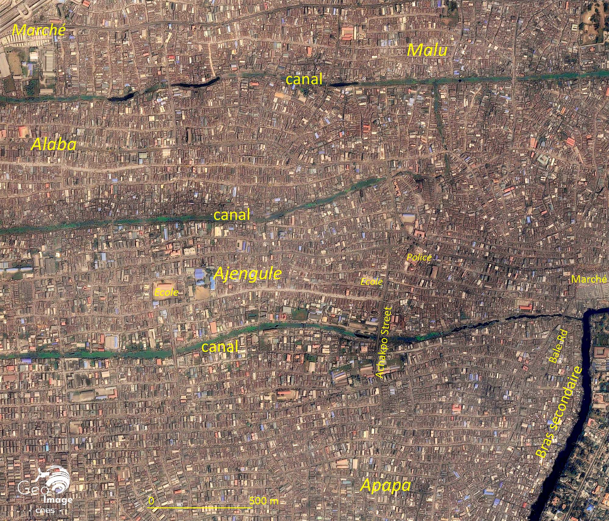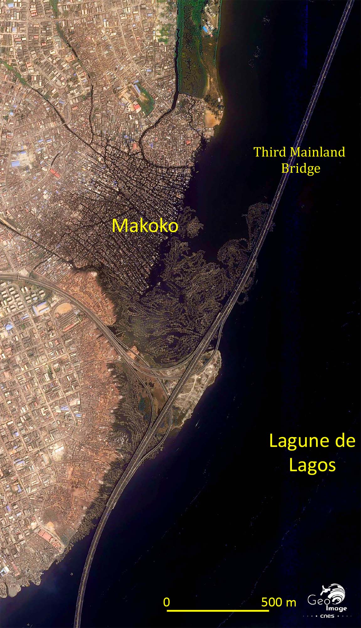 Le quartier se détache nettement sur l’image par la densité des constructions et l’étroitesse des rues et des canaux, dont la trame labyrinthique ressort sur le fond noir de la lagune. Ce paysage urbain marqué par la précarité des constructions et l’absence de planification urbaine contraste avec les quartiers formels - ou consolidés - voisins et avec le Third Mainland Bridge qui le surplombe.