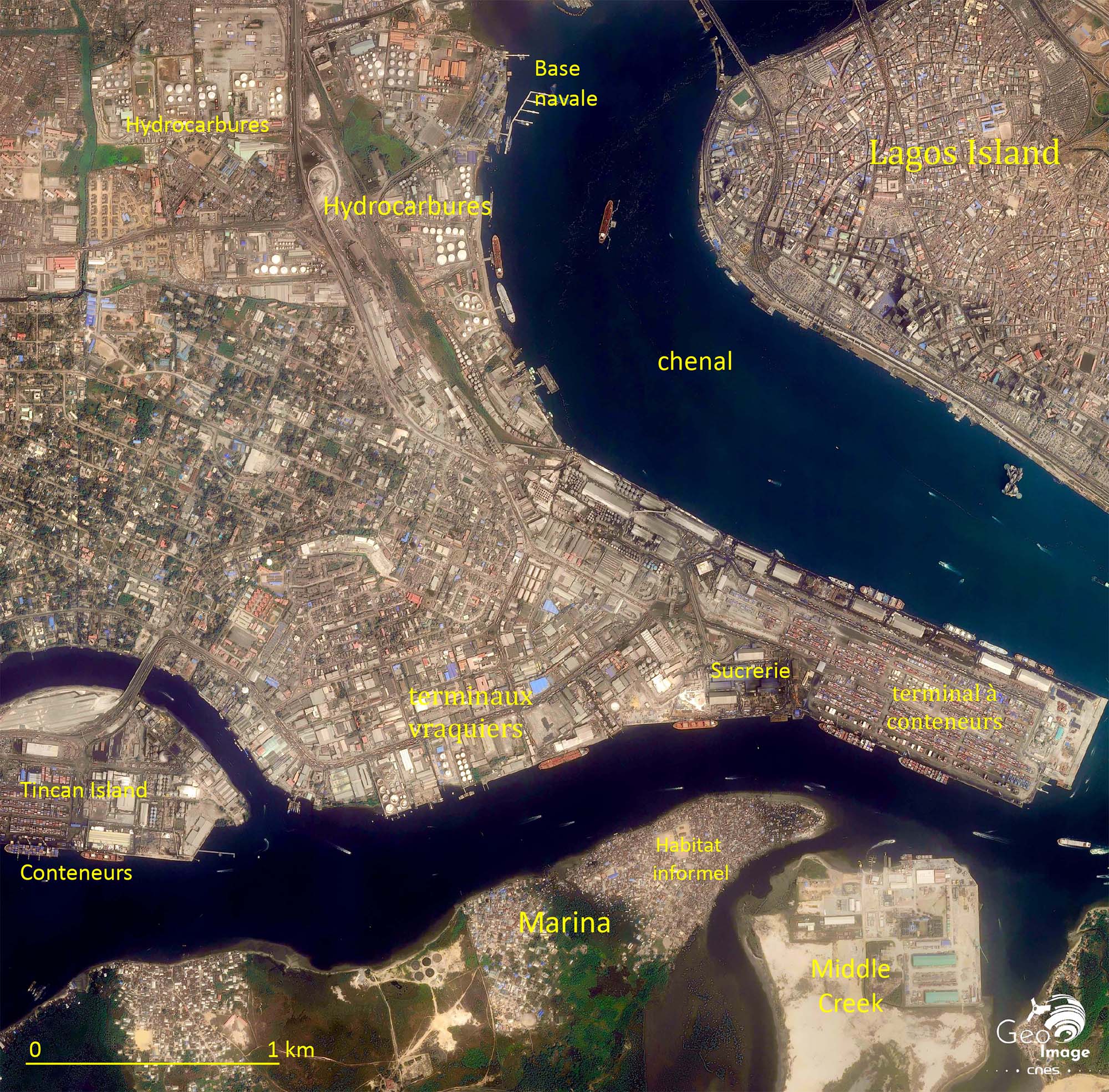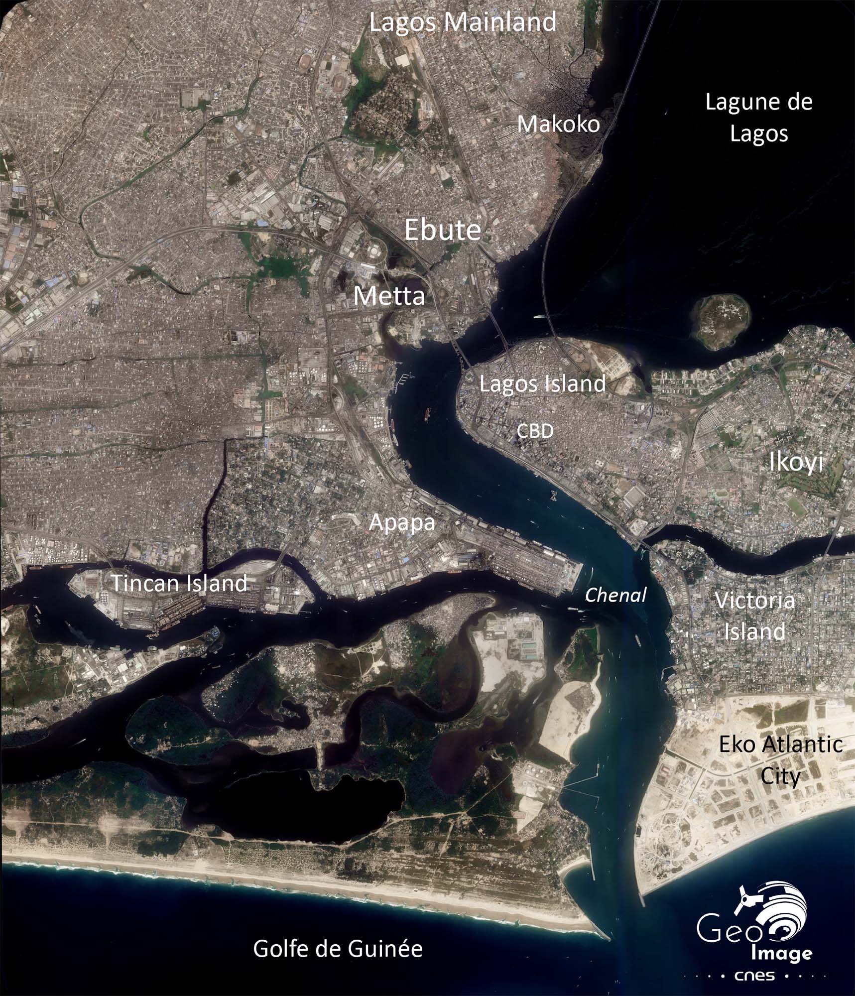 Néanmoins le développement de la ville et de son port n’a pu se faire qu’au prix d’aménagements importants permettant de surmonter les contraintes inhérentes à ce milieu lagunaire tropical : drainage des sols et rattachement de plusieurs îles au continent, comme dans le cas de Victoria Island, ancienne île située au sud de Lagos Island, rattachée à la péninsule de Lekki ; et artificialisation du chenal reliant la lagune à l’océan afin de lutter contre l’ensablement. On aperçoit d’ailleurs sur l’image les môles destinés à maintenir la navigabilité du chenal.
