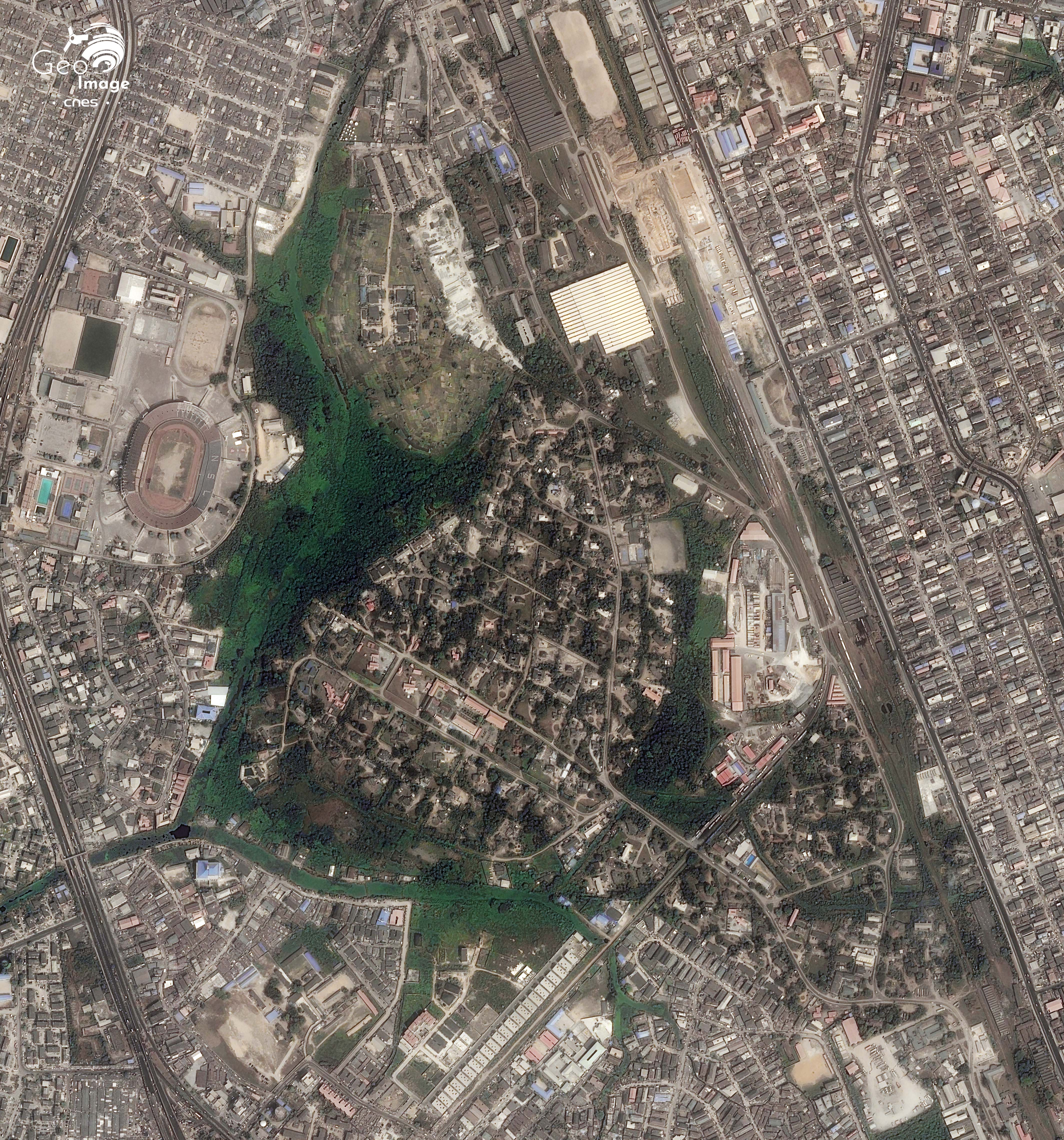 Dans cette marée urbaine se distinguent parfois des îlots comme celui d’Oke Ira bordé à l’est par le grand axe ferroviaire et l’Alagomeji Train Station et le grand centre commercial de Tejuoso (hors image). Face au National Stadium bien visible à l’ouest se déploie un îlot entouré et protégé par un espace lagunaire que le vert de la végétation rend bien visible. Le contraste urbain et architectural avec la densité des zones de lotissements à l’est ou au nord est frappant.