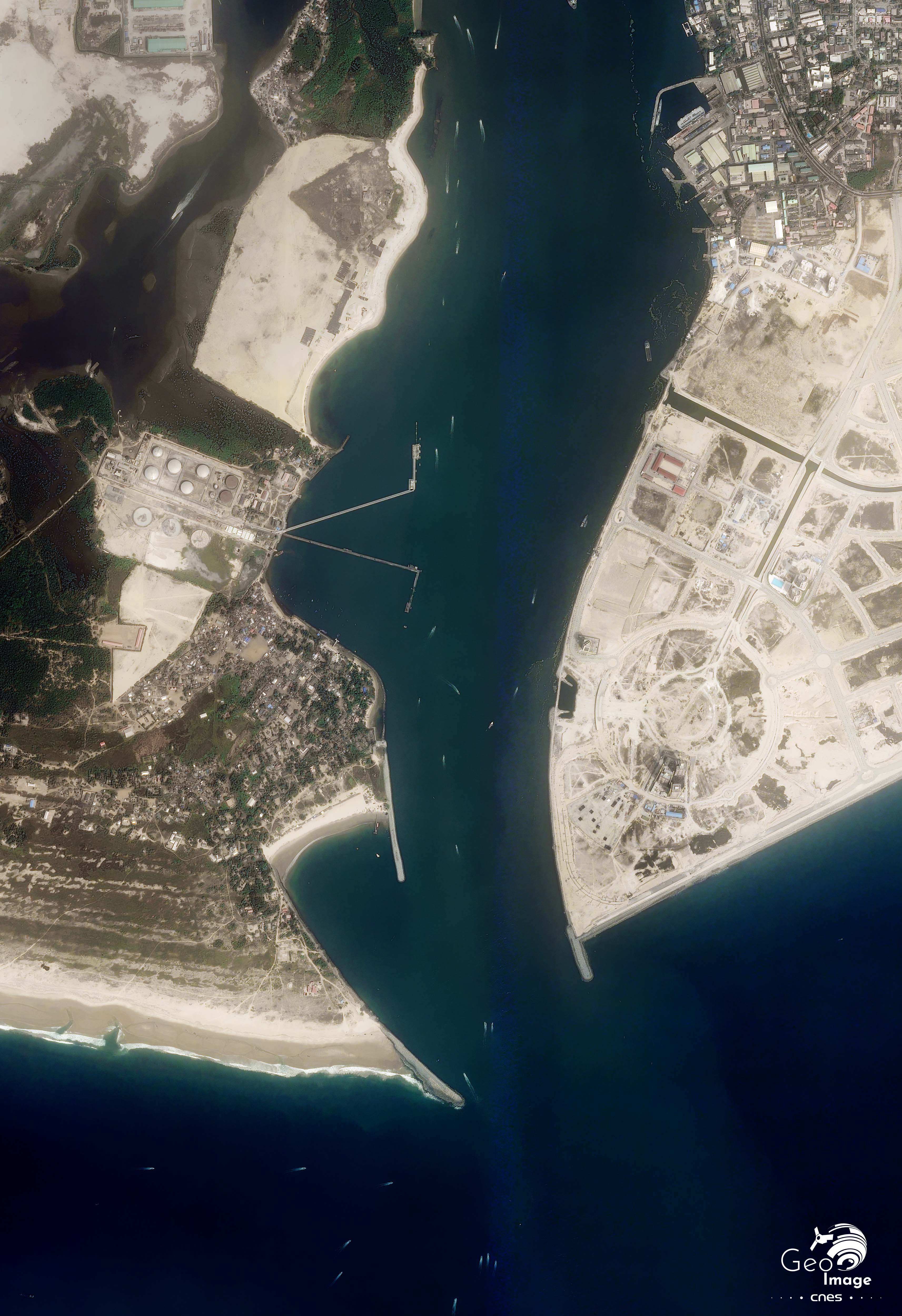 Ces deux images couvrent l’entrée de la puissance passe reliant la mer à la lagune de Lagos. Le trafic maritime est important, à l’image de la puissance de la mégapole et du pays. Les processus d’érosion/accumulation de chaque côté des môles et le différentiel de trajectoire entre chaque rive est bien visible.