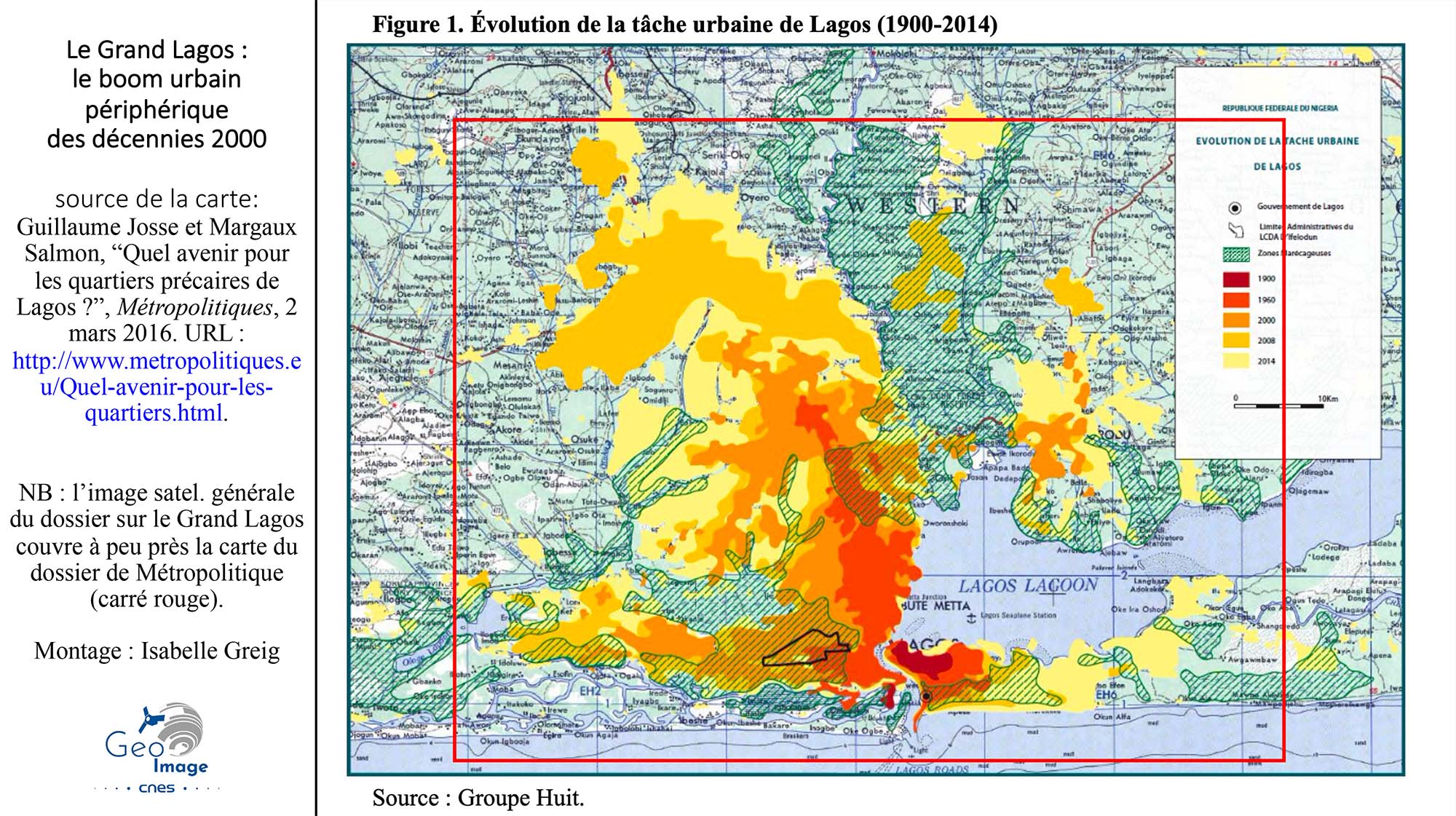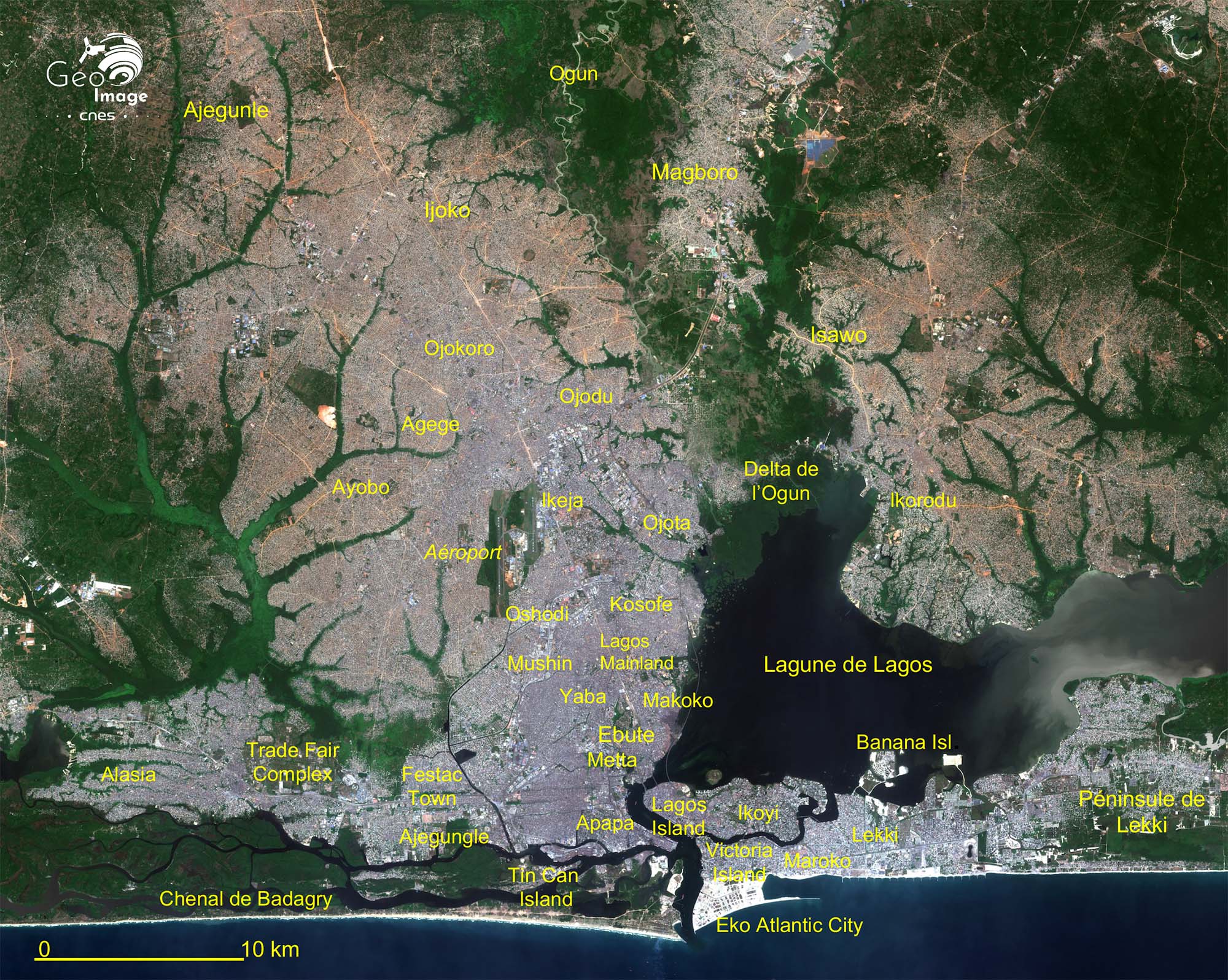 Au sud-ouest, l’urbanisation suit l’autoroute reliant Lagos au chapelet urbain littoral du Golfe de Guinée composé de Porto-Novo, Cotonou, Lomé, Accra et Abidjan. À une quinzaine de kilomètres de Lagos Island, Festac Town et Trade Fair Complex sont deux quartiers planifiés, reconnaissables à leur trame viaire géométrique ; on aperçoit sur l’image les cercles emboîtés de Trade Fair Complex. Ils témoignent d’une époque où le jeune État nigérian, non-aligné et fort de sa toute nouvelle rente pétrolière, voulait faire de Lagos une vitrine de la modernité africaine.