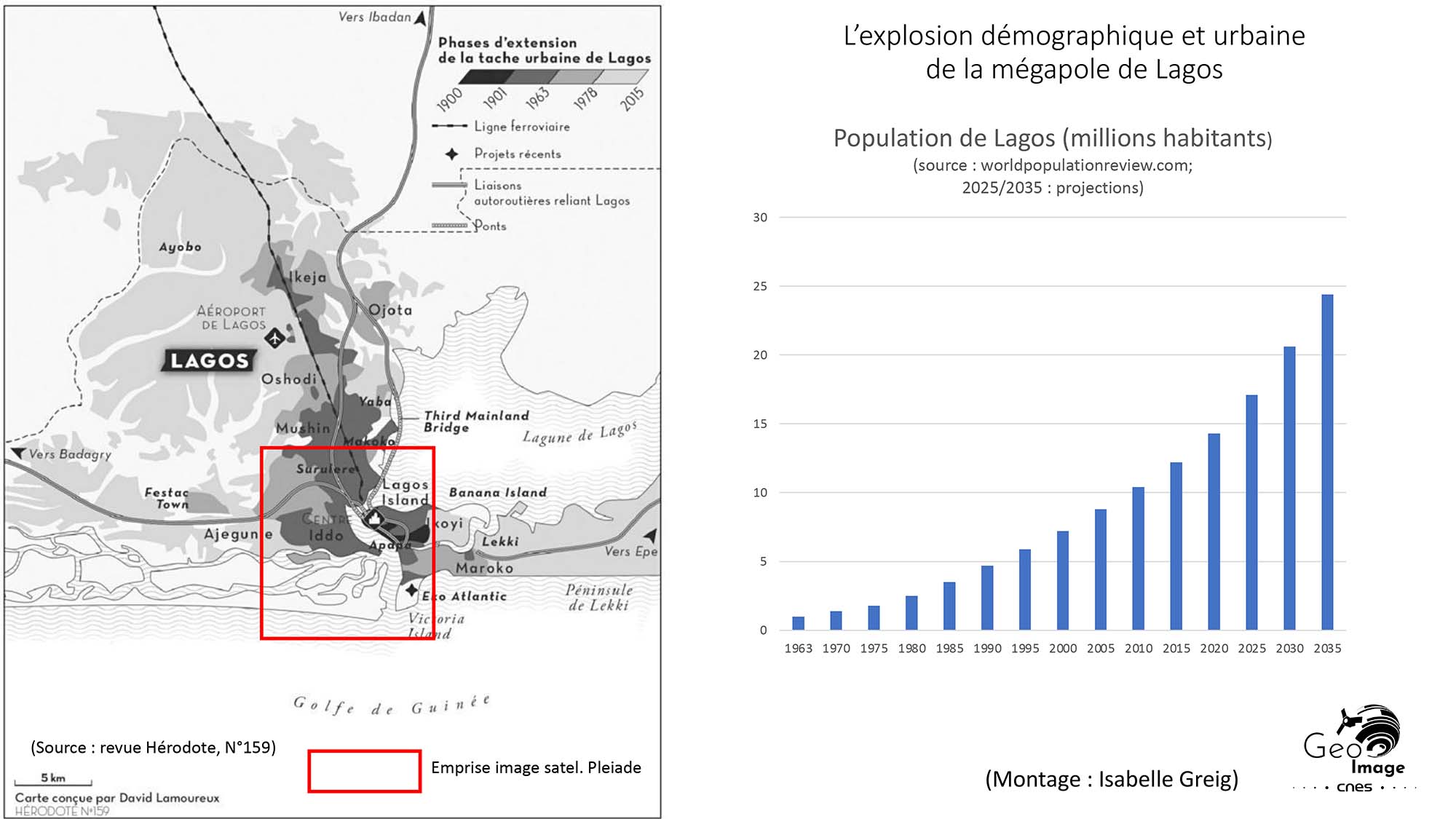 Avec une population estimée à plus de 20 millions d’habitants, Lagos, capitale économique du Nigéria et plus grande ville d’Afrique, appartient à la catégorie des mégapoles. S’il est parfois difficile de prendre la mesure, au sens propre, de cette métropole de l’informel, la ville fascine au-delà des frontières par le dynamisme de sa croissance démographique, par le succès continental de ses productions culturelles (Nollywood, l’industrie nigériane du film, serait la 2e du monde), autant que par ses paysages urbains spectaculaires et contrastés. Posée au bord d’une lagune des rives du Golfe de Guinée, l’immense agglomération lagotienne met environnement et société sous forte(s) tension(s) du fait de son dualisme interne et des inégalités socio spatiales exacerbées.
