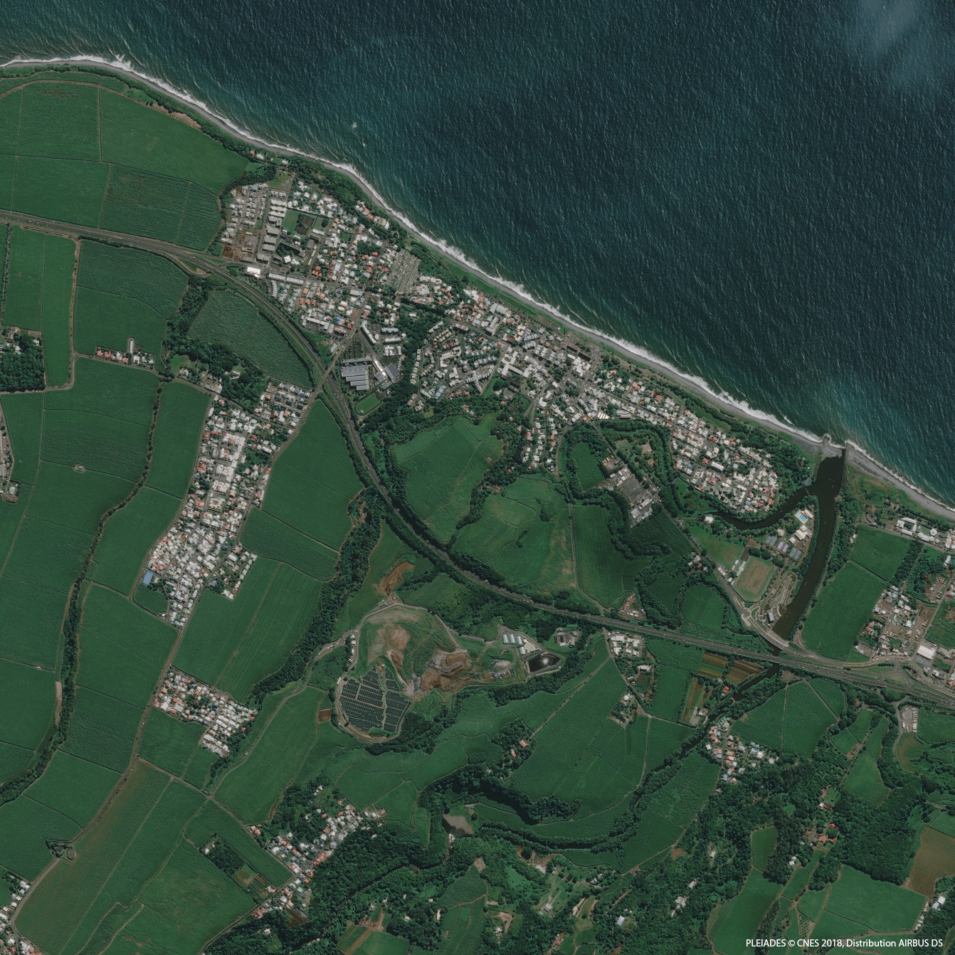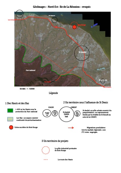 Par son apparente ruralité, la façade orientale de l’île de La Réunion offre au premier abord un contraste saisissant par rapport à la face occidentale, à seulement 60 km de distance. Cependant le développement insulaire récent tend à estomper ce qui faisait toute la singularité de ce paysage et du mode de vie de ses habitants. Cela est particulièrement visible à St André, plus proche de St Denis, où la canne à sucre, monoculture historique, subit les assauts de l’explosion urbaine. L’image court de Ste Marie (vue partielle au nord-ouest), englobée dans l’aire urbaine de St Denis) à Bras-Panon (au sud-est), qui fait partie, avec St André, principale agglomération visible, de la CIREST.