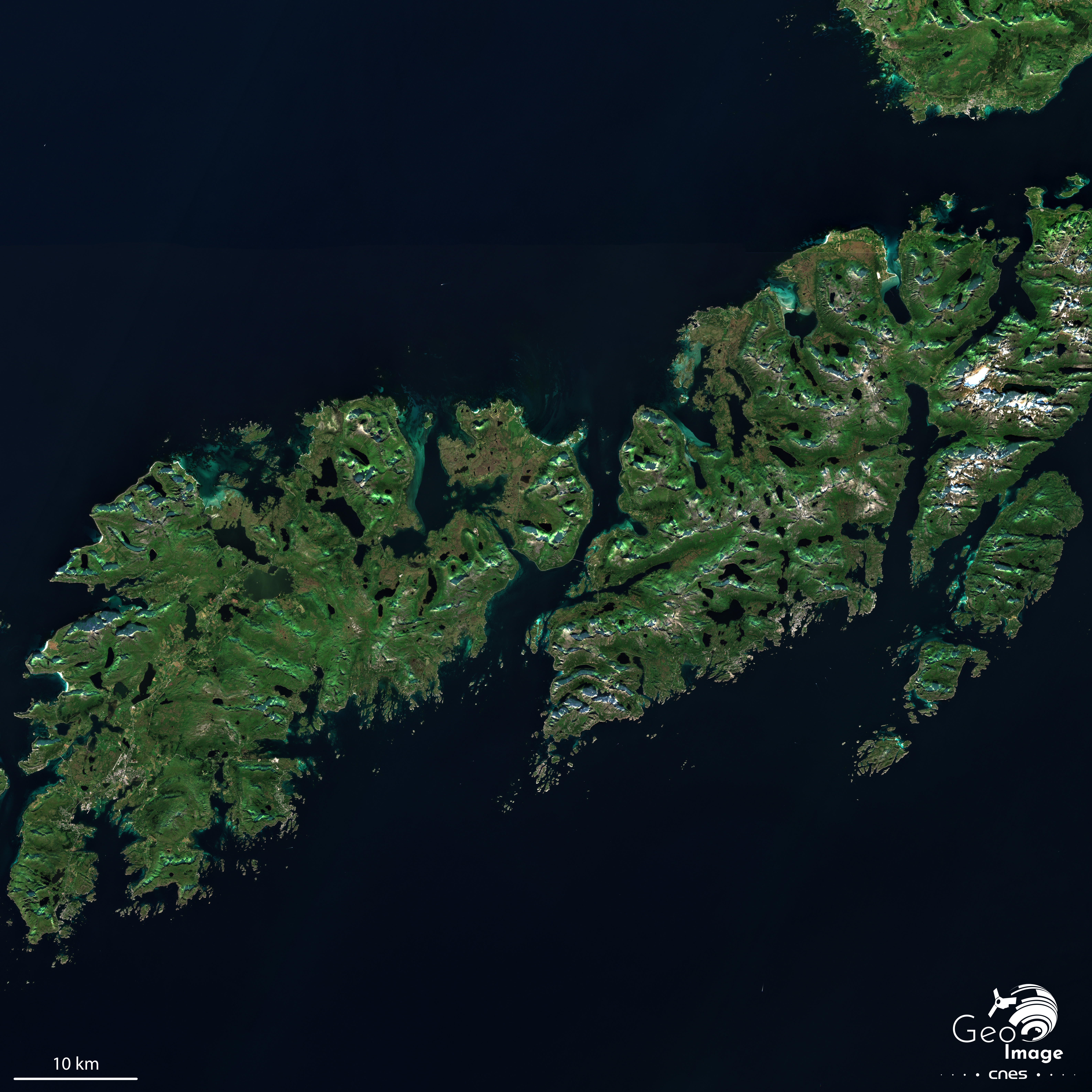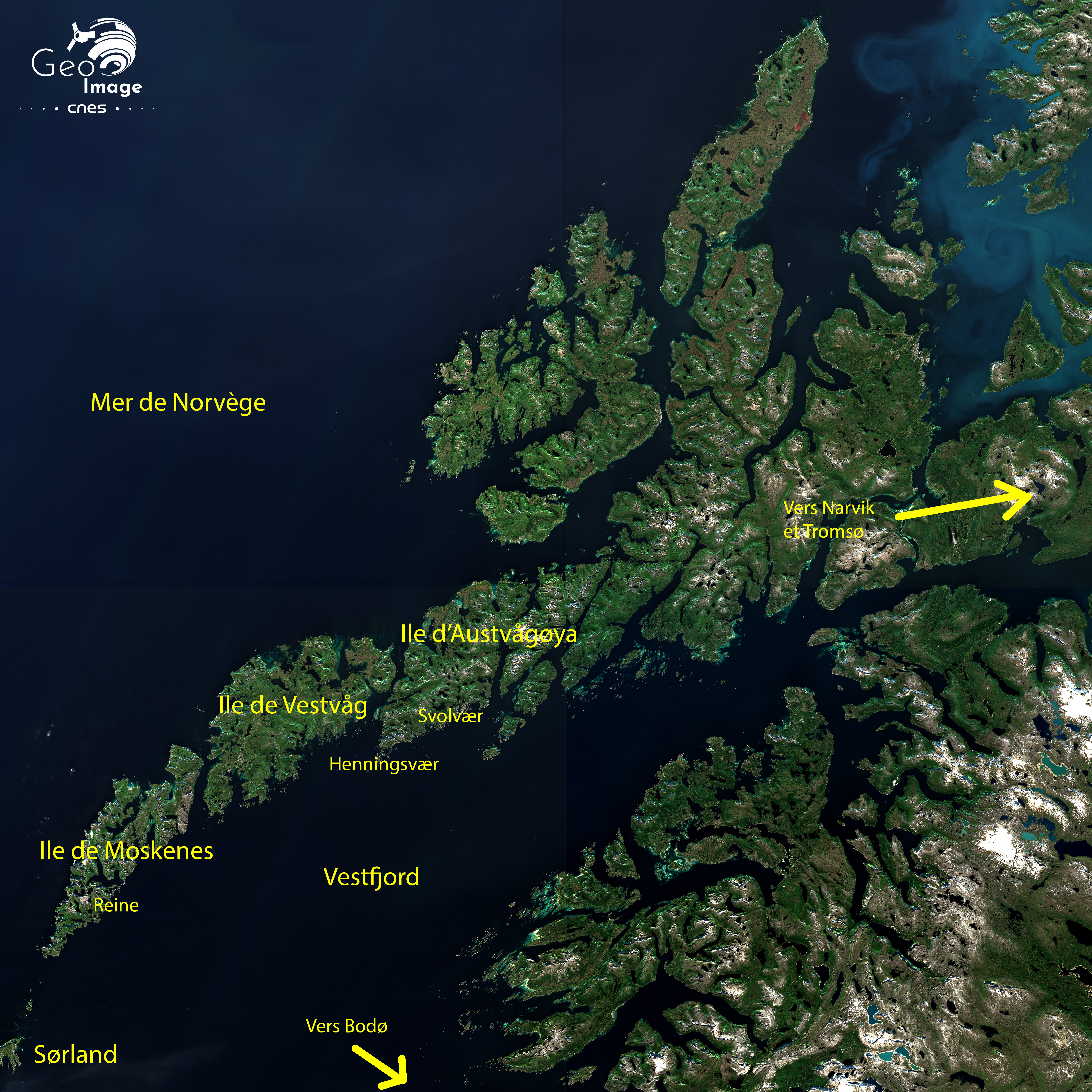 Ci-contre, l'image satellite issue de Sentinel-2A, contient quelques repères géographiques de l'archipel des Lofoten, entre la mer de Norvège et le Vestfjord :