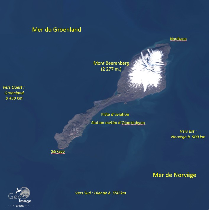 En plein océan Nord-Atlantique aux limites entre les mers de Norvège et du Groenland, l’image nous présente l’île Jan Mayen. Sous souveraineté norvégienne, elle se trouve cependant très loin de la Norvège : les terres les plus proches, les îles Lofotens, sont à plus de 900 km vers l’est. Rattaché administrativement au comté norvégien du Nordland, ce territoire insulaire est donc très excentré.