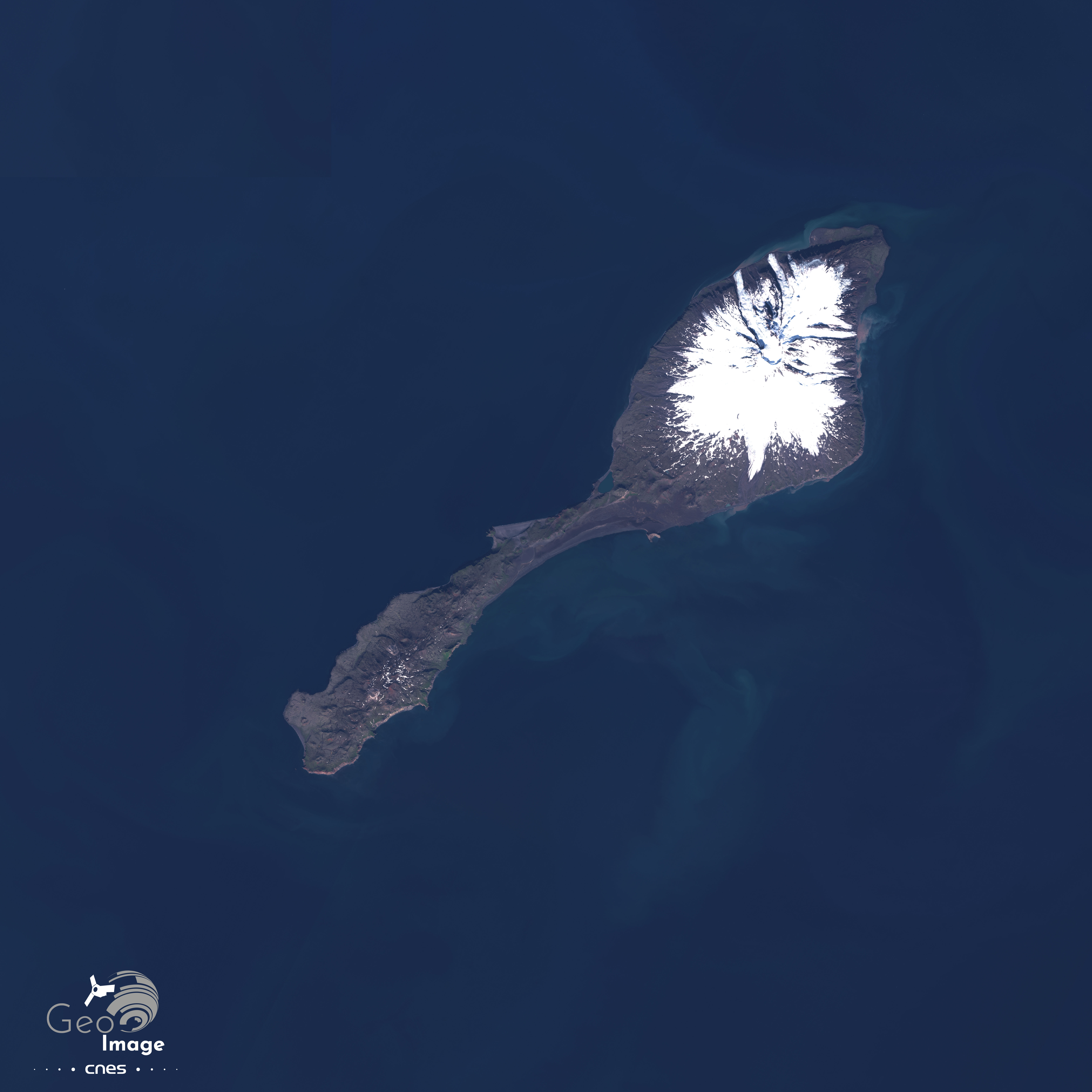 Comme le montre l’image, l’île ne porte quasiment aucune végétation en dehors d’une basse toundra dans les endroits les mieux protégés. Bien que prise début août, donc en plein été, les hauteurs méridionales portent encore des traces de névés. Nous sommes en effet ici très au nord à 70°55 de latitude Nord, bien au delà du cercle polaire arctique (66°33), et à 8°42 de longitude Ouest. Disposer d’une telle image bien claire et dégagée a été difficile car l’île est le plus souvent couverte de nuages et de brouillards, ce qui en rend d’ailleurs l’abordage parfois très dangereux.