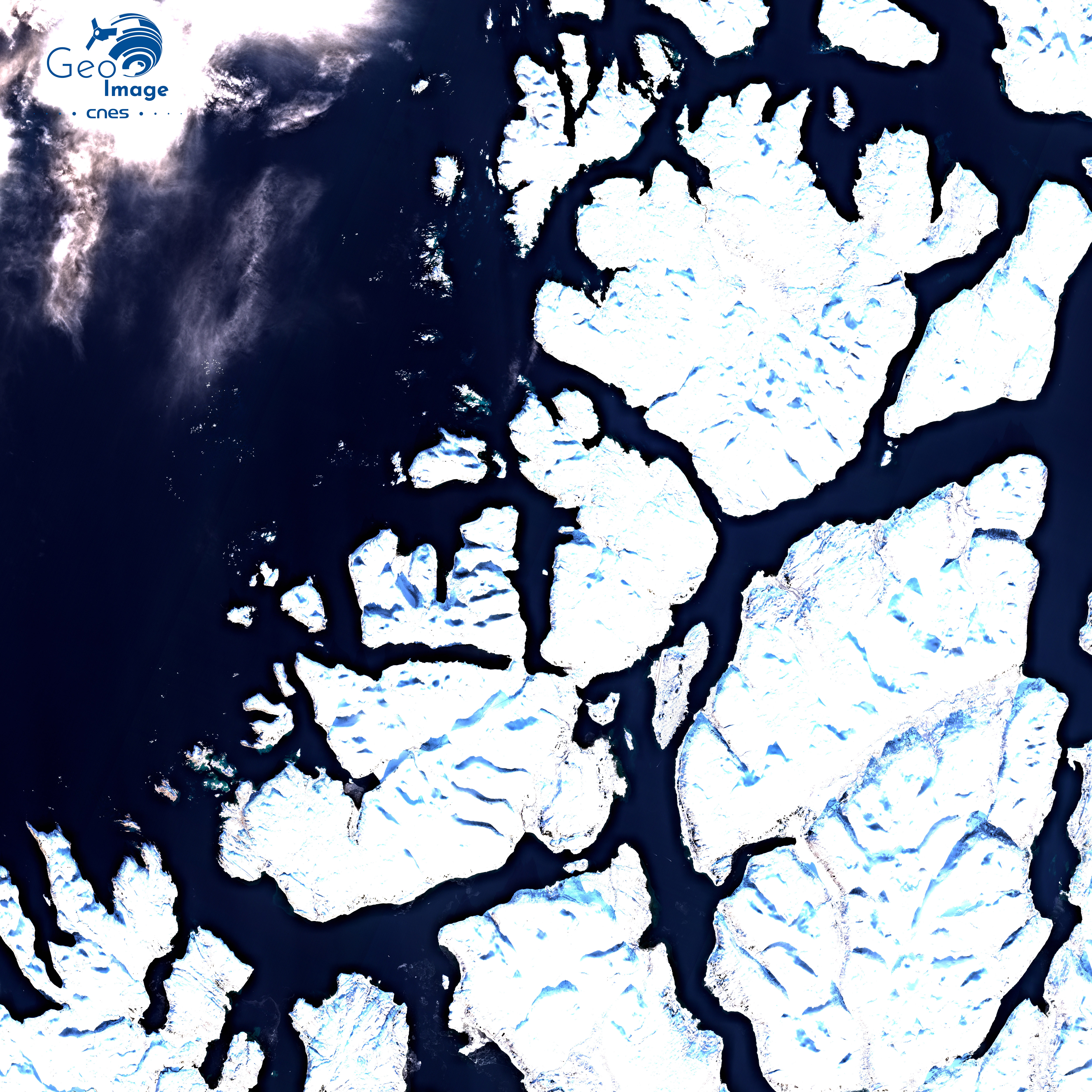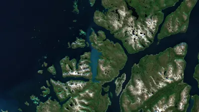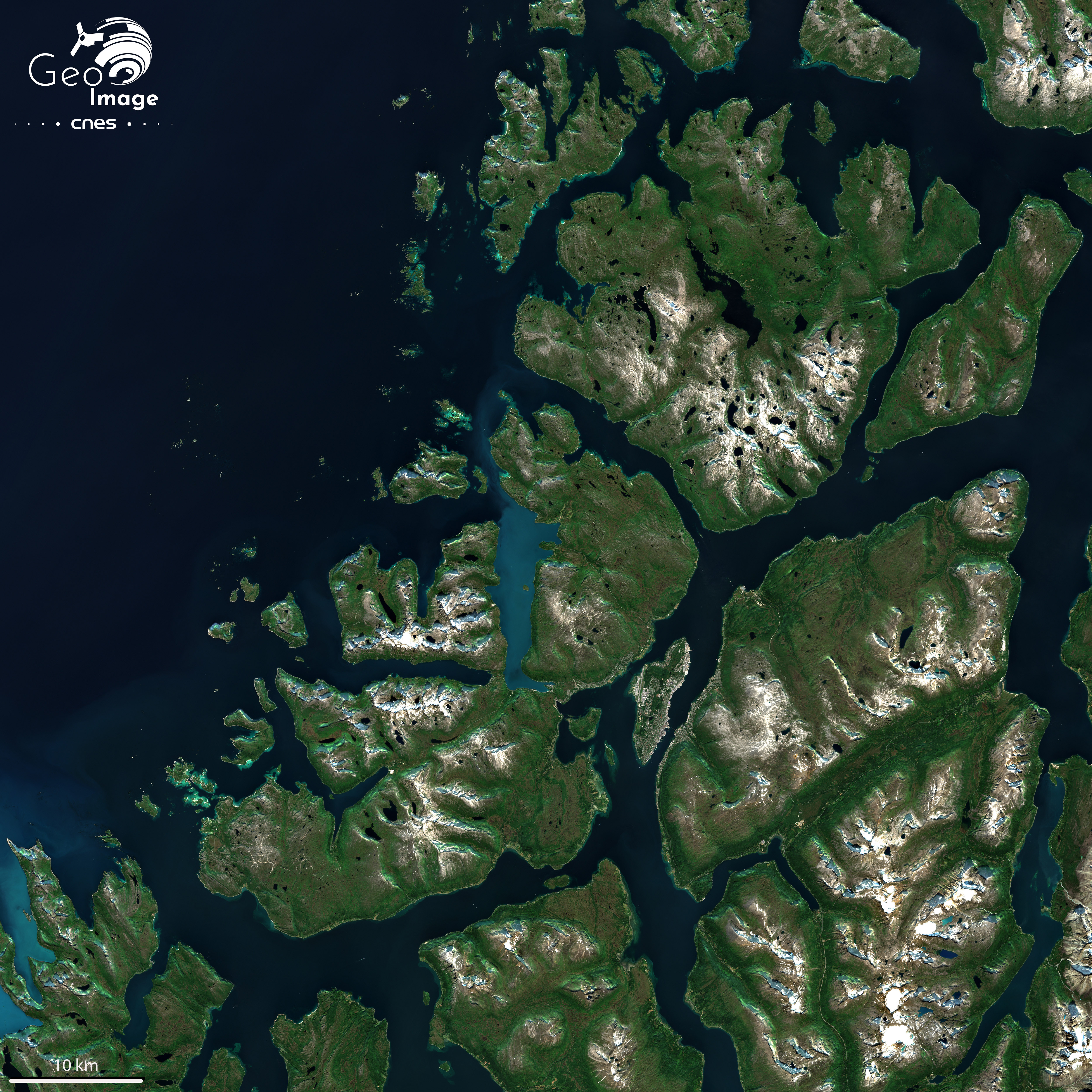 L’image nous montre une petite île au milieu d’un fjord protégée de la mer de Norvège par une succession d’îles de taille beaucoup plus importante qui se découpent en direction de l’ouest. L’île est entourée de montagnes qui sont encore couvertes de neige alors que l’image a été prise au plus fort de l’été, au mois de juillet. En direction de la mer, cette côte à fjord, terme désignant une ancienne vallée glaciaire envahie par la mer, est très découpées par un vaste semi de vallées très encaissées. Le tout aboutit à un vaste pavage d’îles de taille très différentes, mais souvent considérables, notamment l’île de Kvaløya, à l’ouest de l’île de Tromsøya où se situe la ville de Tromsø.