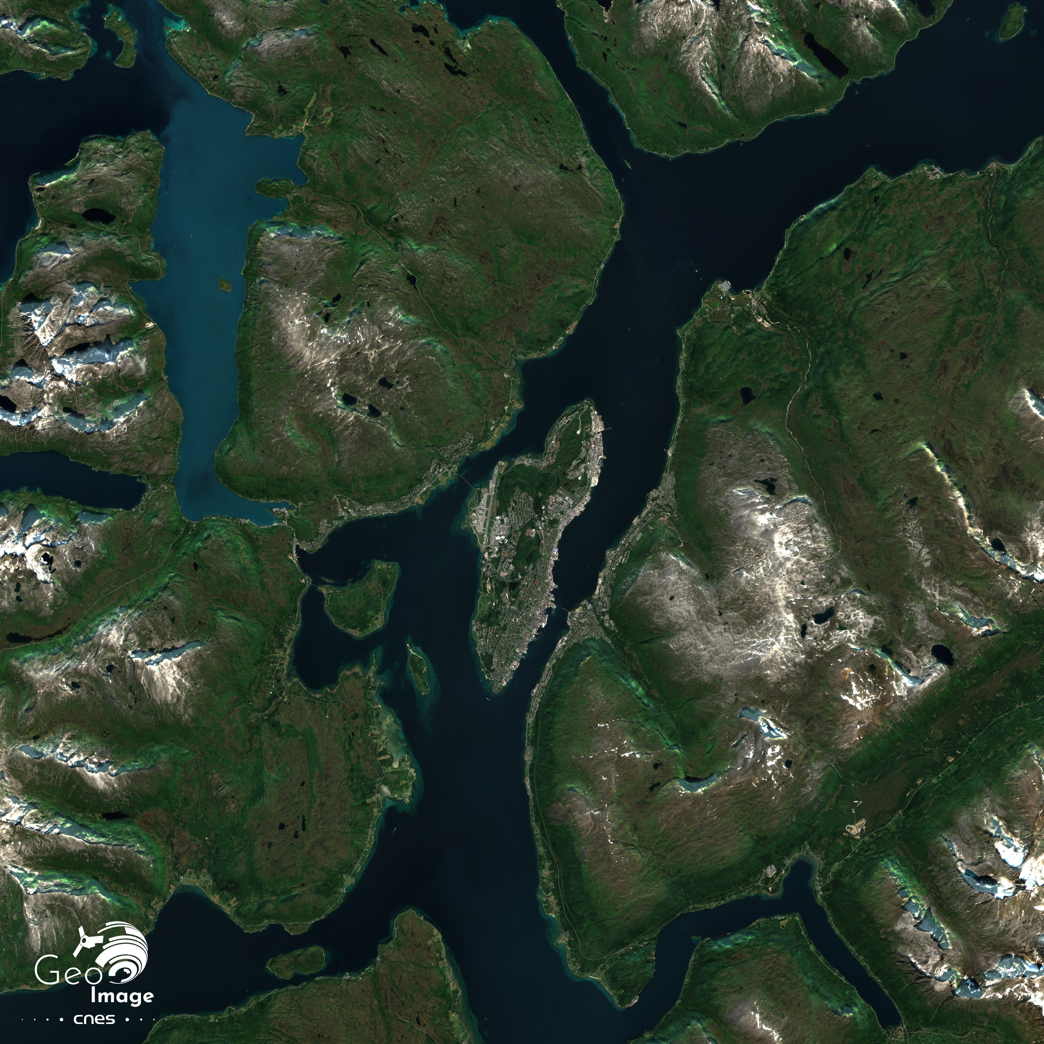 Tromsø compte 75 000 habitants et l’image montre un peuplement relativement dense sur la façade est de l’île. La banlieue s’étend de part et d’autre de l’île, sur l’île de Kvaløya à l’ouest, sur le continent à l’est. On distingue, de part et d’autre, un pont pour relier l’île à ces deux terres. Ailleurs, le peuplement est très diffus, voire inexistant. On distingue très peu d’infrastructures, sinon quelques routes. A proximité de Tisnes et Straumsbukta, on peut distinguer la présence de champs, suggérant une activité agricole estivale, mais qui reste limitée.