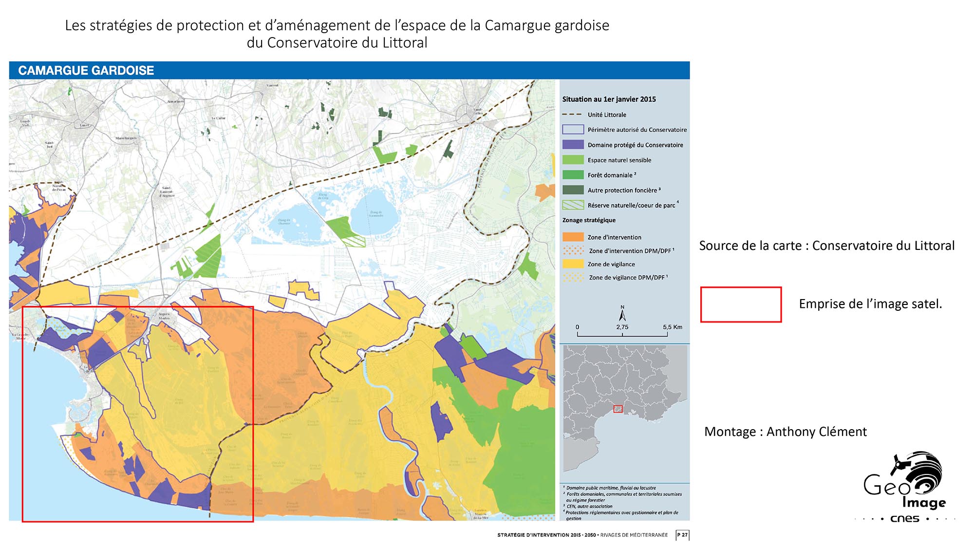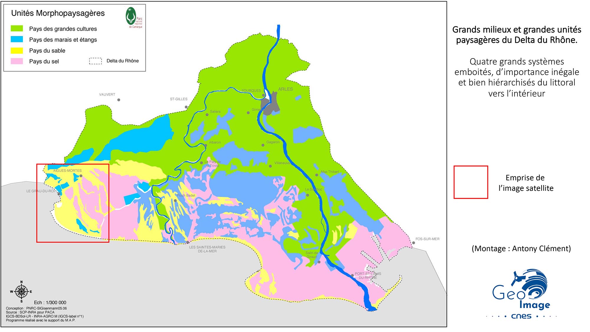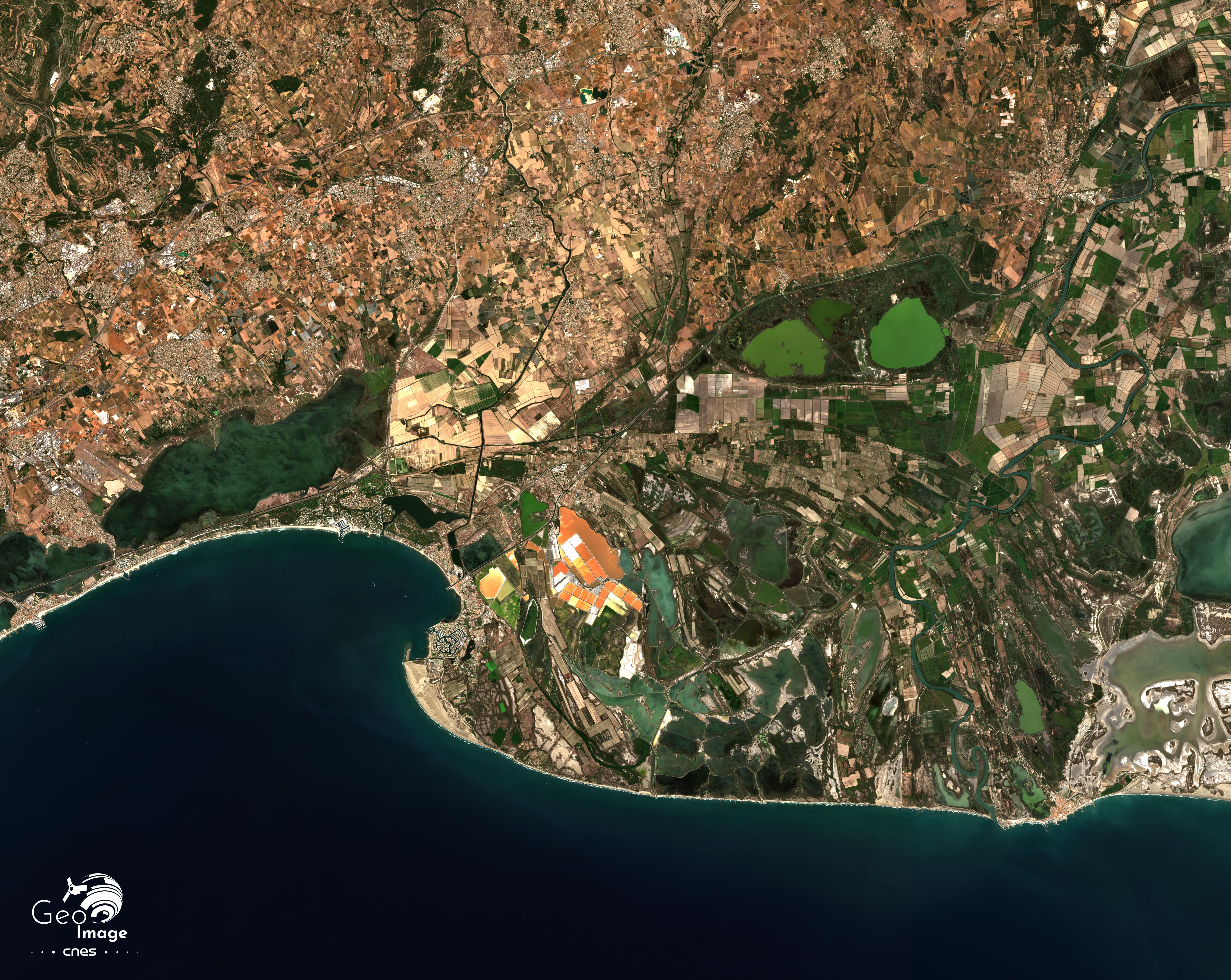 L’interface entre terre et mer se matérialise ici sur l’image par un paysage singulier. Vu de satellite, l’espace étudié laisse apparaître des formes et des couleurs très diverses, héritées de dynamiques naturelles et d’actions anthropiques. A l’exploitation ancienne du sel s’est ajoutée une mise en tourisme qui a intensément transformé le littoral et l’arrière-pays. Les pressions exercées sur ce milieu rendent d’autant plus vive sa protection, afin de concilier usages économiques et préservation d’écosystèmes à l’équilibre fragile.