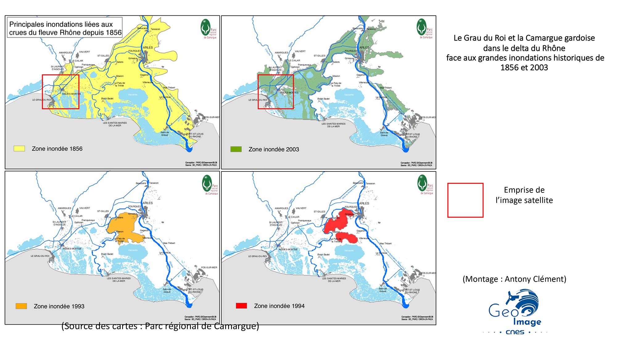 Un immense delta construit par le Rhône. Cette image couvre l’Ouest de l’immense delta du Rhône. Nous sommes bien ici en bassin méditerranéen où le rapport entre les grands fleuves et la mer repose sur de grands deltas fluviaux construits par de puissantes dynamiques d’accumulations sédimentaires pour des raisons climatiques et morphologiques spécifiques : Guadalquivir, Èbre, Rhône, Pô, Vardar, Nil...