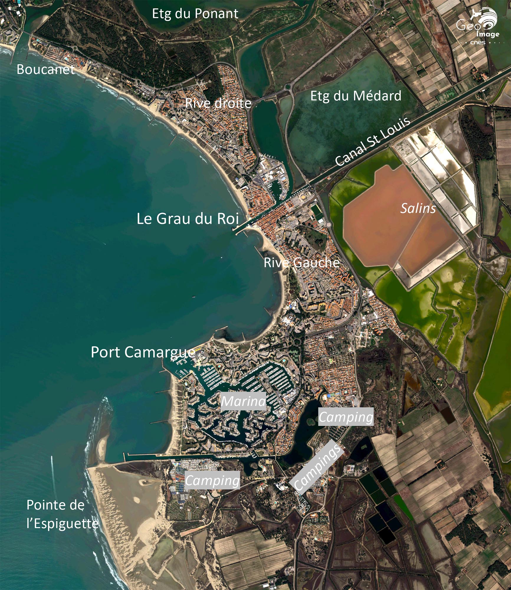 La commune du Grau-du-Roi occupe la partie Ouest de l’image. Il s’agit d’un ancien village de pêcheurs, situé sur un grau, devenu station balnéaire au cours des années 1960 à la faveur du tourisme de masse. La commune accueille aujourd’hui plus de 8.500 habitants à l’année, la population croissant fortement pendant la période estivale. L’objectif de la mission d’aménagement mise en place en 1963 par le général de Gaulle (mission Racine) était de capter les flux de touristes longeant la côte languedocienne en direction de l’Espagne. L’aménagement du littoral a donné naissance à des stations balnéaires ex-nihilo - Port Leucate, Le Cap d’Agde, Port Camargue... - et la transformation de villages comme Le Grau-du-Roi.