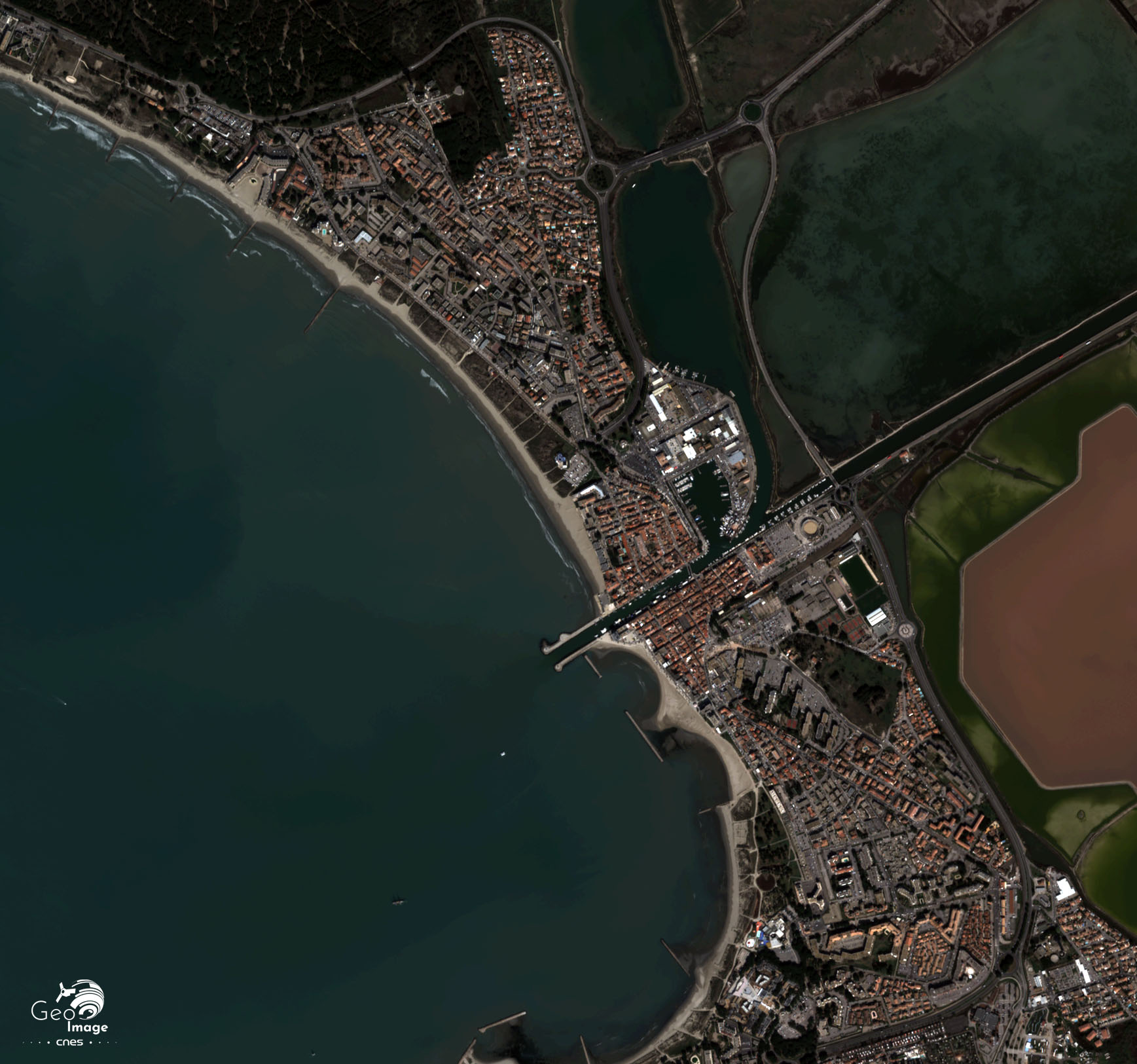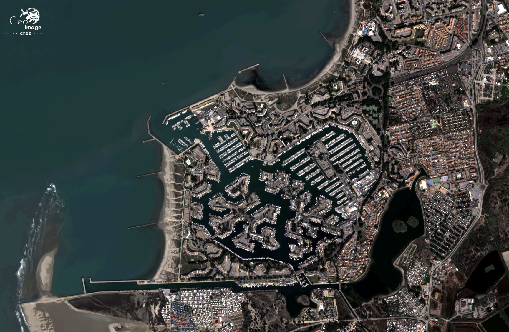 Cette image du Grau-du-Roi en Petite Camargue, a été prise par un satellite Pleiades le 23 mars 2022. Il s’agit d’une image en couleur naturelle, de résolution native à 0,70m, ré-échantillonnée à 0,5m.