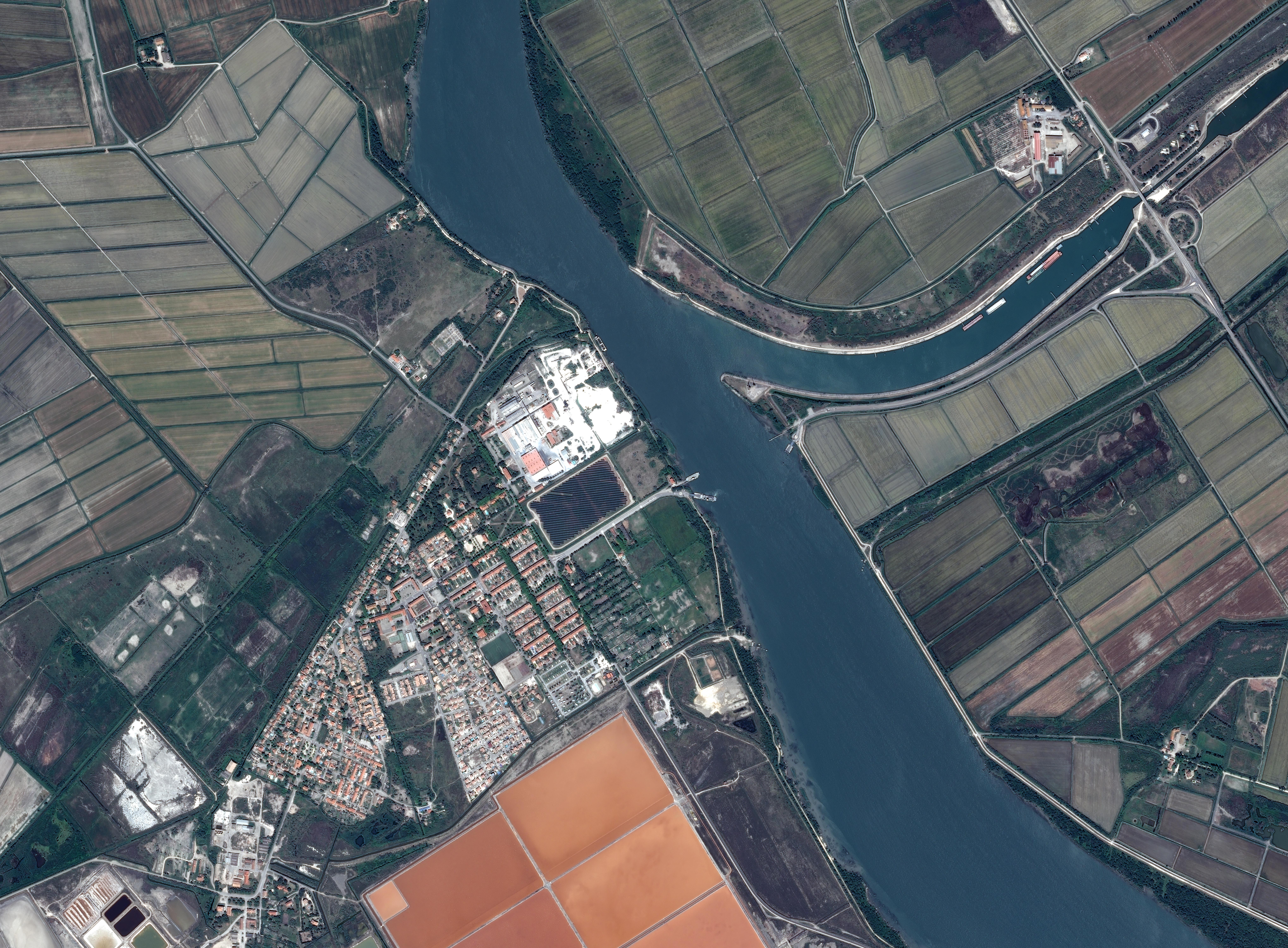 Au centre de l’image le Rhône, encadré par de hautes digues du fait de la puissance de ses crues, alimente les espaces agricoles autour, ce que l’on voit par les nombreux canaux. Ces dizaines de canaux permettent la culture du riz de Camargue qui dispose d’une IGP. Ces rizières, très rectangulaires, sont créées dès le XIXème siècle. Elles limitent alors les crues du Rhône. La production du riz a continué, notamment par le recours à de la main-d'œuvre étrangère d’Indochine et d’Italie aux conditions de travail longtemps très difficiles. Des activités de tourisme vert se développent au travers de mas transformés en gîtes et une voie cyclable longe la rive gauche du Rhône, elle permet de relier Lyon à la Camargue, c’est la ViaRhôna.
