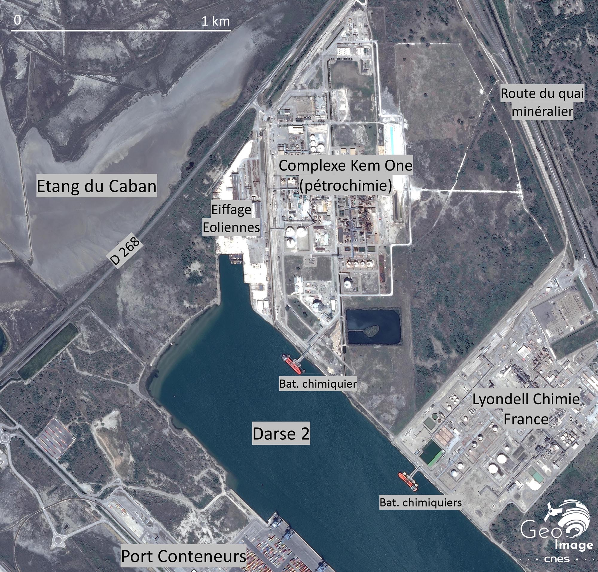 Pourtant, la vocation de Fos reste encore largement centrée sur l’industrie chimique et pétrolière ce que montre ici les usines de Kem one qui produisent de la soude, du chlore et de l’hydrogène. Plus bas, LyondellBasell, groupe mondial de chimie américain, produit de l’oxyde de propylène (PO) pour les sièges automobiles notamment.