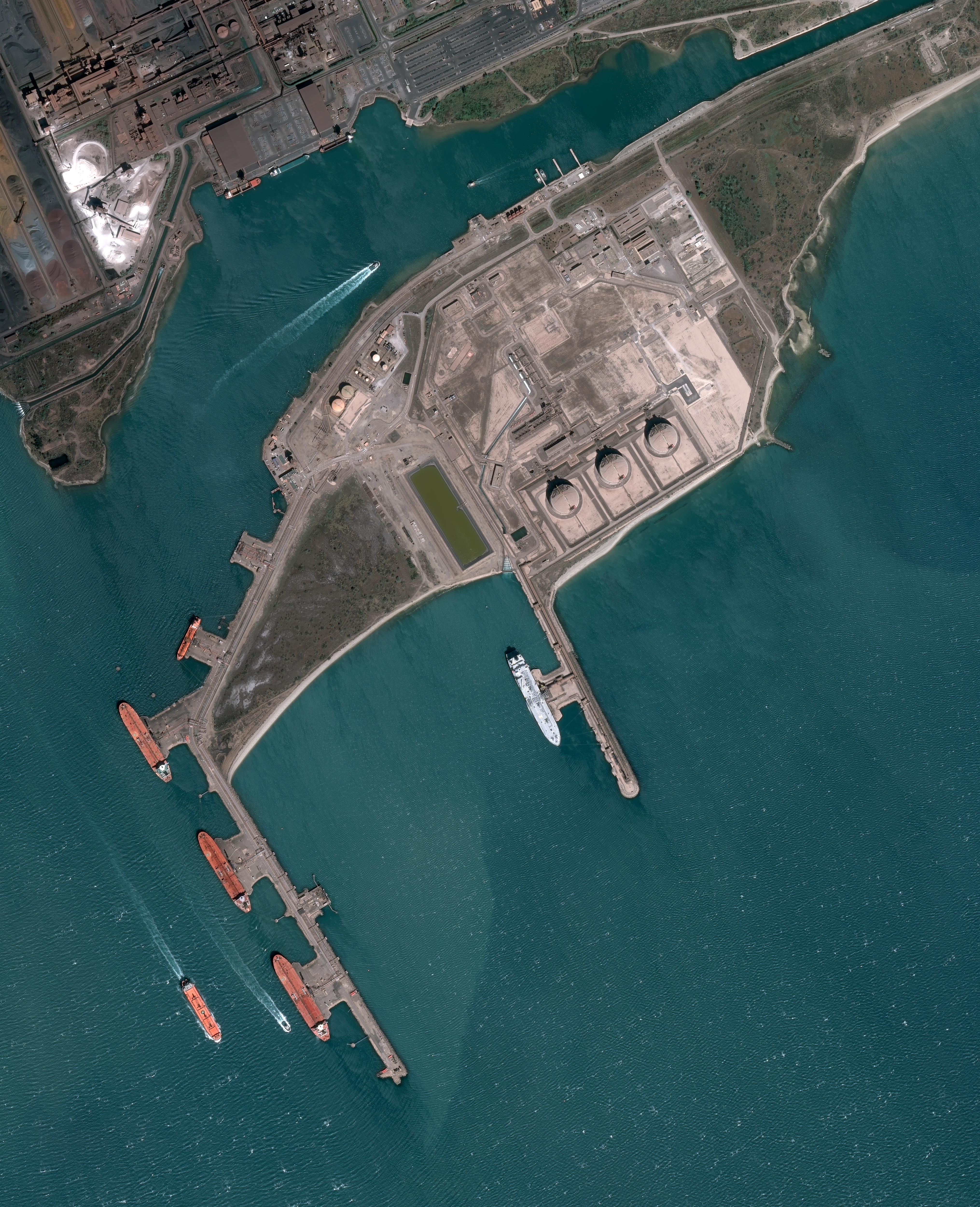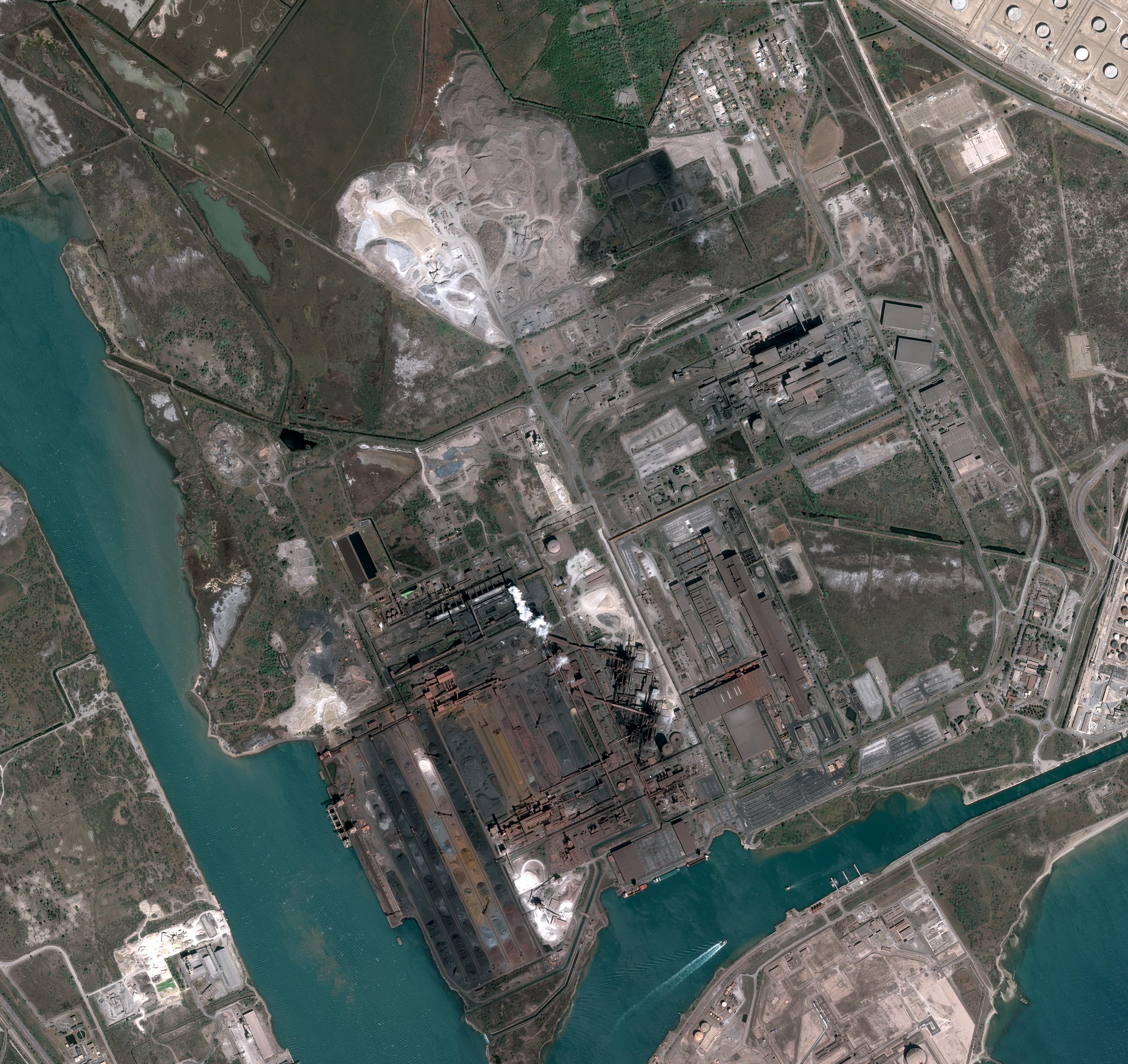 L’acier est fonc transformé en produits plats laminés par les hauts fourneaux et laminoirs, situés au centre de l’image pour produire des bobines visibles sur le quai de la darse sud face au terminal pétrolier. Ces milliers de bobines servent pour l’automobile, l’électroménager ou les emballages.