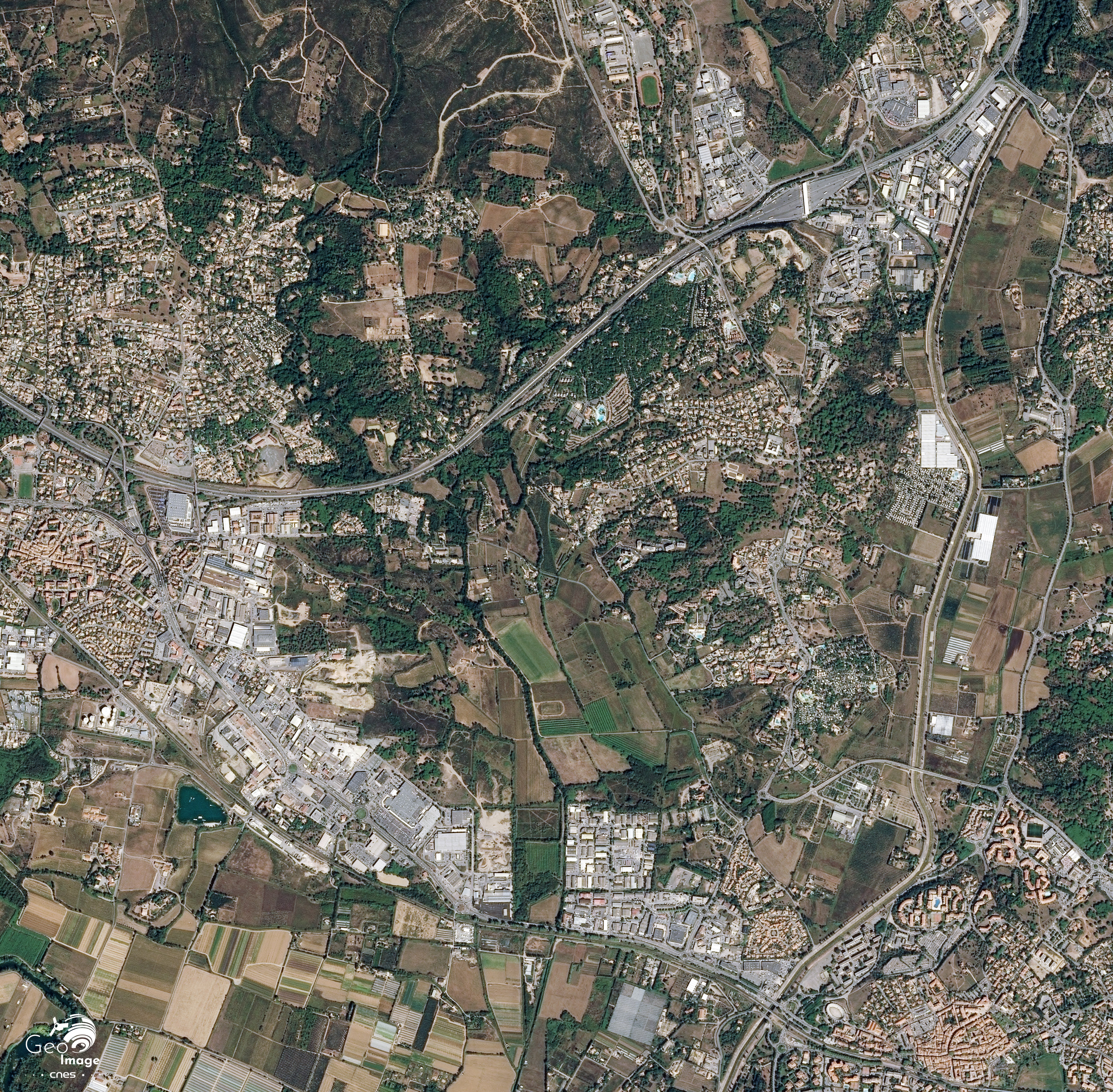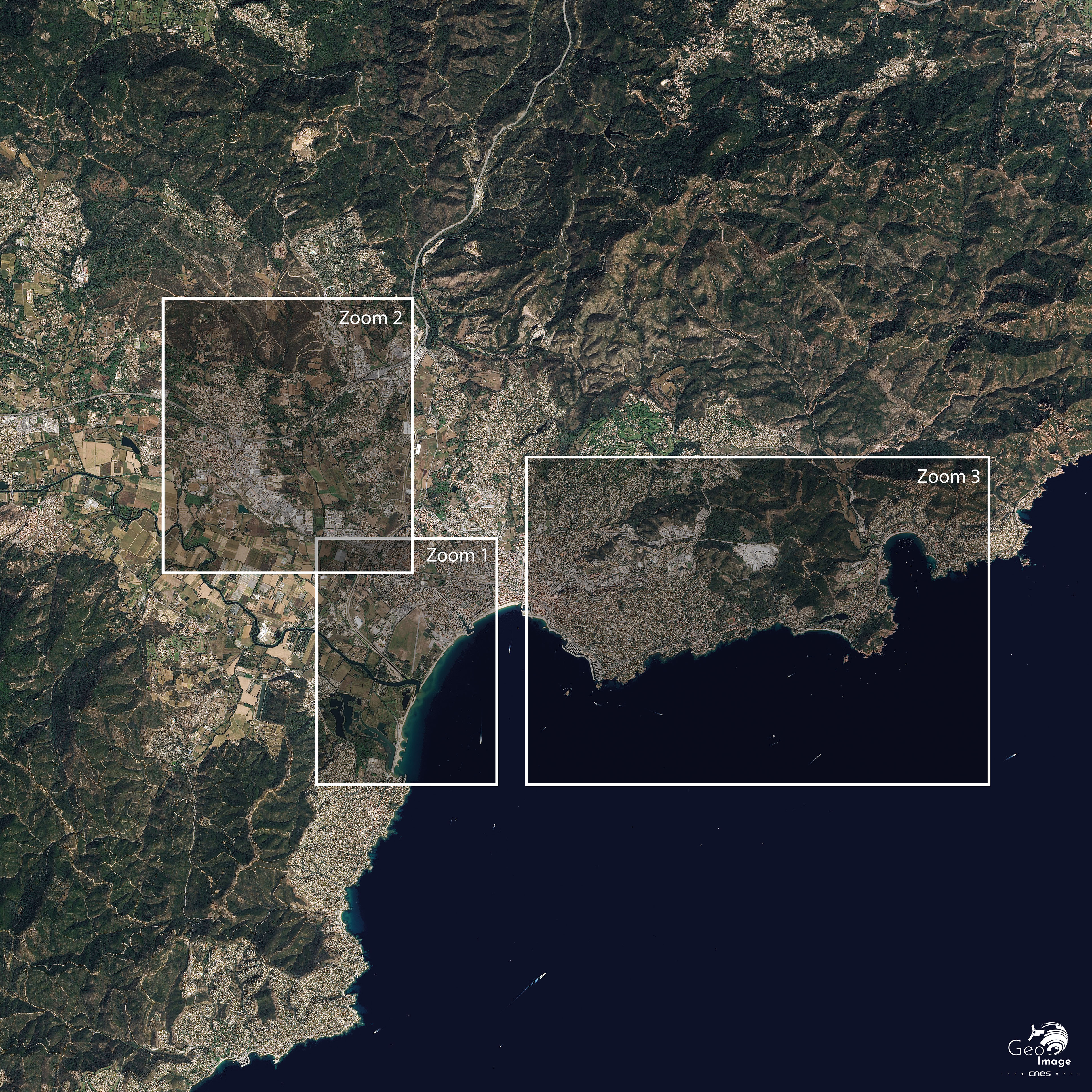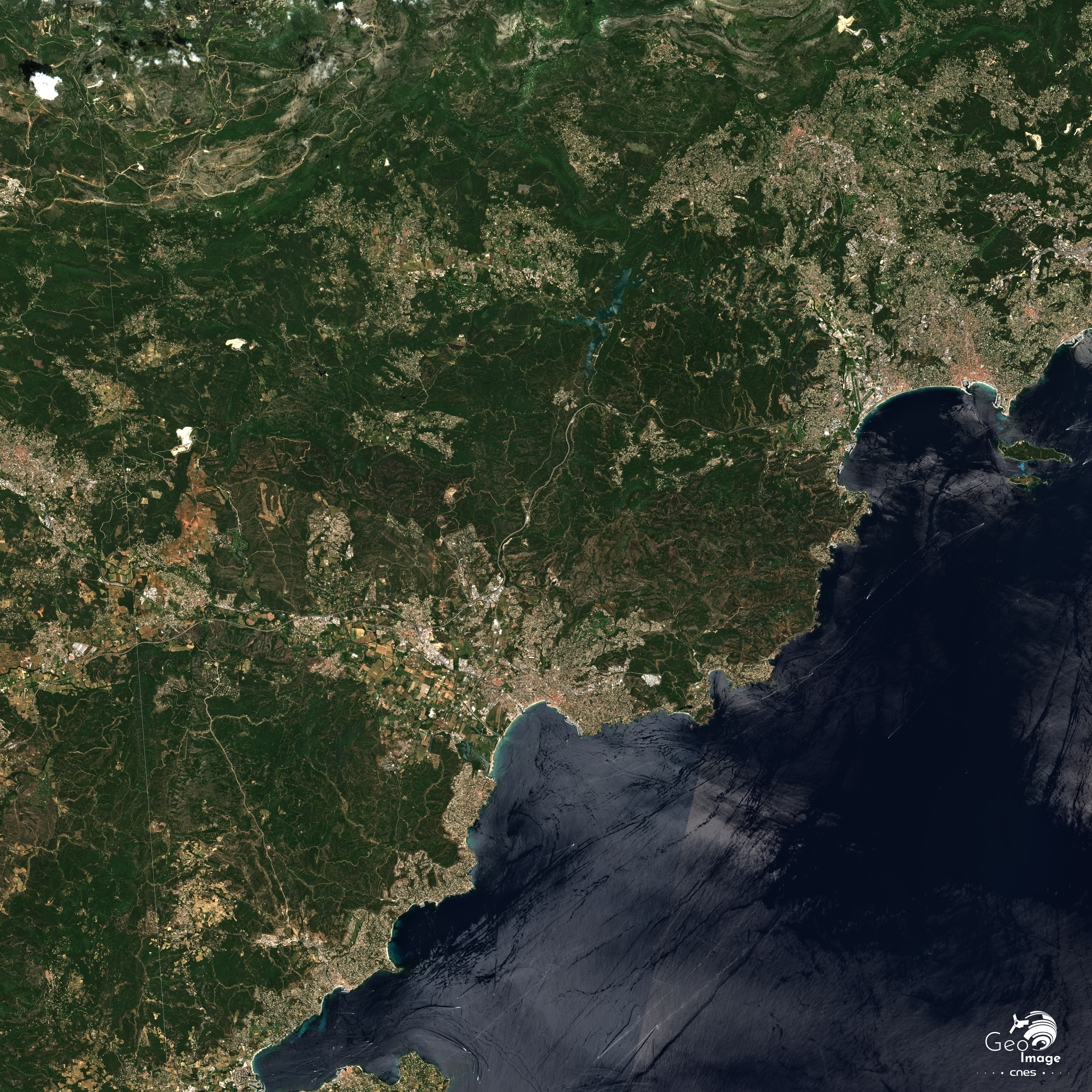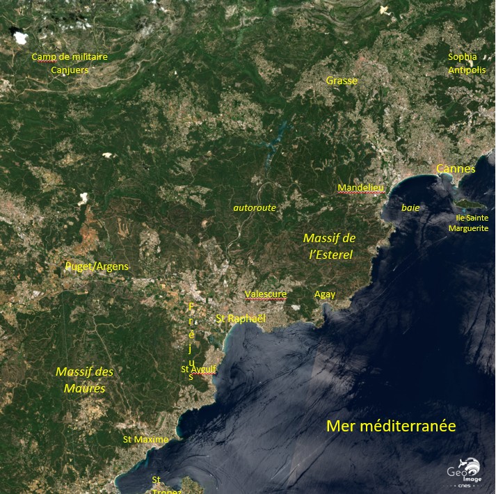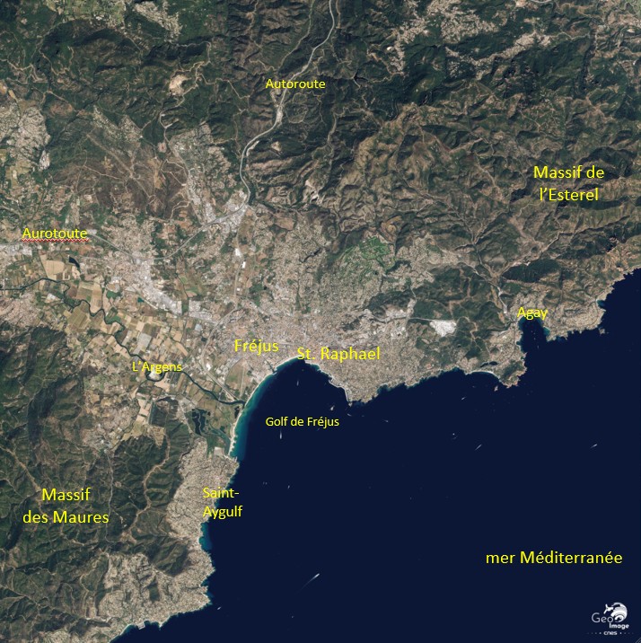 Cette image de la région de Fréjus / Saint-Raphaël a été réalisée par le satellite SPOT 6 en 2018. Il s’agit d’une image en couleurs naturelles de résolution à 1,5 m.