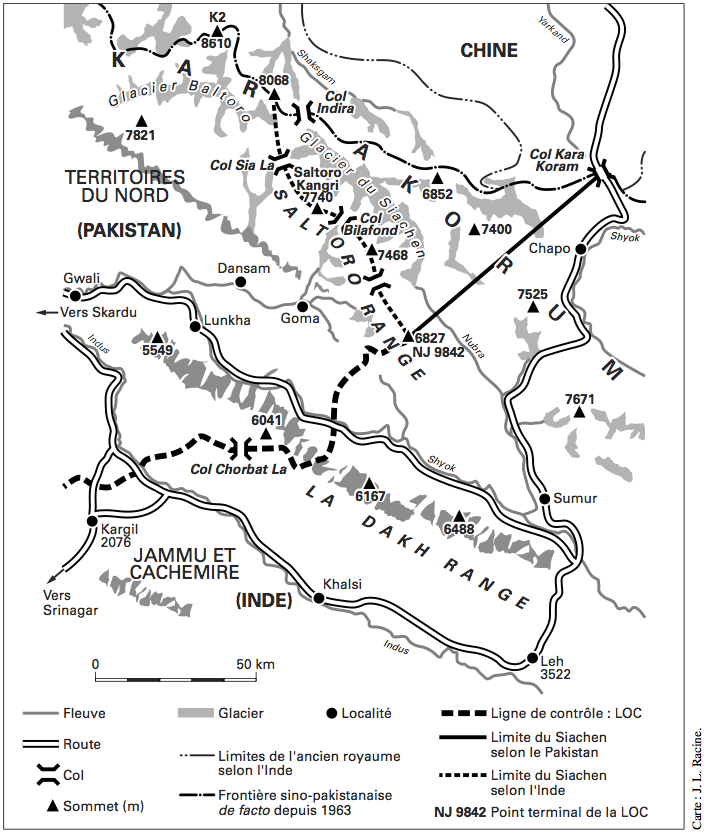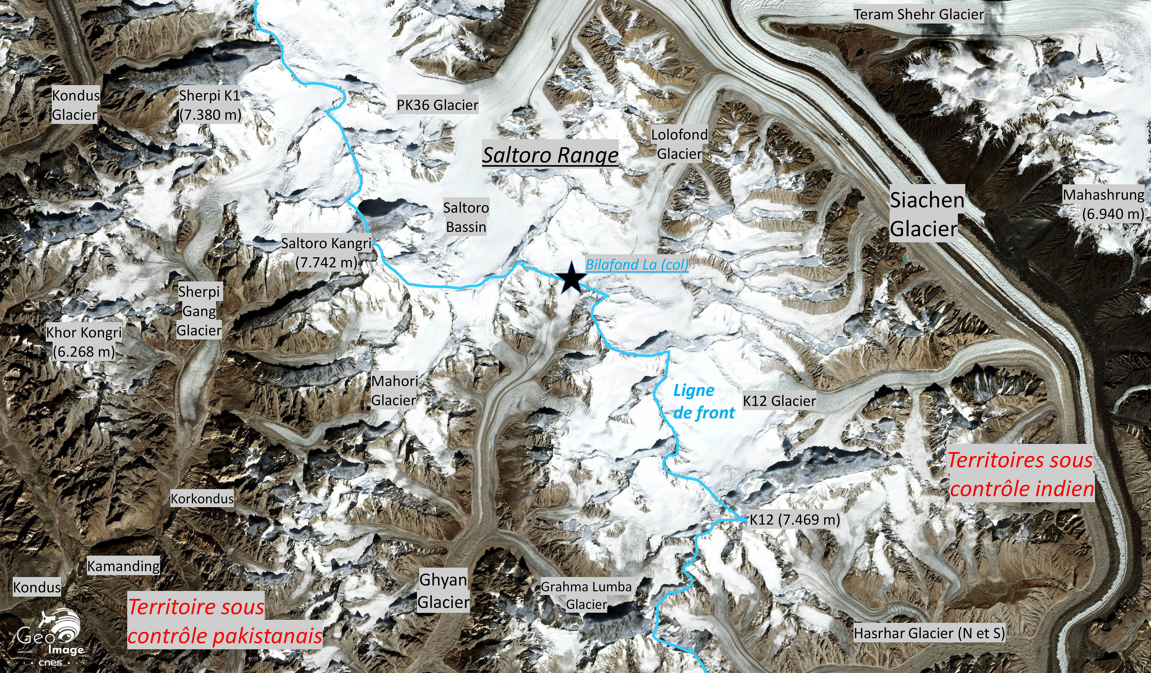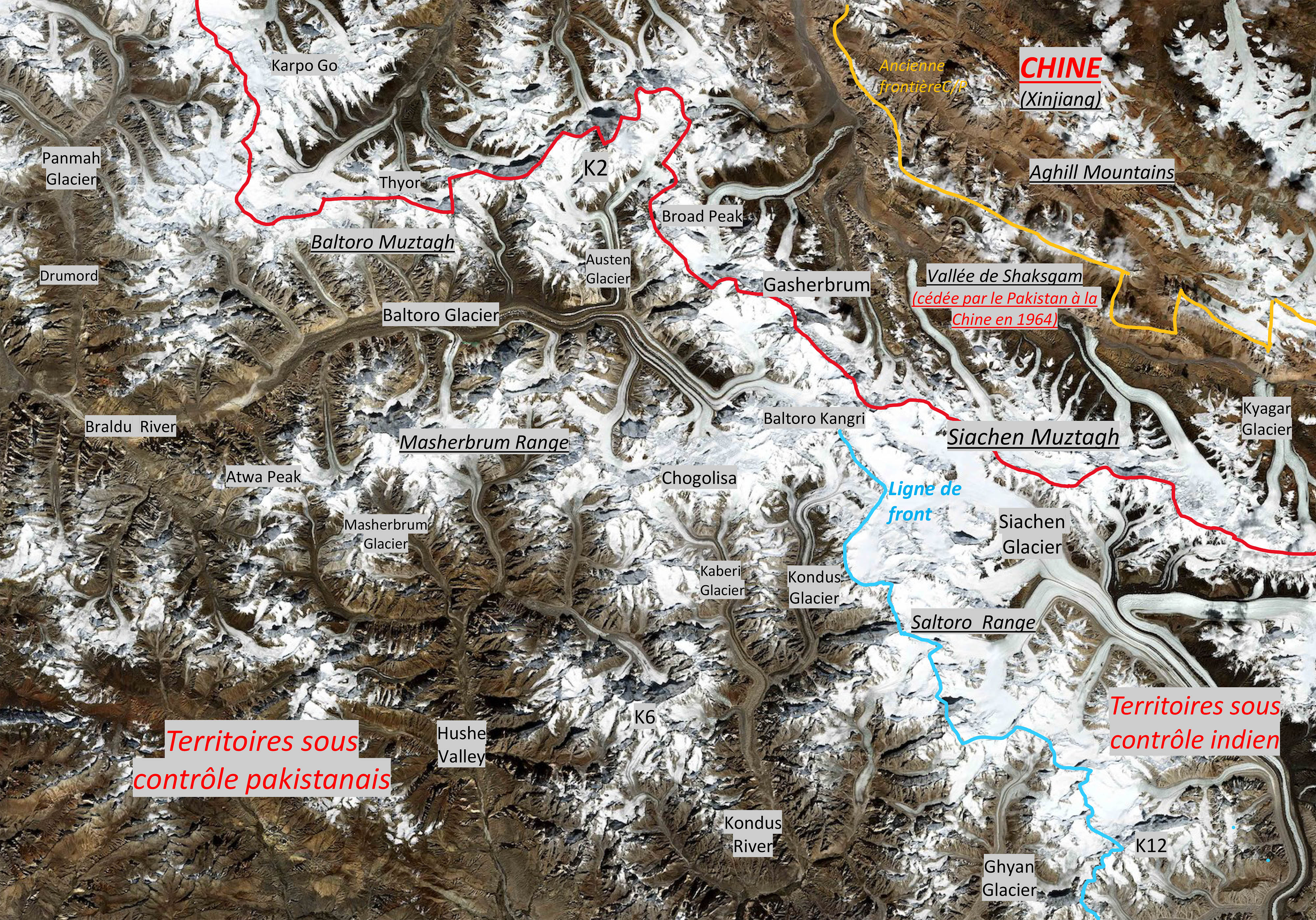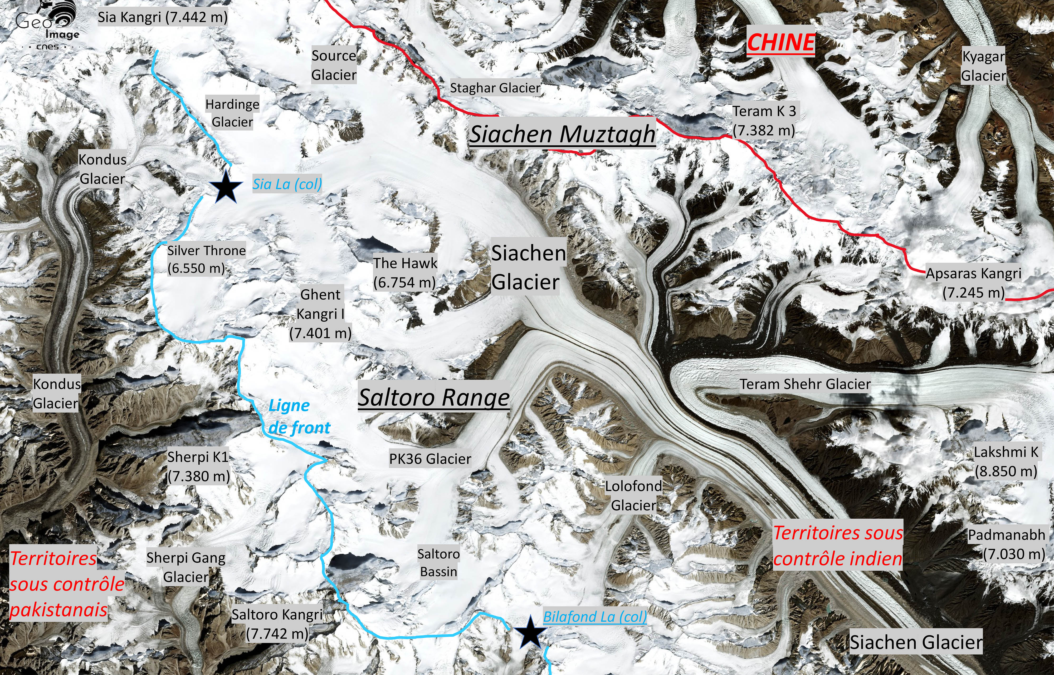 Comme l’illustrent les documents lieux repères, la Saltoro Range est donc traversée par une ligne de front militaire entre l’Inde et le Pakistan (trait bleu). Remontant la vallée du Siachen Glacier, l’Inde s’est emparée d’une zone constituant un vaste triangle compris entre la Siachen Muztagh et la Saltoro Range, entre le Chine et le Pakistan. Une prise de contrôle que refuse le Pakistan pour lequel cet espace doit être sous sa souveraineté.