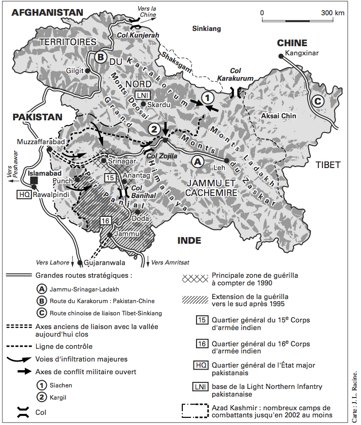 Si la possession des armes nucléaires gèle depuis 1998 tout affrontement majeur direct au risque d’une destruction complète des deux puissances du sous-continent indien, les crises et affrontements secondaires de plus ou moins forte intensité demeurent (cf. mai-juillet 1999, dec. 2001-juin 2002…). Dans ce contexte, la question du Cachemire cristallise les tensions, en demeurant l’épicentre du conflit, comme en témoigne la « Guerre de Kargil » de 1999, dans une région située au sud-ouest (hors image). C’est donc est une des régions frontalières les plus militarisées du monde.