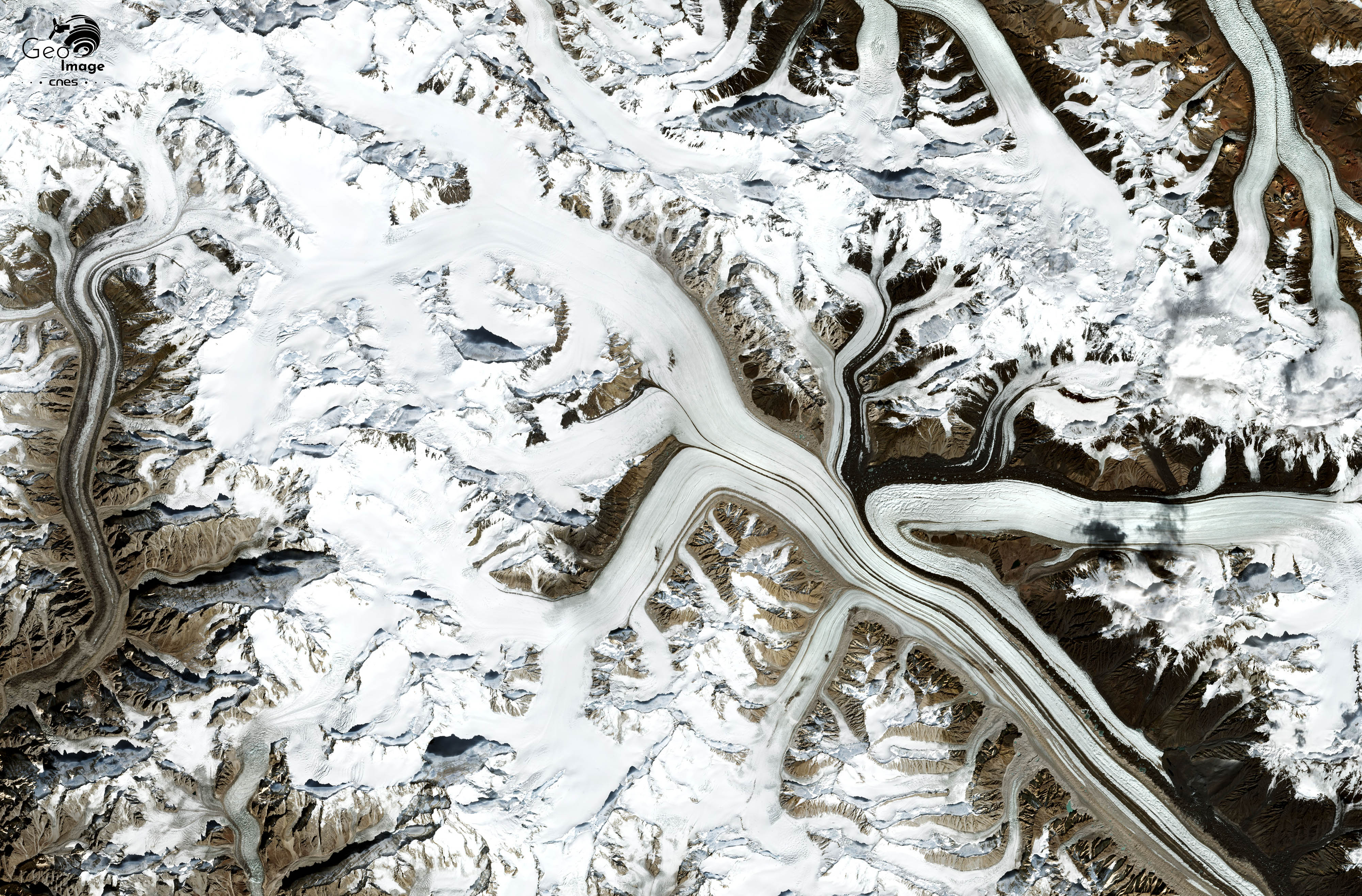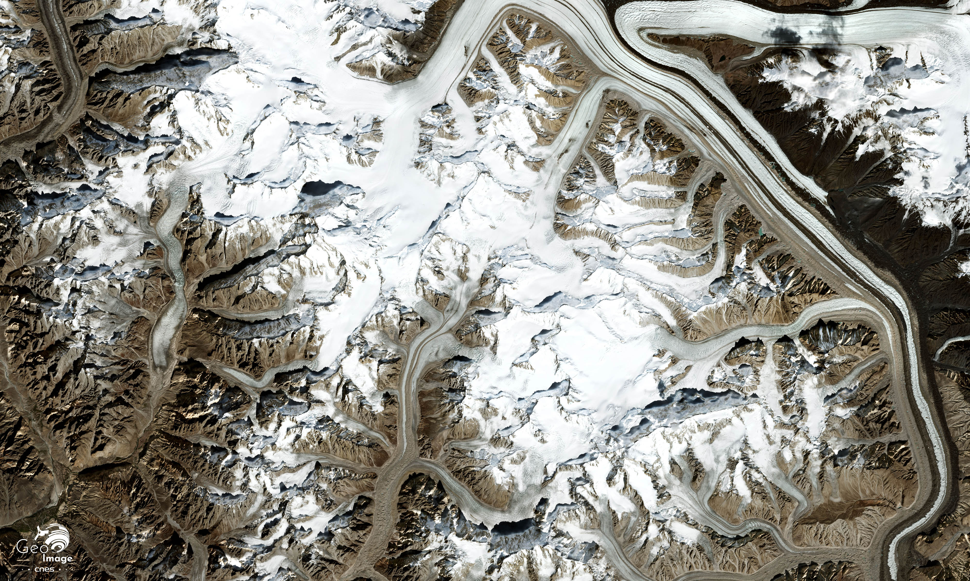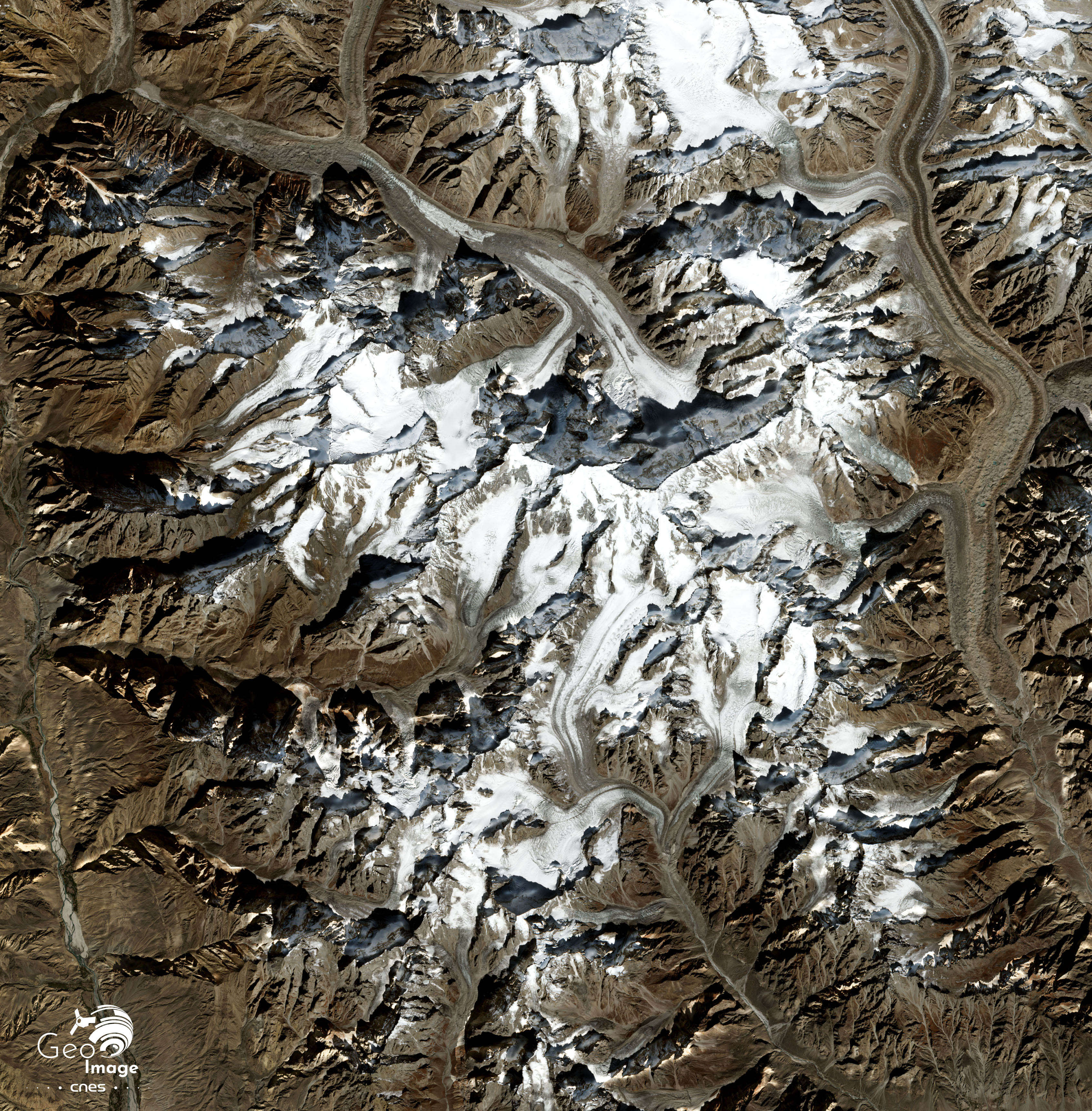 Prise au mois de septembre et couvrant la partie orientale de la chaîne du Karakoram, cette image est exceptionnelle du fait de sa clarté, de sa transparence et de sa luminosité. Car elle présente un massif très souvent couvert, au moins partiellement, par des nuages. Elle permet donc une approche et une étude détaillées d’un espace pour l’essentiel très largement inaccessible.
