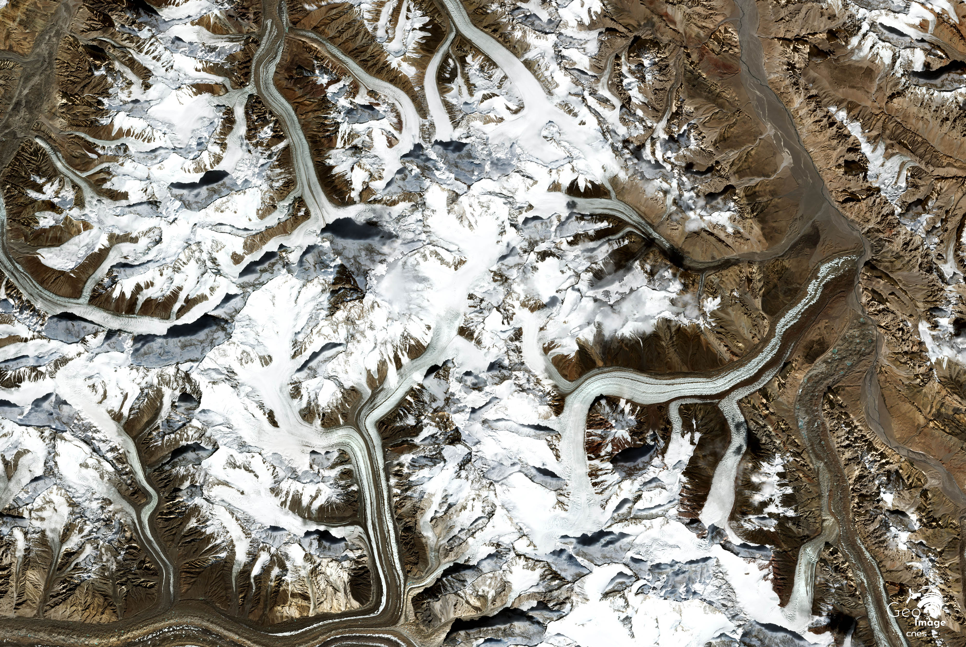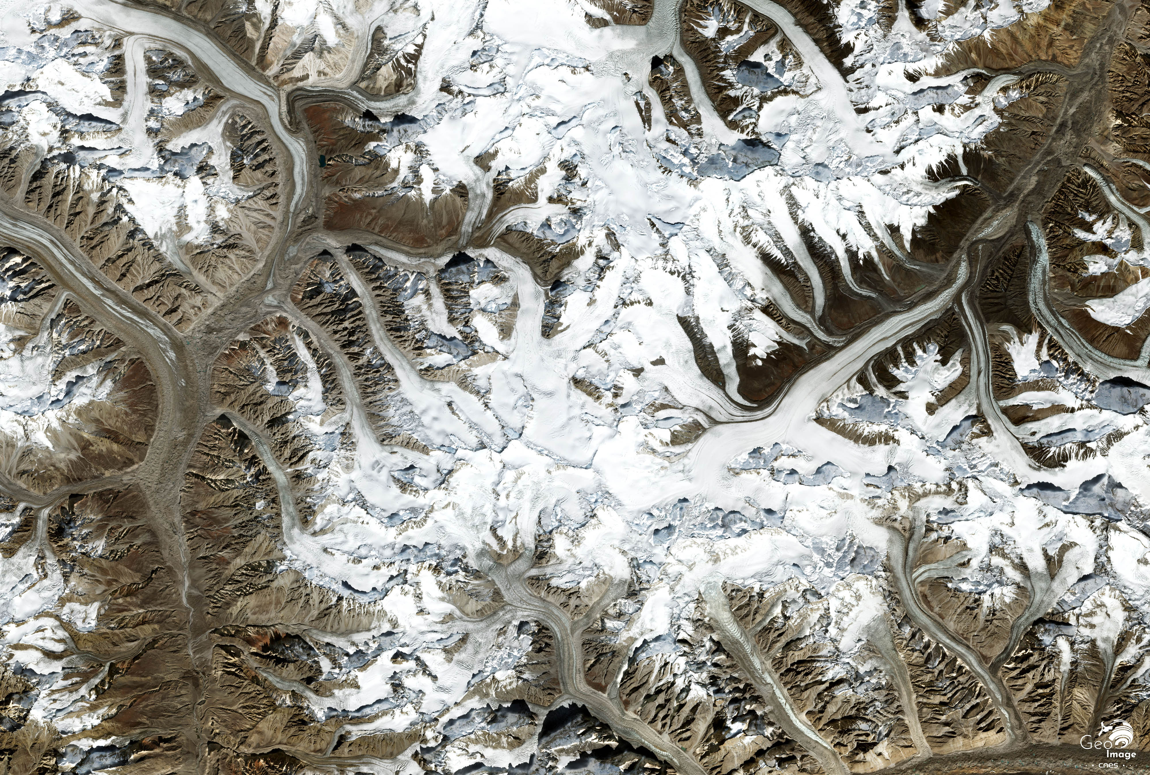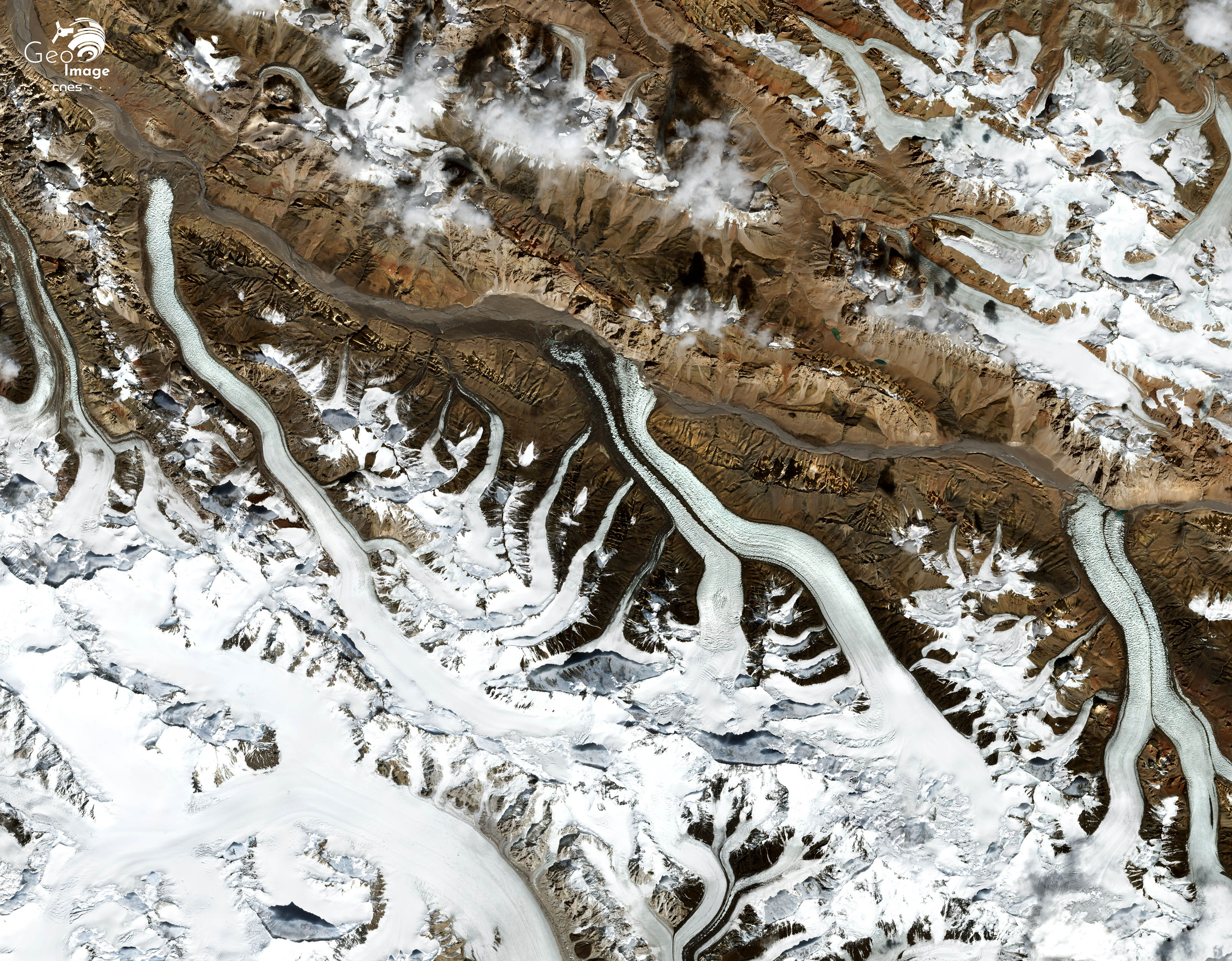 Prise au mois de septembre et couvrant la partie orientale de la chaîne du Karakoram, cette image est exceptionnelle du fait de sa clarté, de sa transparence et de sa luminosité. Car elle présente un massif très souvent couvert, au moins partiellement, par des nuages. Elle permet donc une approche et une étude détaillées d’un espace pour l’essentiel très largement inaccessible.