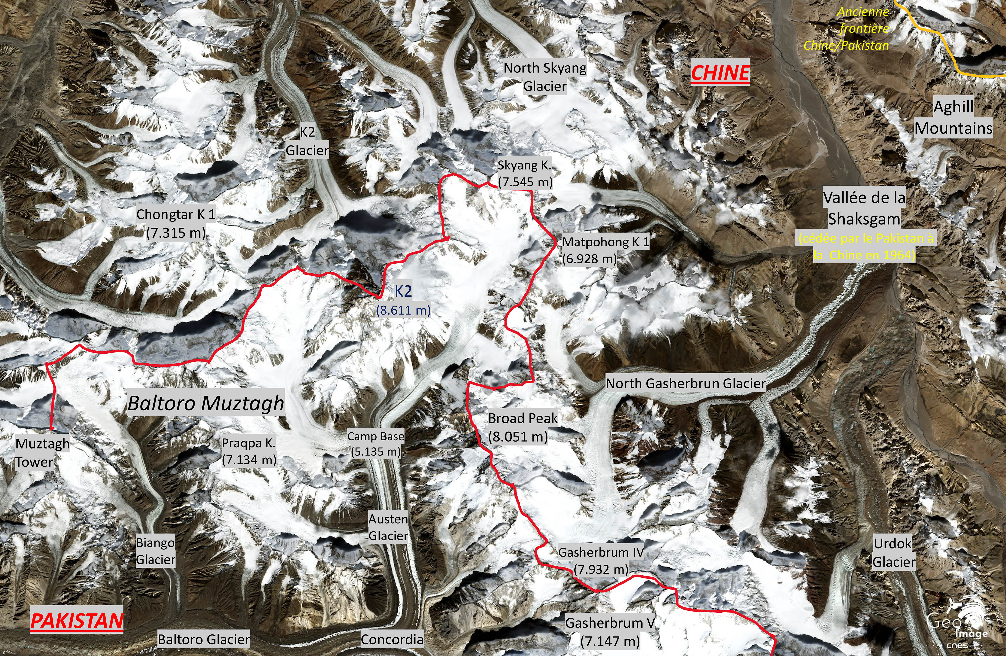 Comme le montre l’image, l’axe montagnard principal est constitué à l’est de la Baltoro Muztâgh, à laquelle appartient le massif du K2 (zoom 1), et à l’ouest de la Siachen Muztâgh. Cet axe sert de frontières à la Chine, qui se trouve au nord-est, au Pakistan au centre et au sud-ouest et à l’Inde, qui occupe ici l’angle sud-est. Au plan politique et administratif, l’image couvre une partie du Tashkurgan, qui appartient à la province chinoise du Xinjiang, le Balistan, qui appartient au Gilgit-Balistan pakistanais, et les marges de la région indienne du Jammu-et-Cachemire.