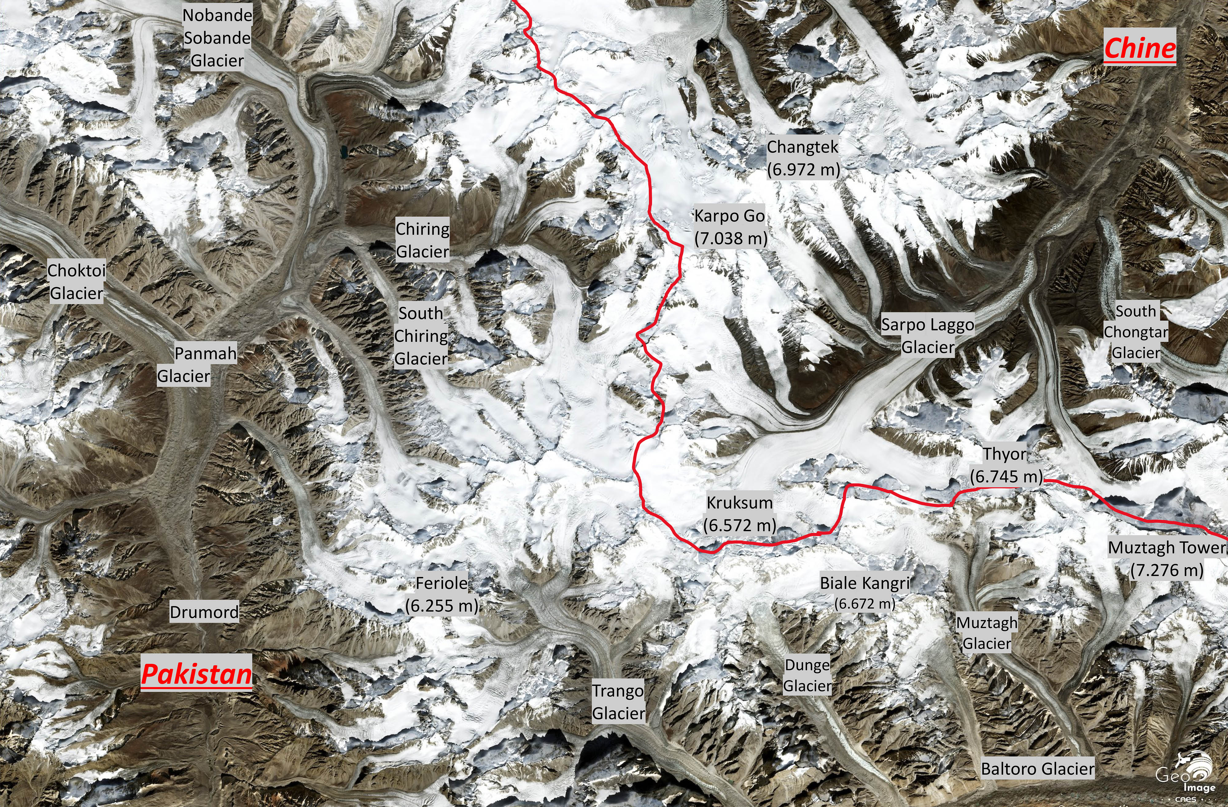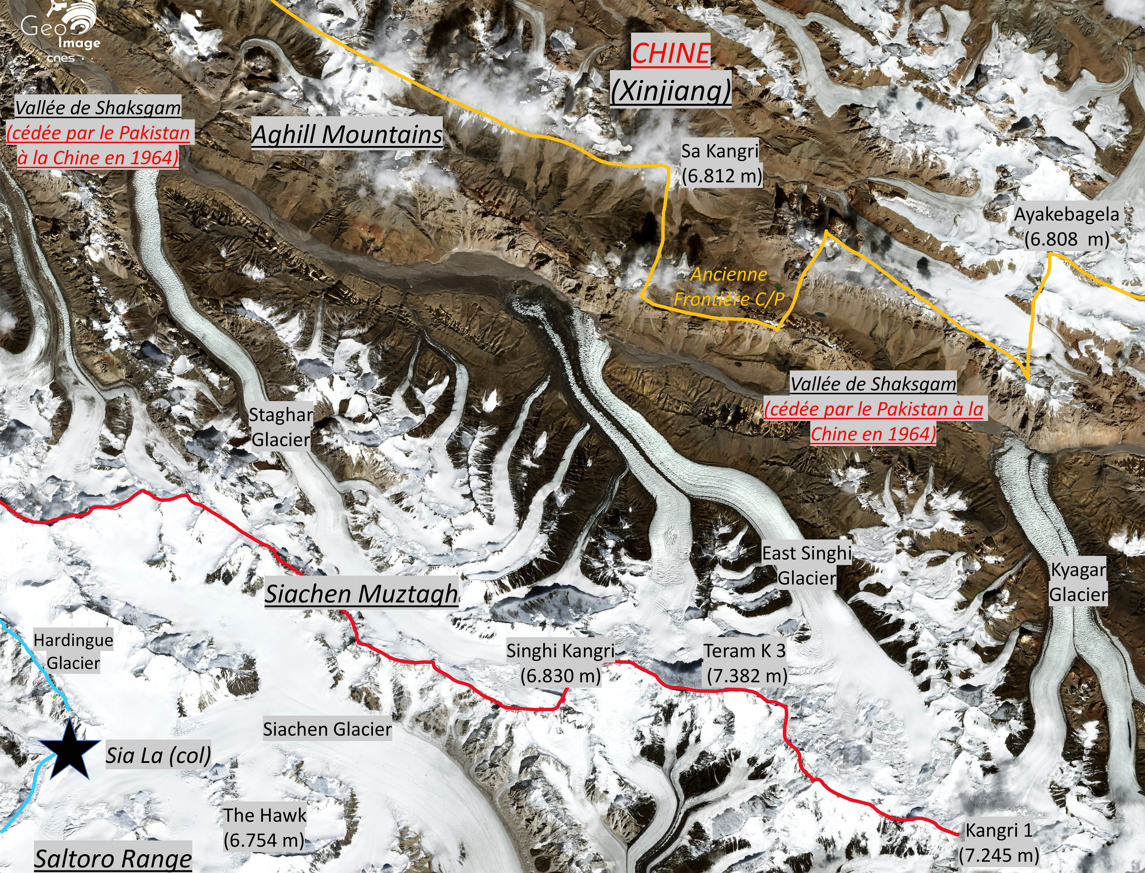 La nouvelle frontière internationale (cf. trait rouge) est fixée sur la ligne de crêtes de la Siachen Muztâgh à des altitudes beaucoup plus élevées. De celle-ci descendent d’ailleurs de puissants appareils glaciaires faisant des dizaines de kilomètres de long comme les Staghar, Singhi et Kvagar Glaciers, dont les langues terminales envahissent le fond de la vallée de la Shaksgan.