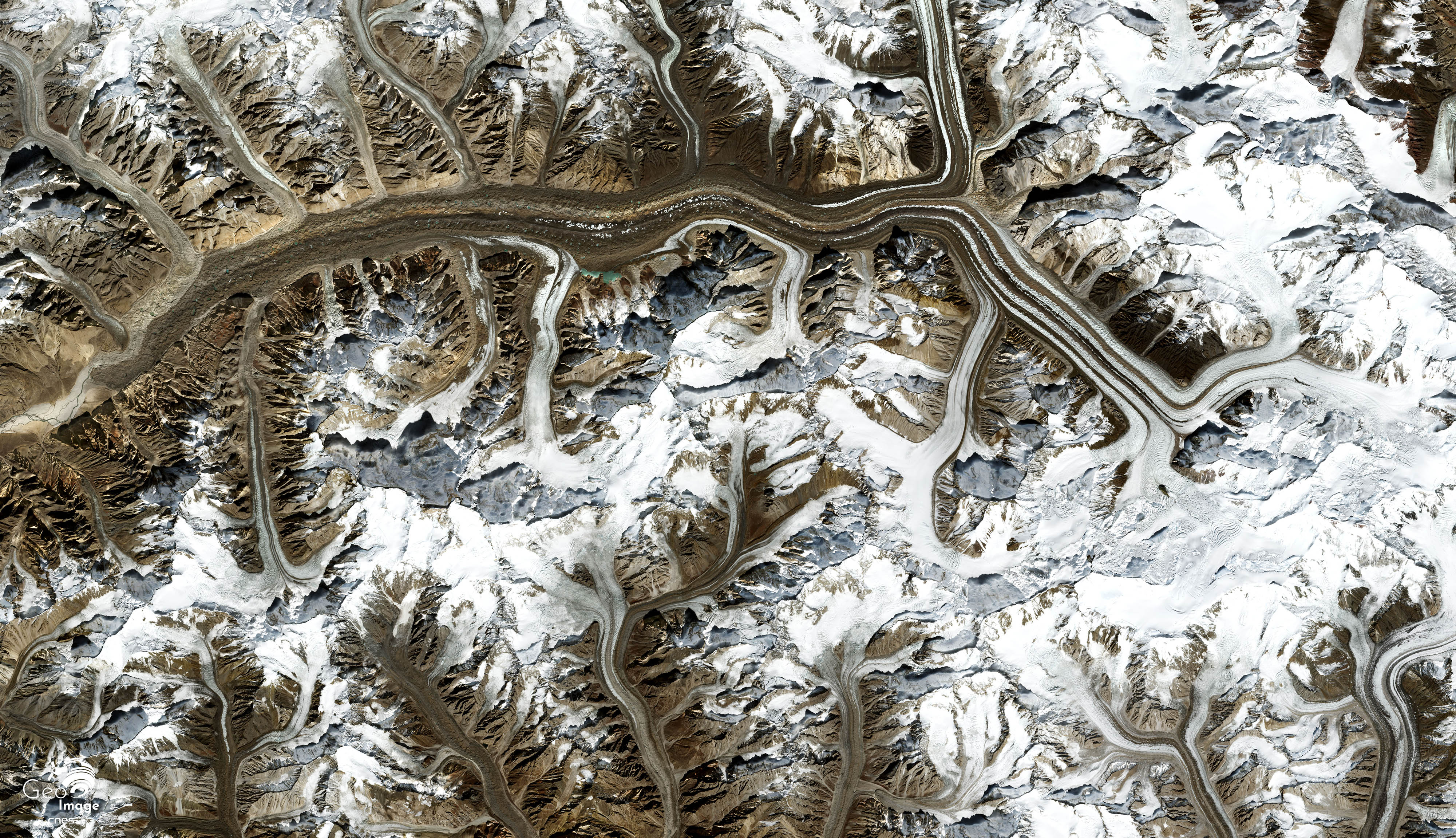 Située pour l’essentiel au Pakistan, cette image zoom est centrée sur le magnifique Baltoro Glacier, qui est un des plus longs glaciers du monde hors zones polaires, en mesurant 63 km. La fonte de ses eaux donne naissance à la Braldu River, qui est un émissaire de la rivière Shigar, qui se jette elle-même dans l’Indus à Skardu. Toute cette région sert donc de château d’eau et alimente les piémonts et basses terres, dont certaines désertiques, du Pakistan.
