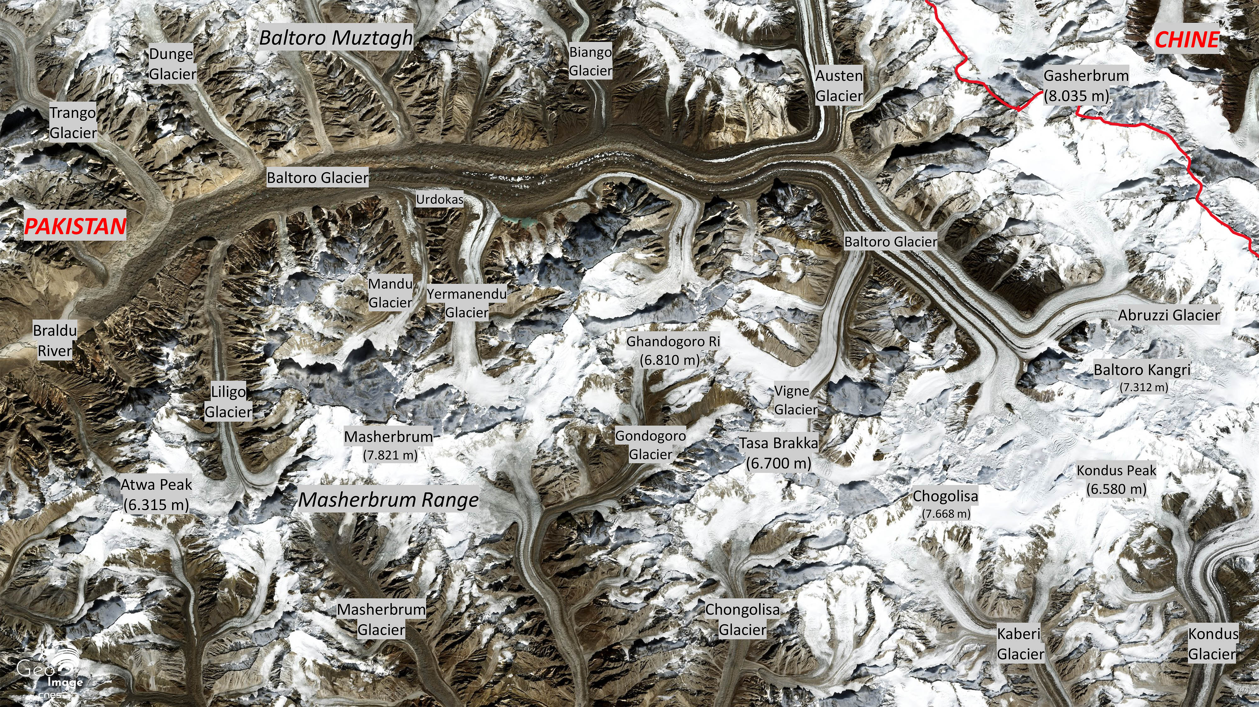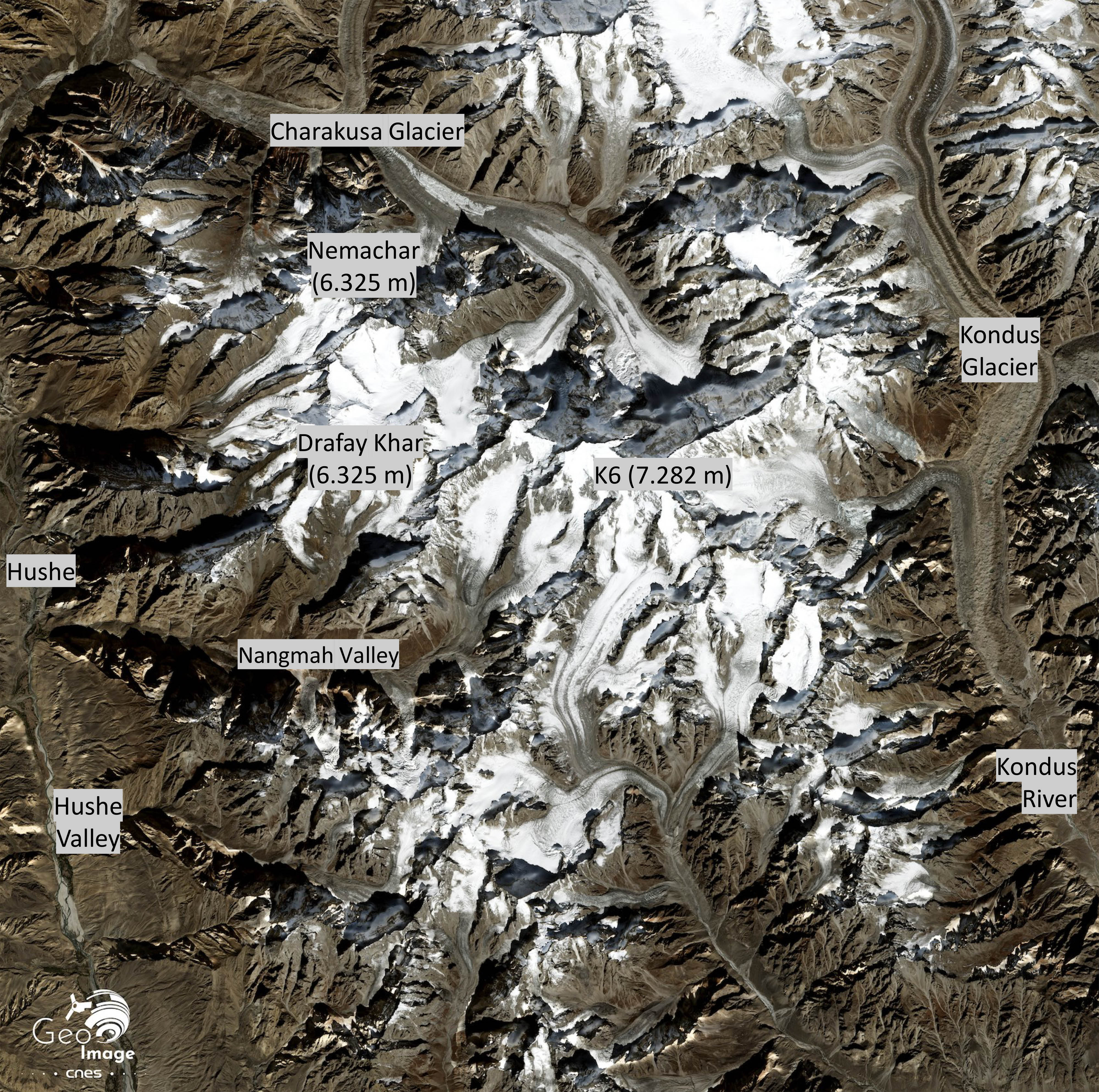 L’image couvre le vaste massif du K6 qui culmine à 7282 m. Il est entouré à l’est par la grande vallée du Kondus Glacier, largement recouvert de moraines comme l’indique sa couleur très marron, et à l’ouest par la haute vallée d’Hushe, du nom du village pakistanais qui apparait en fond de vallée à l’abri sur un cône de déjection à l’intersection de deux vallées. L’image illustre les fortes contraintes liées à l’altitude, à la précarité des conditions de vie et à l’isolement dans ces systèmes périphériques marginaux.