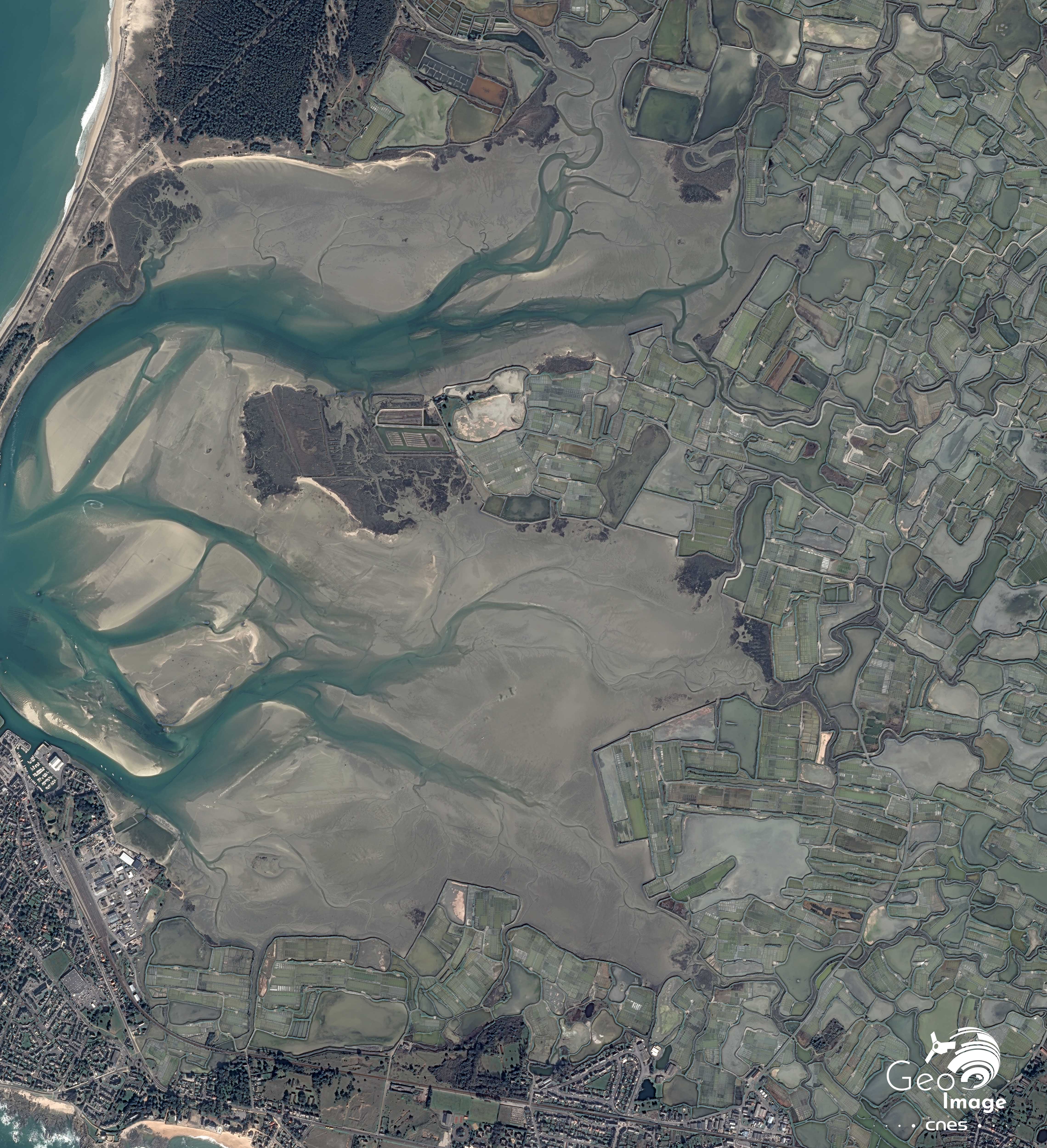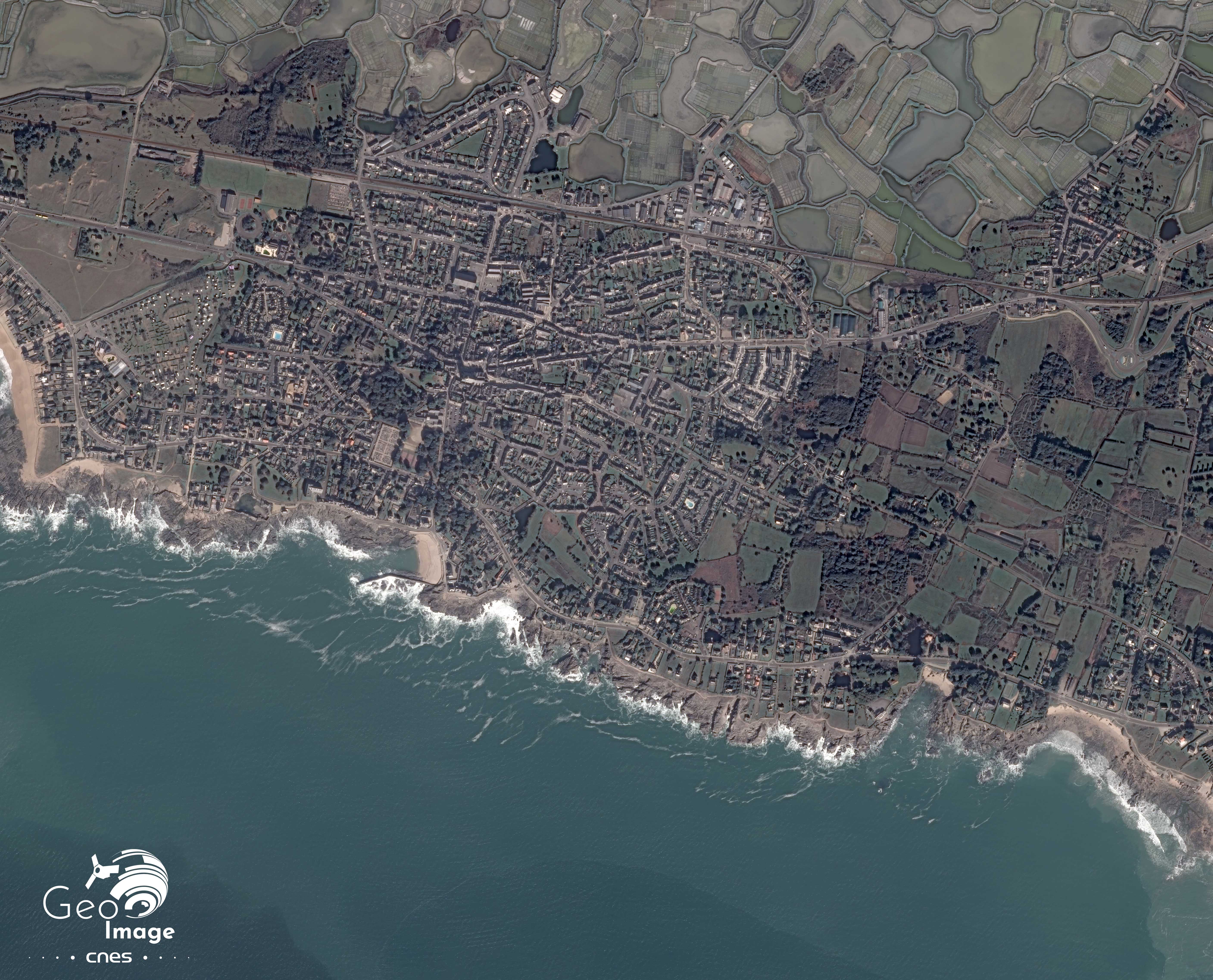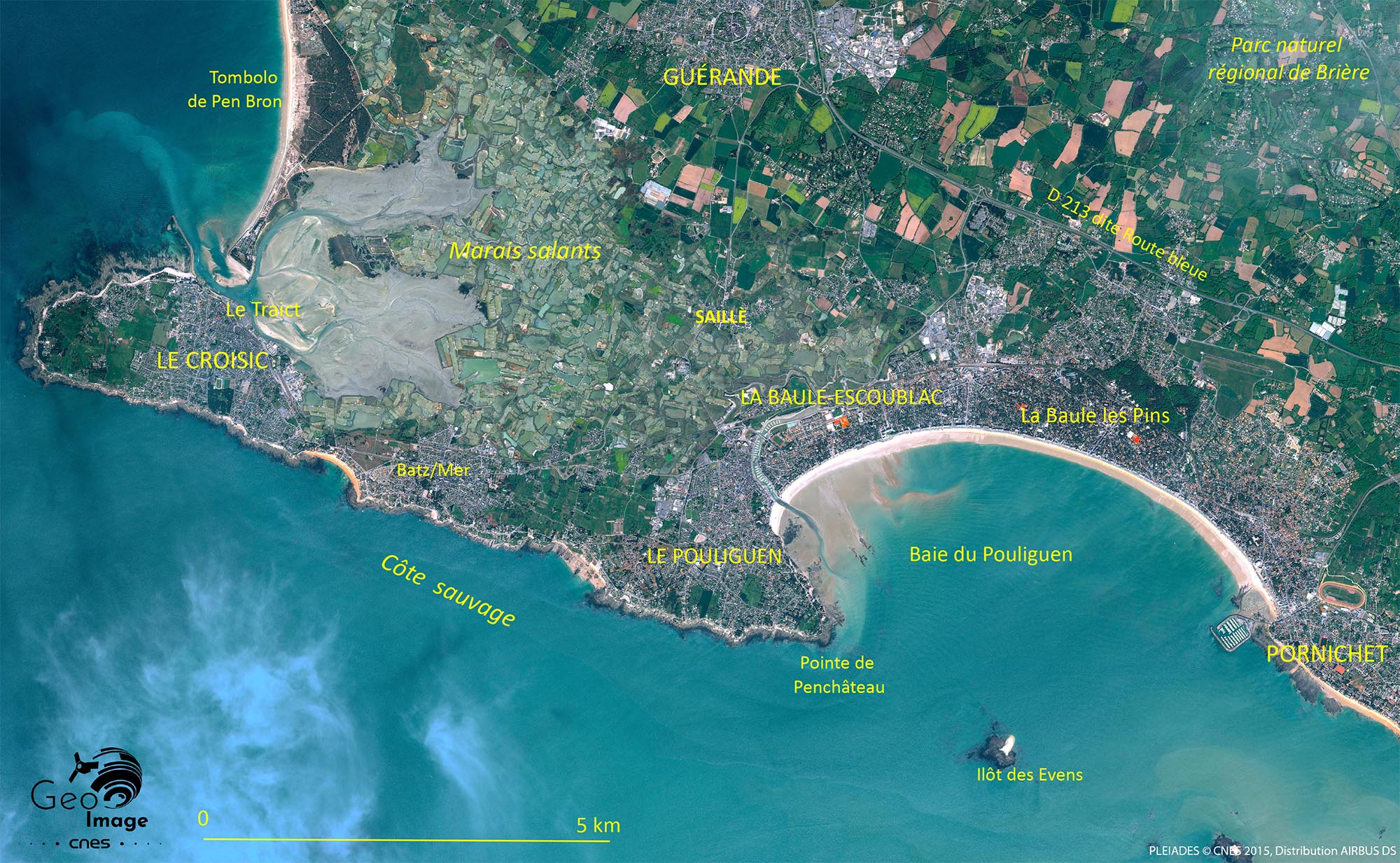 Cette image du territoire de la presqu’ile de Guérande - La Baule, situé sur le littoral atlantique, a été prise par un satellite Pléiades le 22 avril 2015. Il s’agit d’une image en couleur naturelle, de résolution native à 0,70m, ré-échantillonnée à 0,5m.