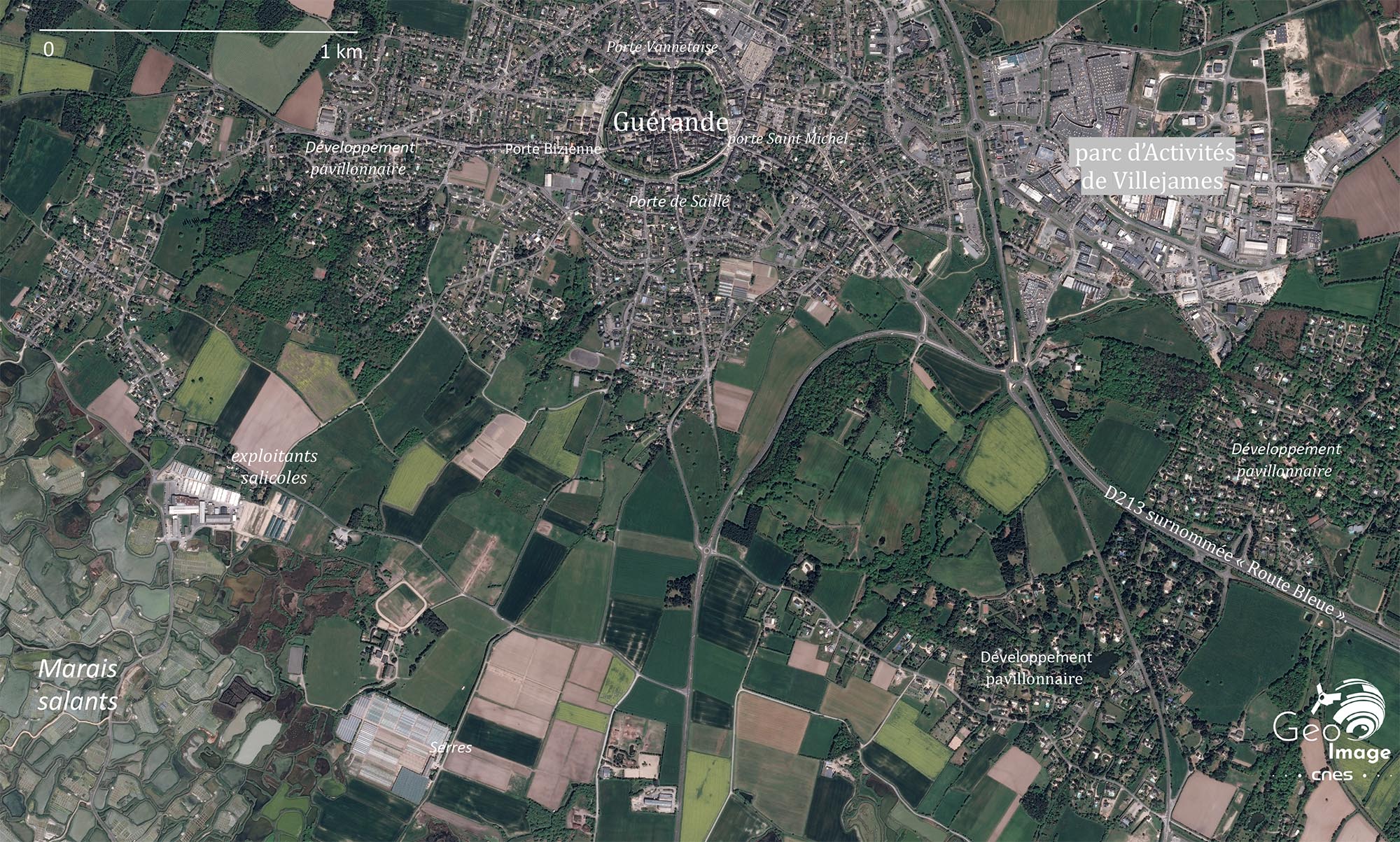 On peut lire sur cette image la forme quasi circulaire de la ville close de Guérande avec ses douves partiellement comblées : la ville médiévale est devenue un site touristique grâce à la richesse de son patrimoine architectural. Les fortifications sont d’une longueur d’environ 1 300 mètres. On peut retrouver sur cette vue les quatre portes fortifiées situées aux quatre points cardinaux : porte Saint Michel à l’est, Vannetaise au nord, Bizienne à l’ouest et de Saillé au sud. Ces remparts sont classés au titre des monuments historiques depuis 1877.