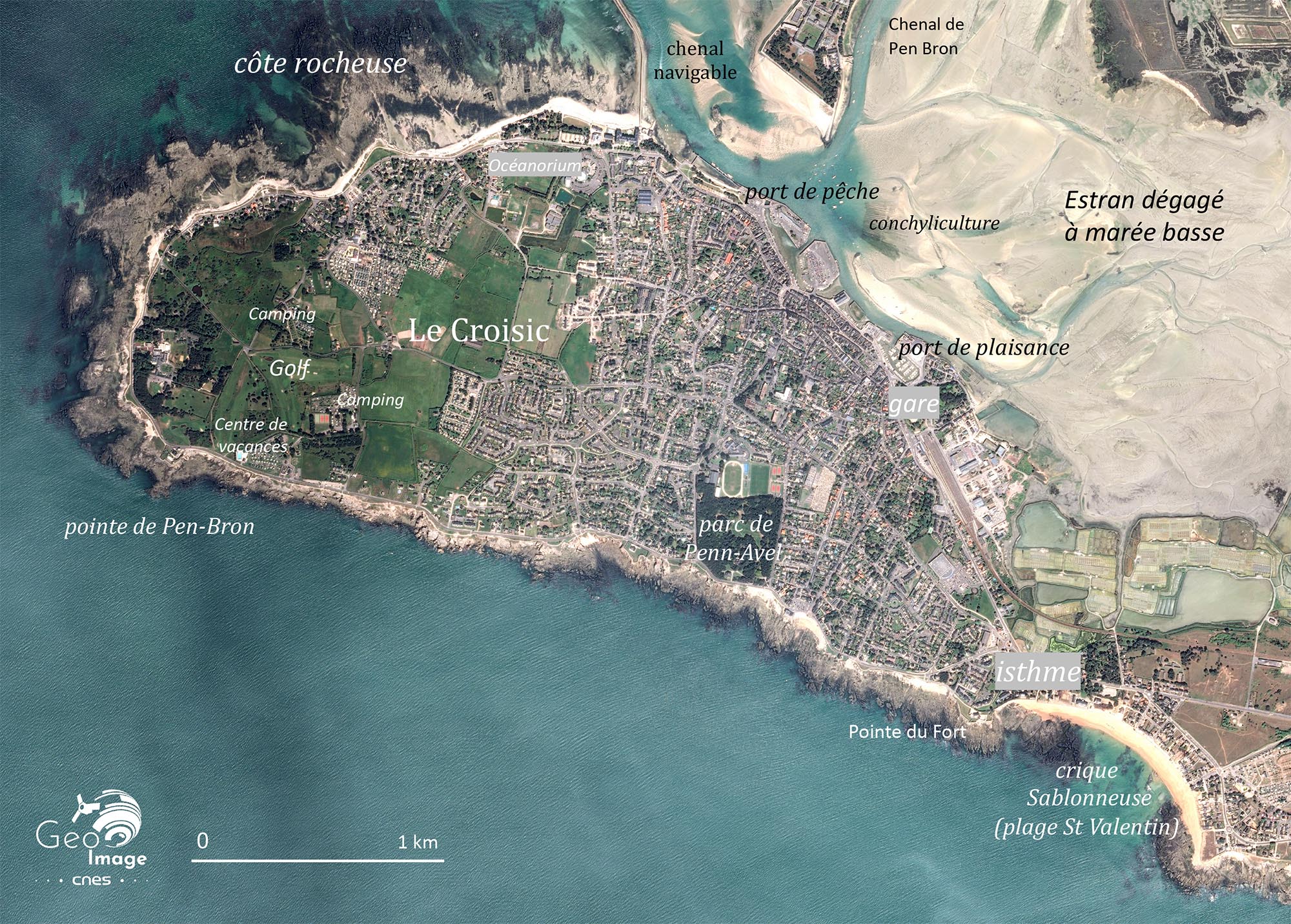 Le Croisic est une ancienne île granitique séparée du continent jusqu'au XIe siècle : on repère aisément l'isthme très étroit qui fait le lien avec la commune de Batz-sur-mer derrière la plage Valentin. La ville est peuplée de 4 000 habitants et connait un vieillissement marqué.