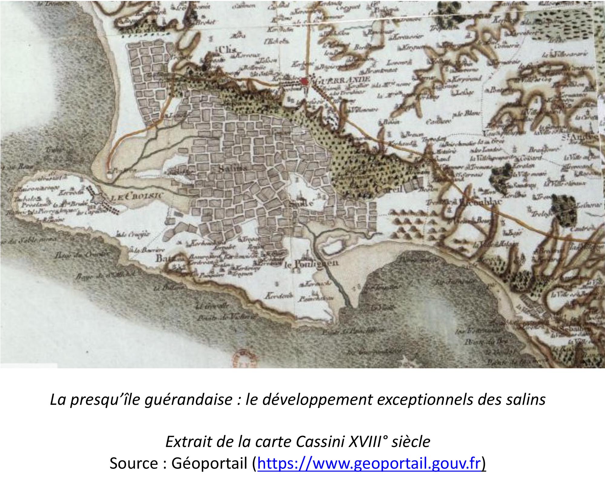Comme pour tous les littoraux, les premières mises en valeur sont situées dans l’arrière-pays, loin des plages. Le pays guérandais, serré autour de la ville close, appartenait au duché de Bretagne et représentait une petite région économiquement riche. En 1532, l'union du duché de Bretagne et du royaume de France est proclamée, celle-ci sera effective en 1547 et la presqu’ile guérandaise marque la frontière linguistique (les toponymes bretons sont nombreux) entre le duché de Bretagne et le royaume de France.