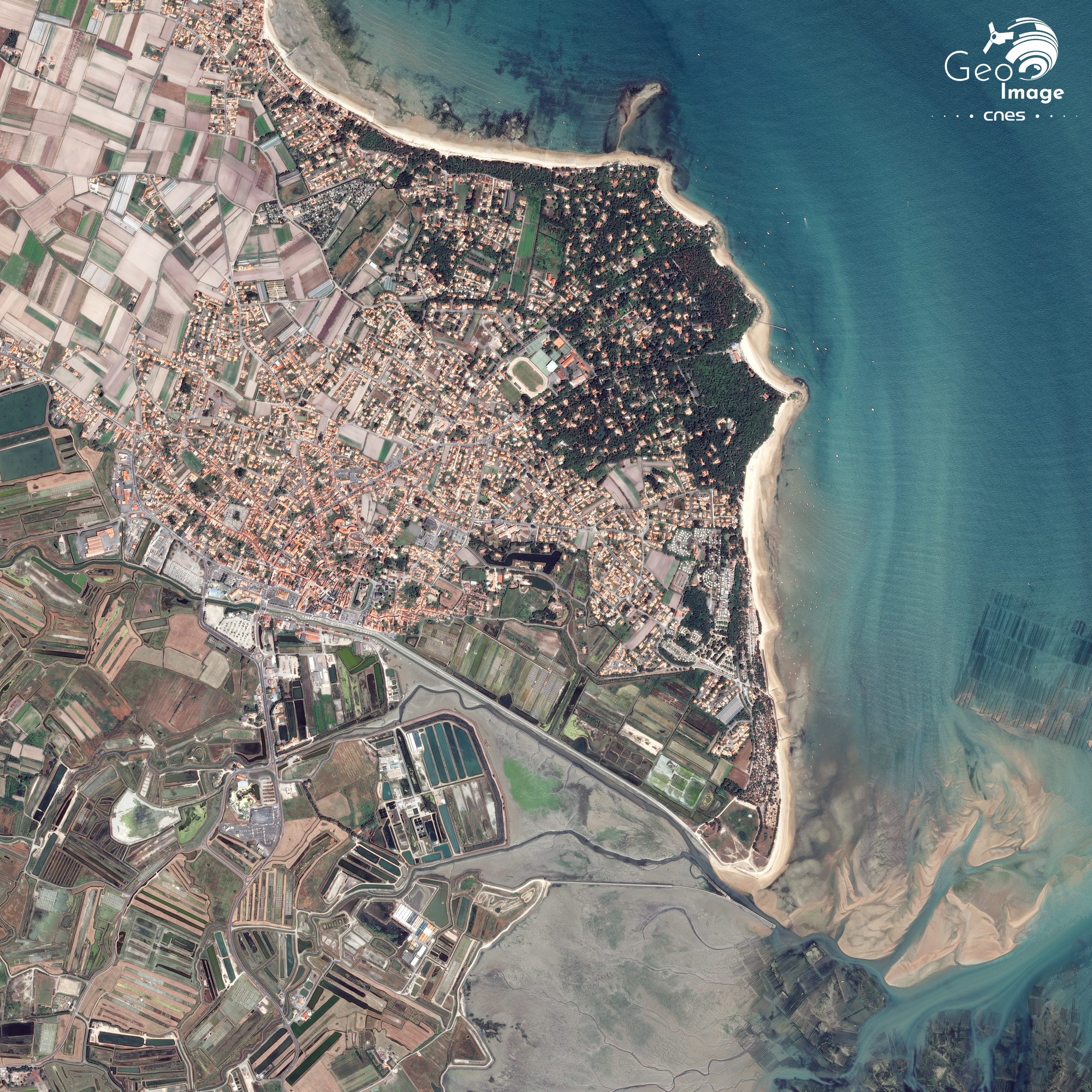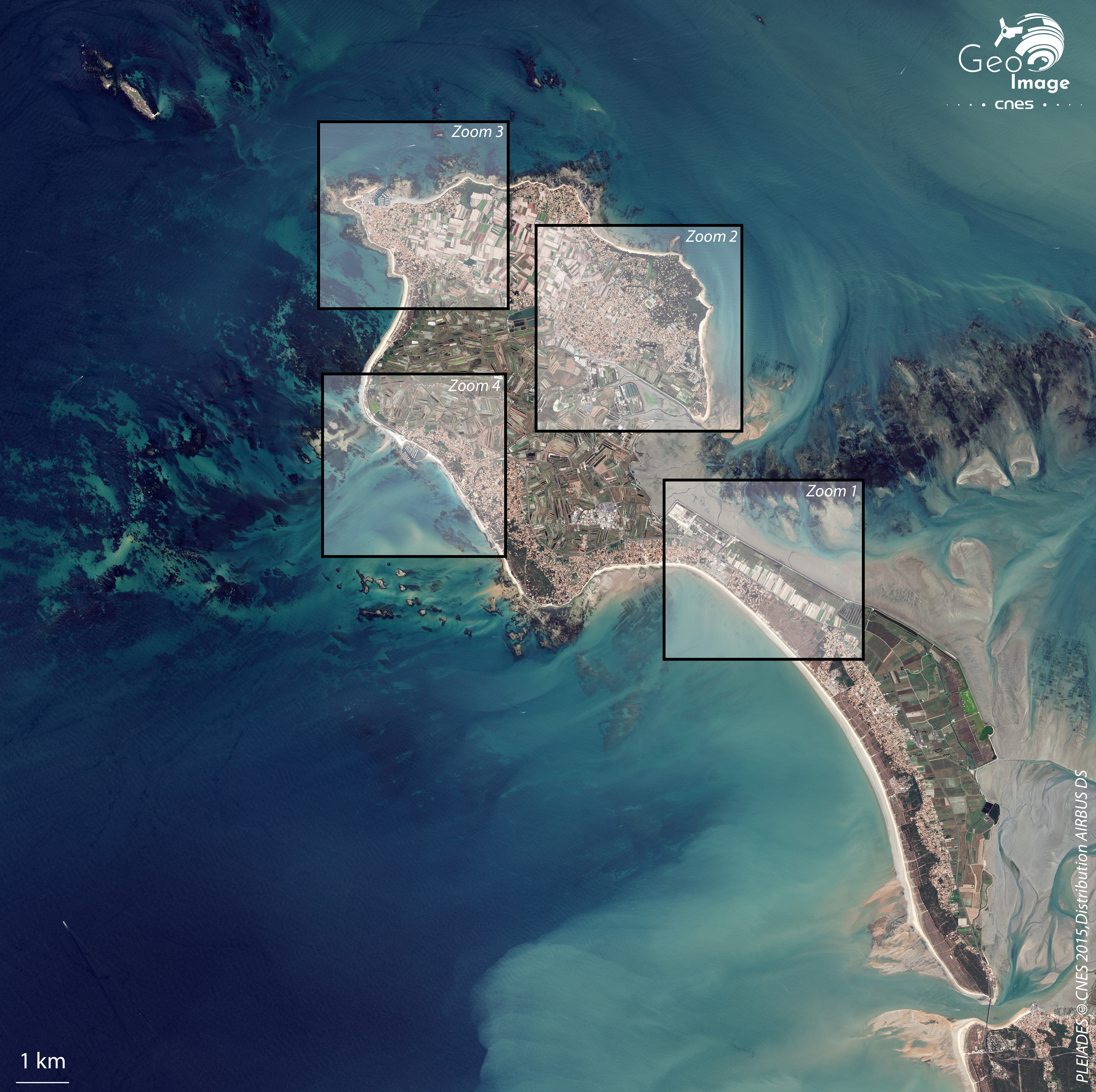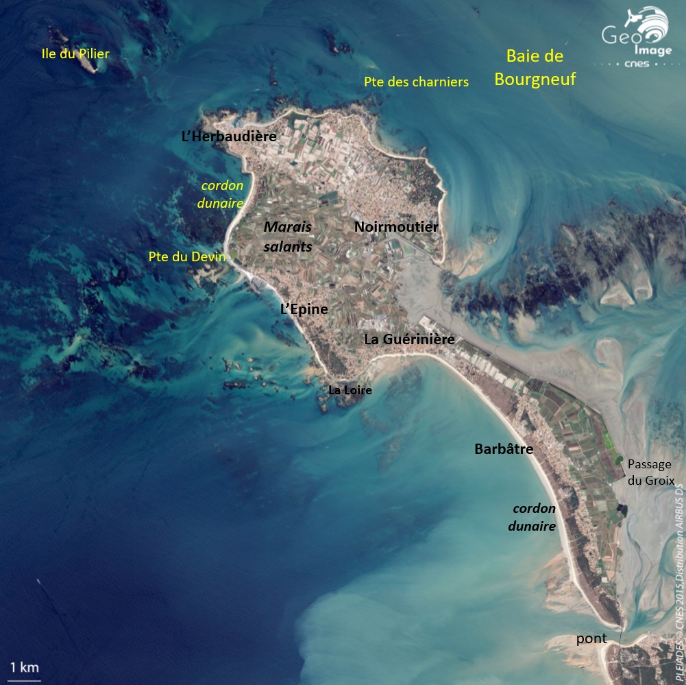 Couverte par l’image, l’île de Noirmoutier est située sur le littoral atlantique, au sud de l'estuaire de la Loire et à l'ouest du Marais Breton. Cet espace insulaire vendéen de 48 km² a une orientation nord-ouest/sud-est et est constitué d'un socle rocheux cristallin au nord sur lequel s'est développé un long cordon dunaire visible sur l'image. Cette flèche sableuse, qui s’est mise en place sous l’action des vents et des courants, a isolé la Baie de Bourgneuf et permis l’accumulation de sédiments formant des zones de marais et donnant à l’île sa structure caractéristique.