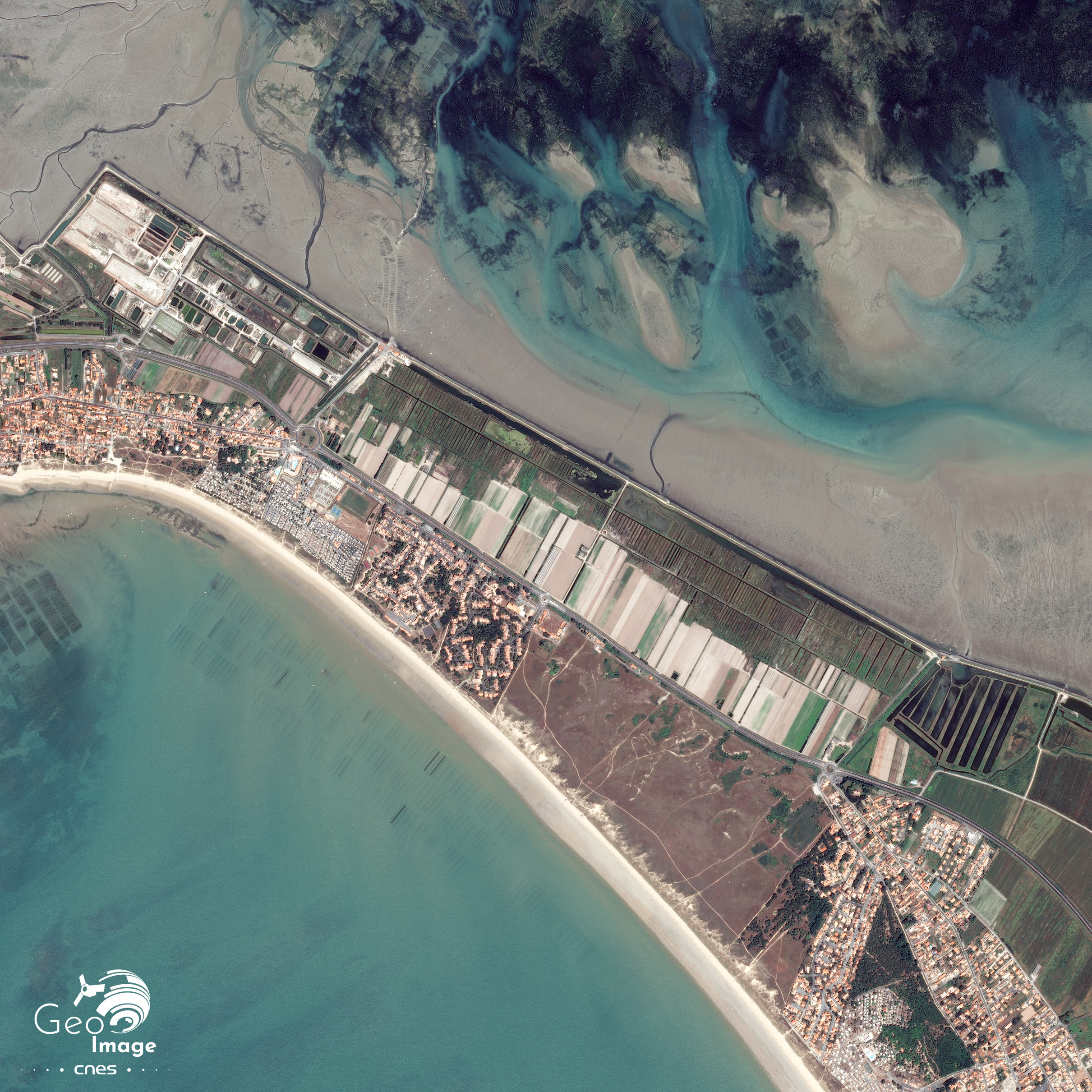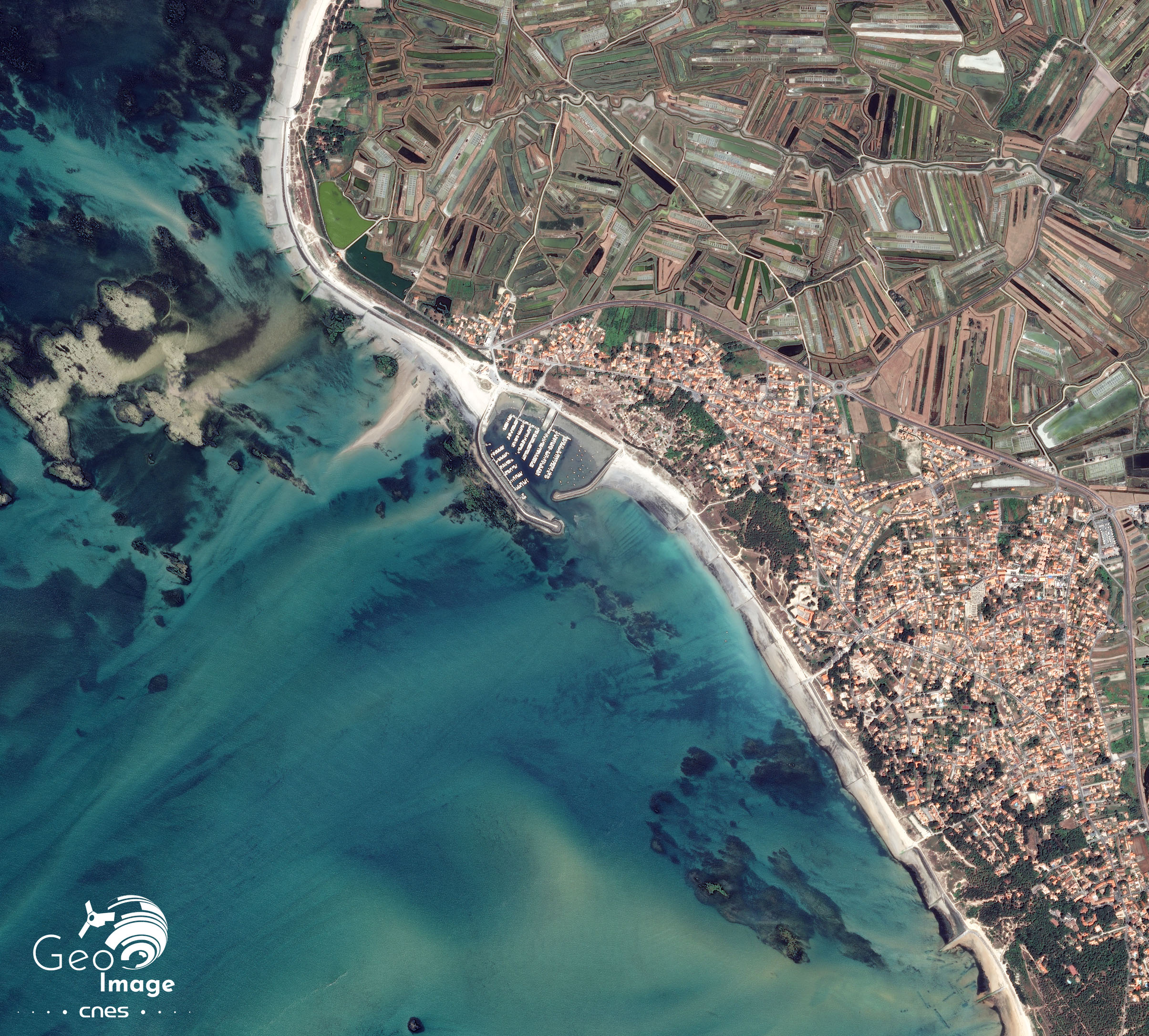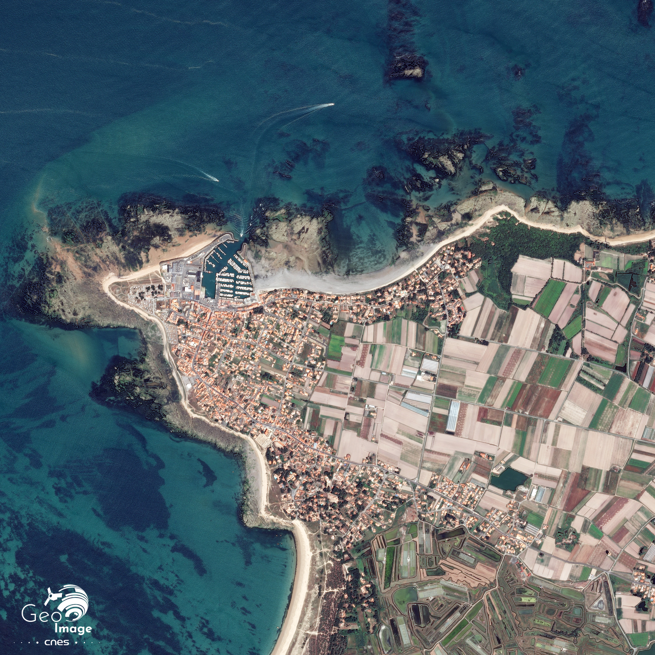 Couverte par l’image, l’île de Noirmoutier est située sur le littoral atlantique, au sud de l'estuaire de la Loire et à l'ouest du Marais Breton. Cet espace insulaire vendéen de 48 km² a une orientation nord-ouest/sud-est et est constitué d'un socle rocheux cristallin au nord sur lequel s'est développé un long cordon dunaire visible sur l'image. Cette flèche sableuse, qui s’est mise en place sous l’action des vents et des courants, a isolé la Baie de Bourgneuf et permis l’accumulation de sédiments formant des zones de marais et donnant à l’île sa structure caractéristique.