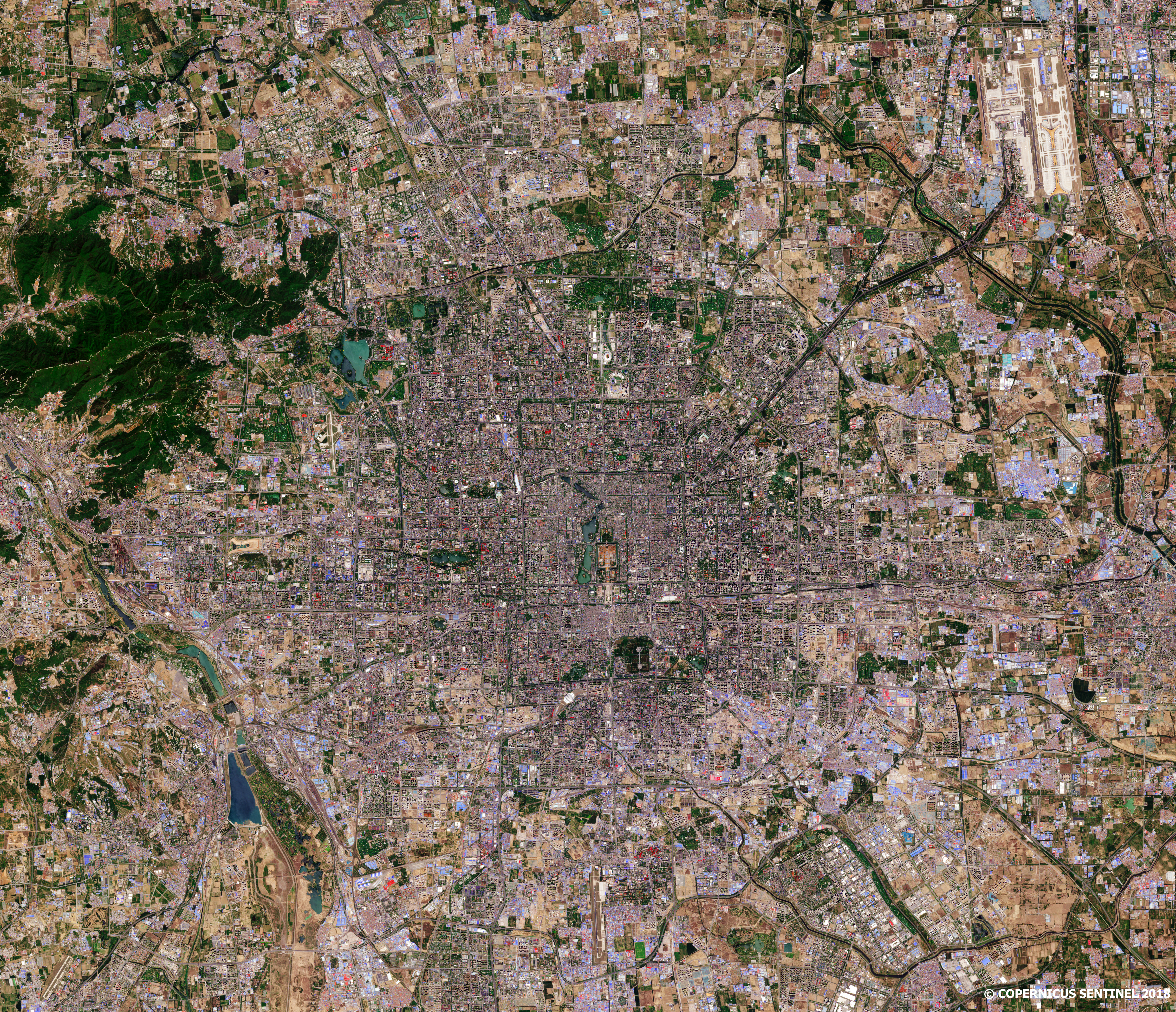Image de la capitale chinoise acquise par le satellite Sentinel-2, le 3 mai 2016. L'image en couleurs naturelles a une résolution native de 10m.