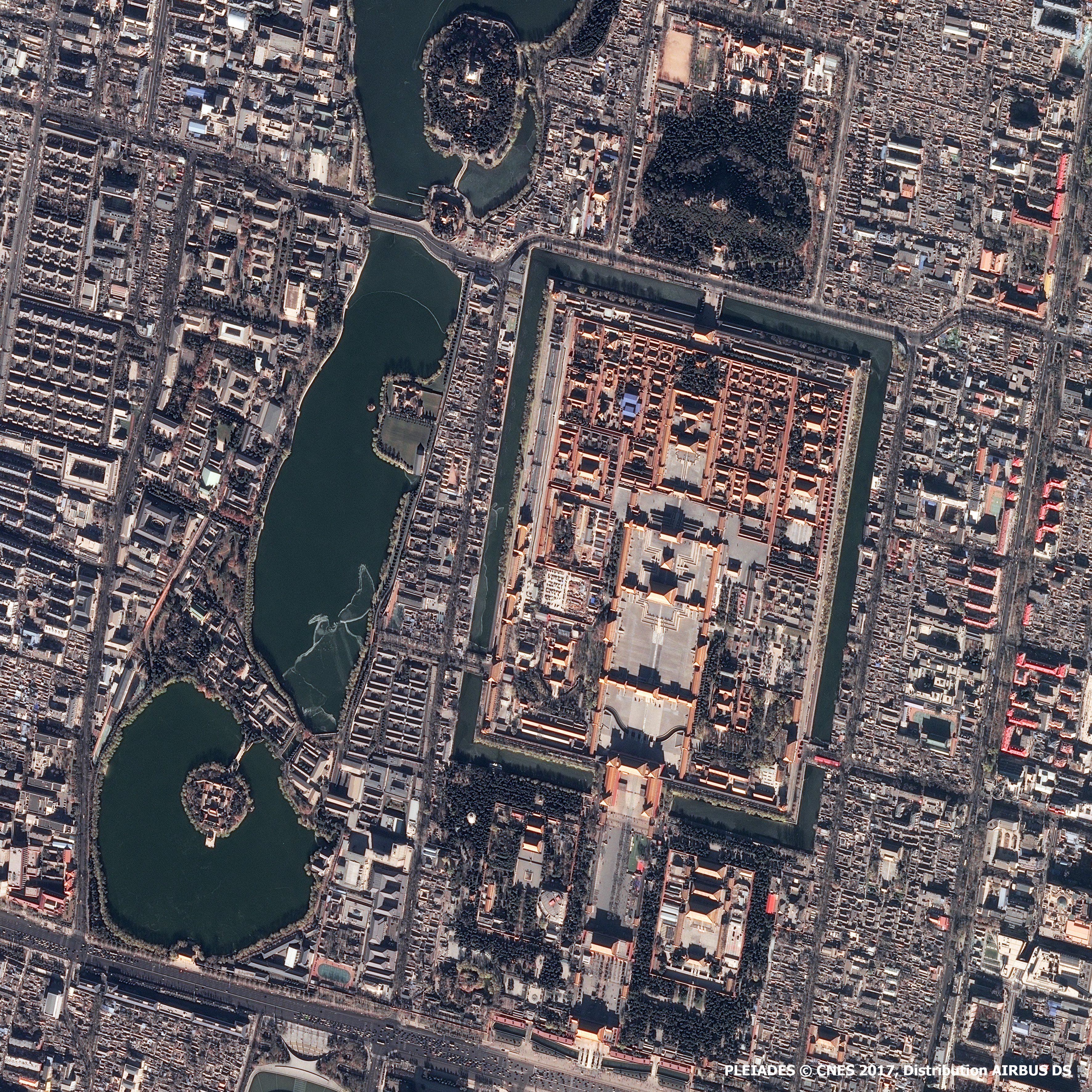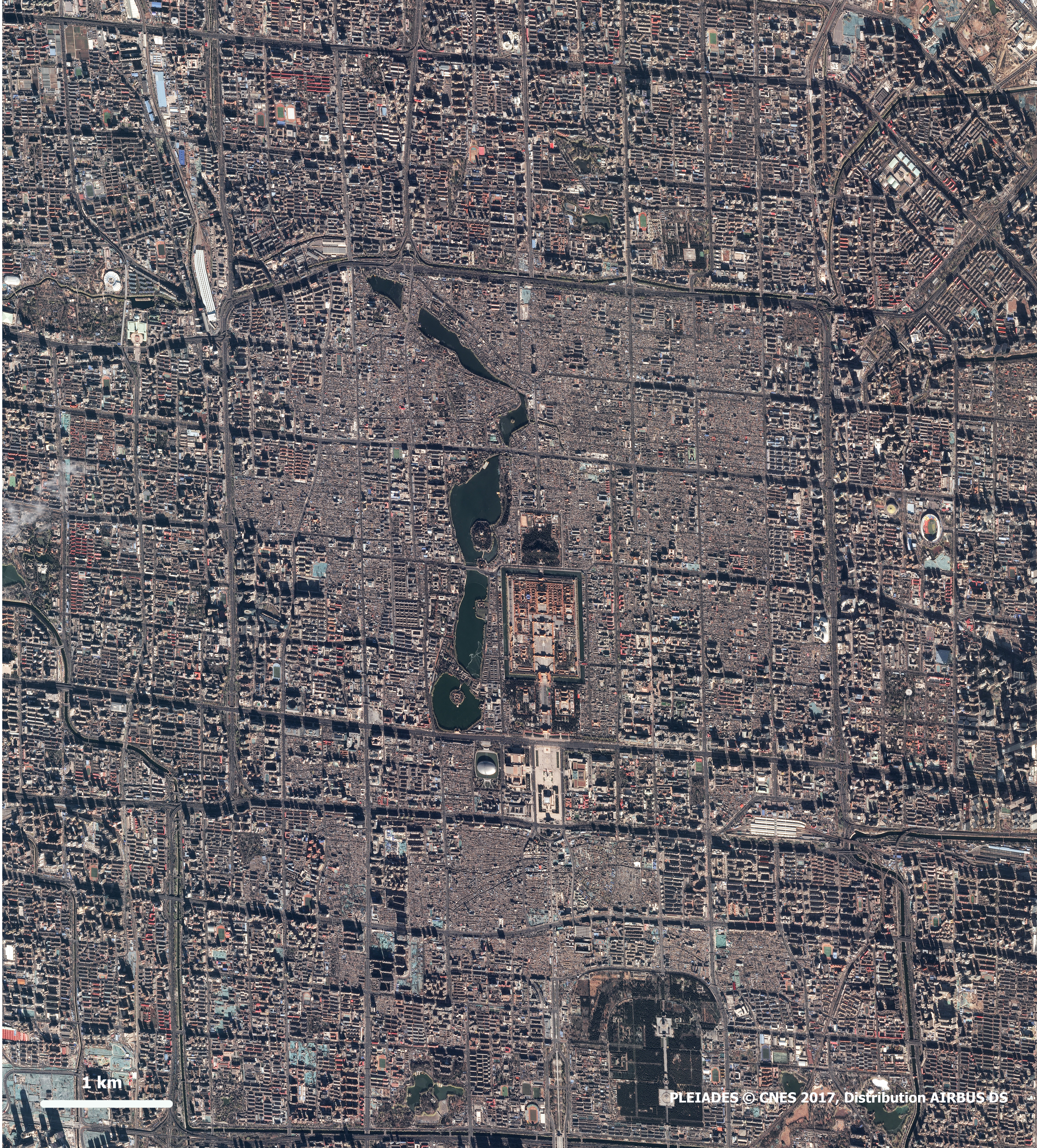 Cette image de la capitale de la République populaire de Chine, Pékin (également appelée Beijing), a été prise par un satellite Pléiades le 04/12/2017. Il s’agit d’une image en couleurs naturelles, de résolution native à 0,70m, ré-échantillonnée à 0,5m.