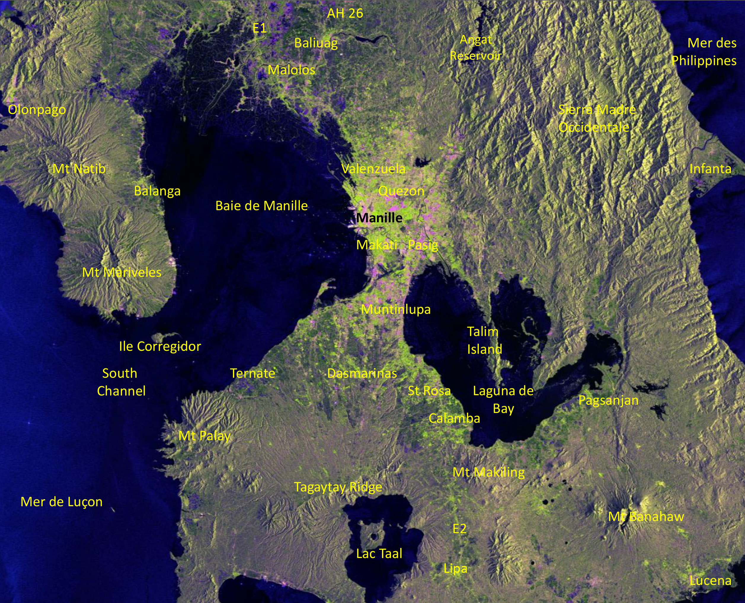 Dans la partie nord de l’espace couvert par cette image satellitale, on distingue bien la vallée de la rivière Angat. Un grand barrage dans la partie montagneuse de son cours - le barrage Angat, édifié entre 1961 et 1967 - fournit 90 % de l’eau du Grand Manille. Un deuxième barrage en plaine, situé juste en amont de la ville de Baliuag (150 000 hab), a un double rôle de régulation des crues et de réservoir pour l’irrigation de la plaine centrale de Luçon, une des grandes régions rizicoles du pays (provinces de Bulacan, où se trouve Baliuag, et de Pampanga).