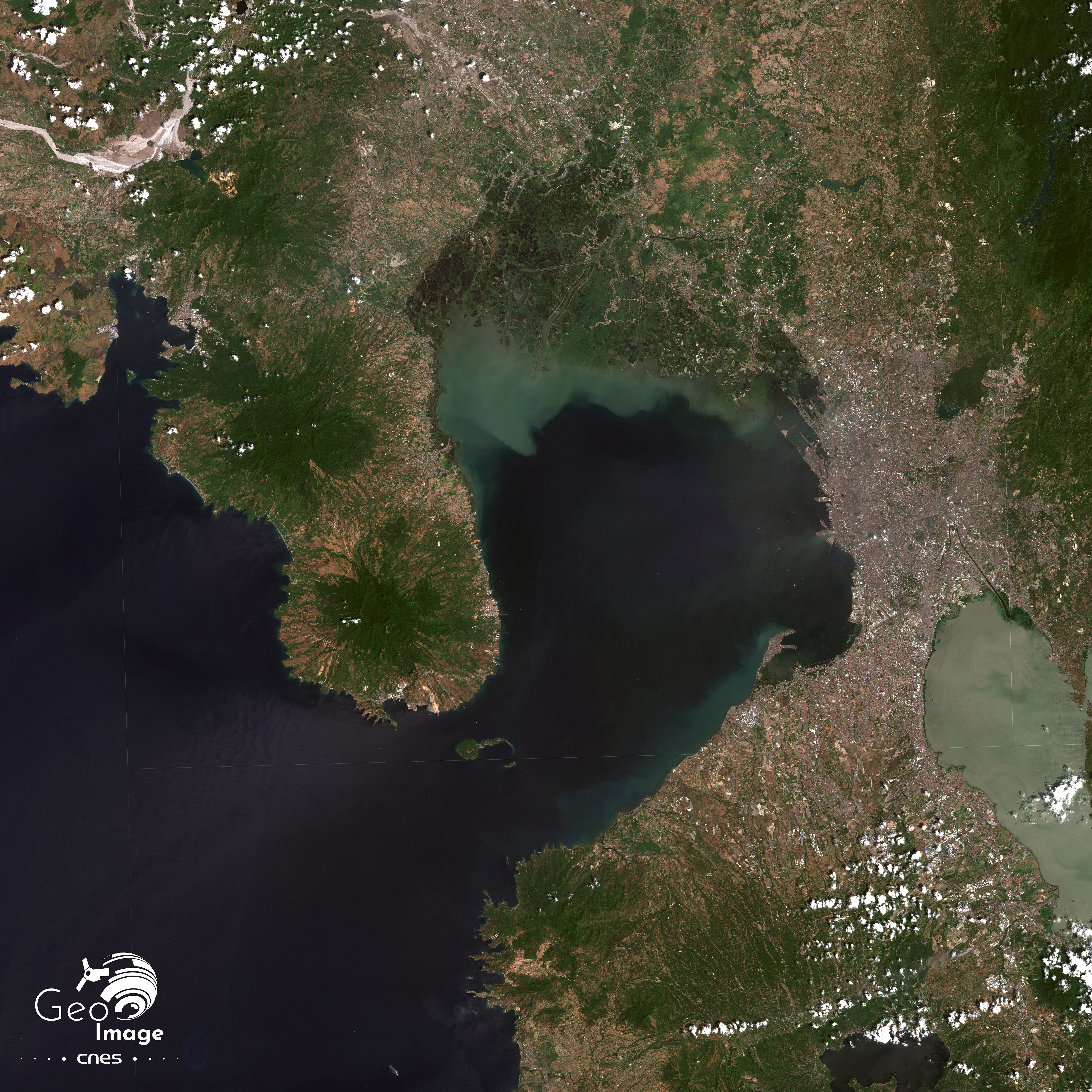 Du côté Sud de l’image, le lac Taal (267 km2, profondeur maximale 160 m) est une curiosité géographique unique au monde : il s’agit d’un lac de caldeira au milieu duquel surgit le volcan Taal, dont le cratère inclut un petit lac où pointe un piton volcanique. C’est donc “une île dans un lac dans une île – la Volcano Island – elle même située dans un lac, le lac Taal – qui se trouve dans une île, celle de Luçon !”. De faible altitude (400 m), le volcan Taal est lui aussi un volcan actif avec 33 éruptions enregistrées depuis 1572, la dernière datant de 1977, qui peut s’avérer meurtrier (1.335 morts en 1911). Les éruptions du volcan Taal peuvent affecter la région de Manille, comme en 1754 (retombées de cendres et tephra). Le lac Taal a connu dans le passé des tsunamis lacustres liés à l’intense activité tectonique locale.