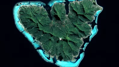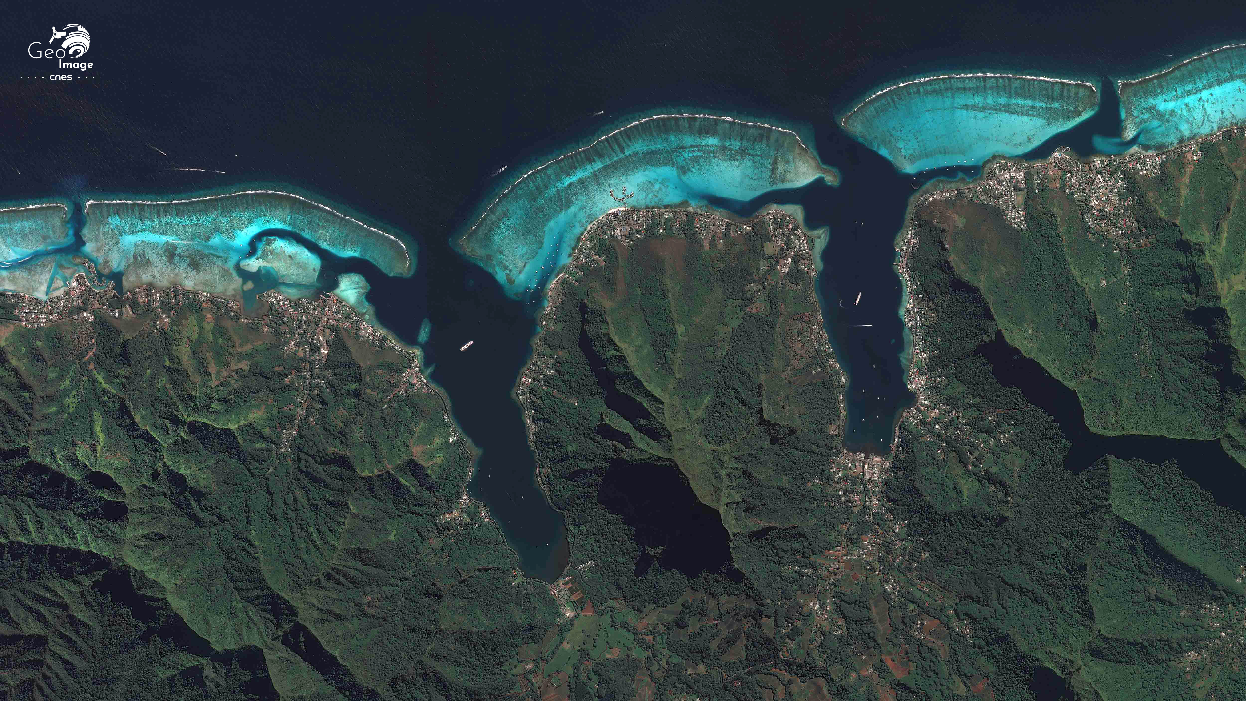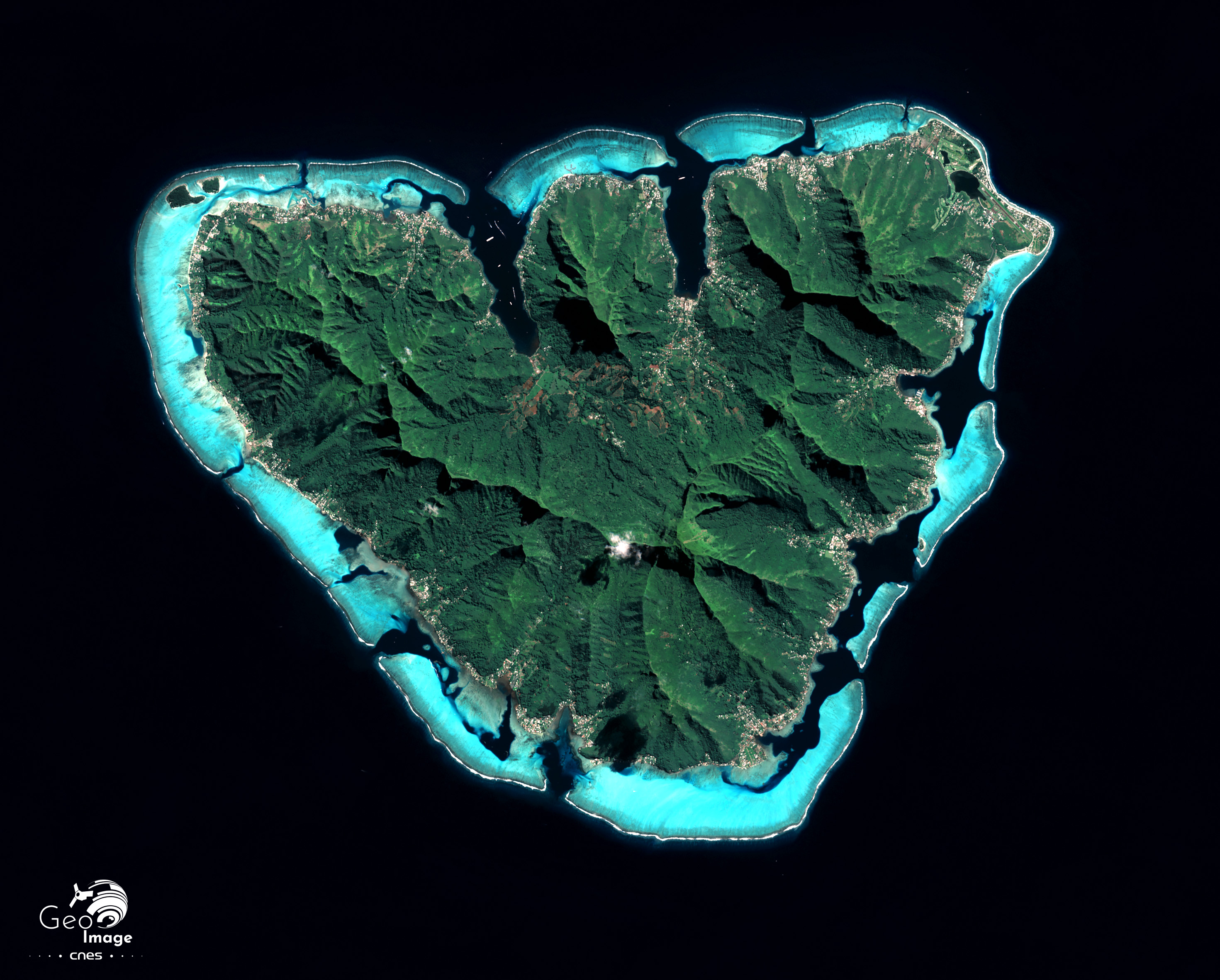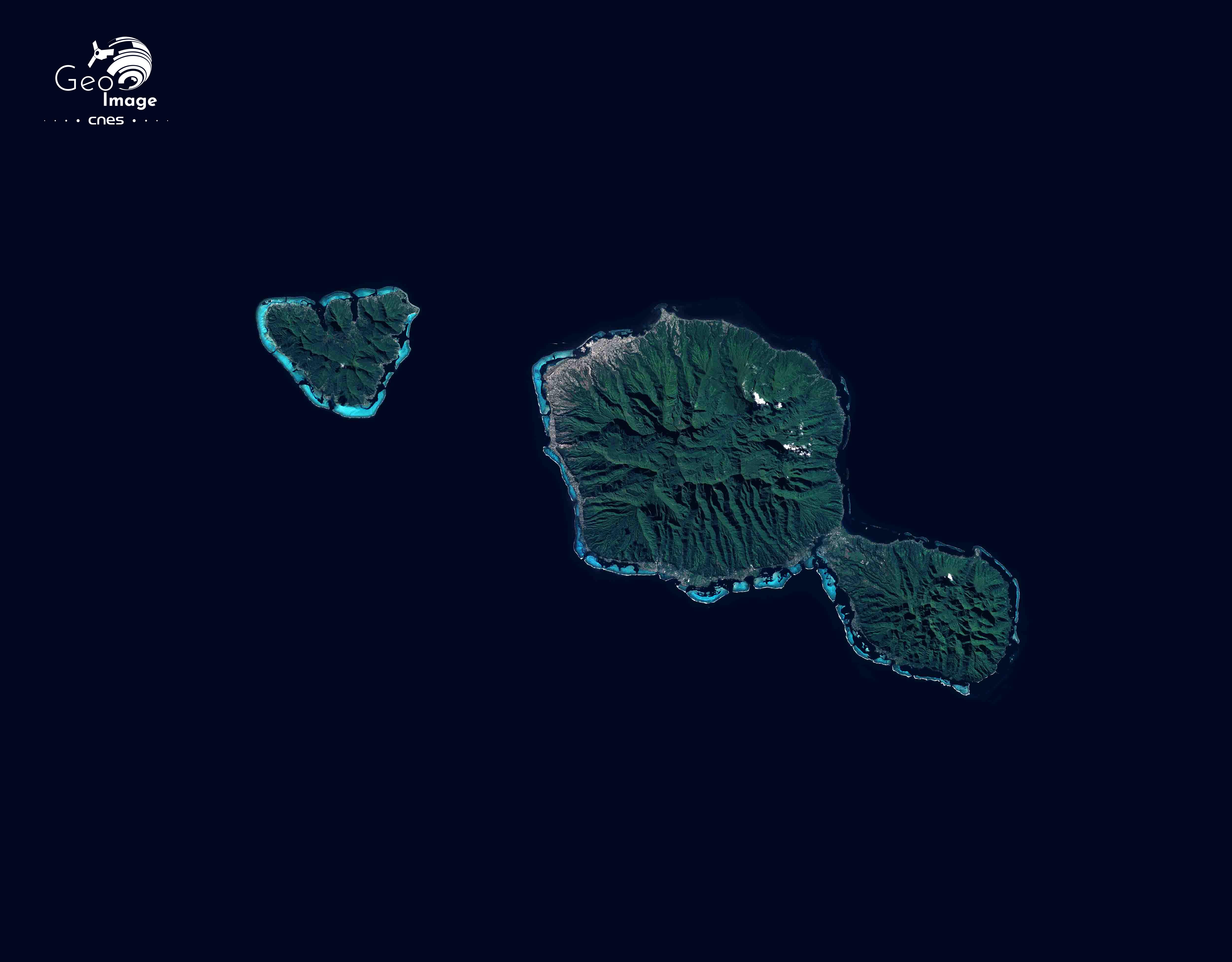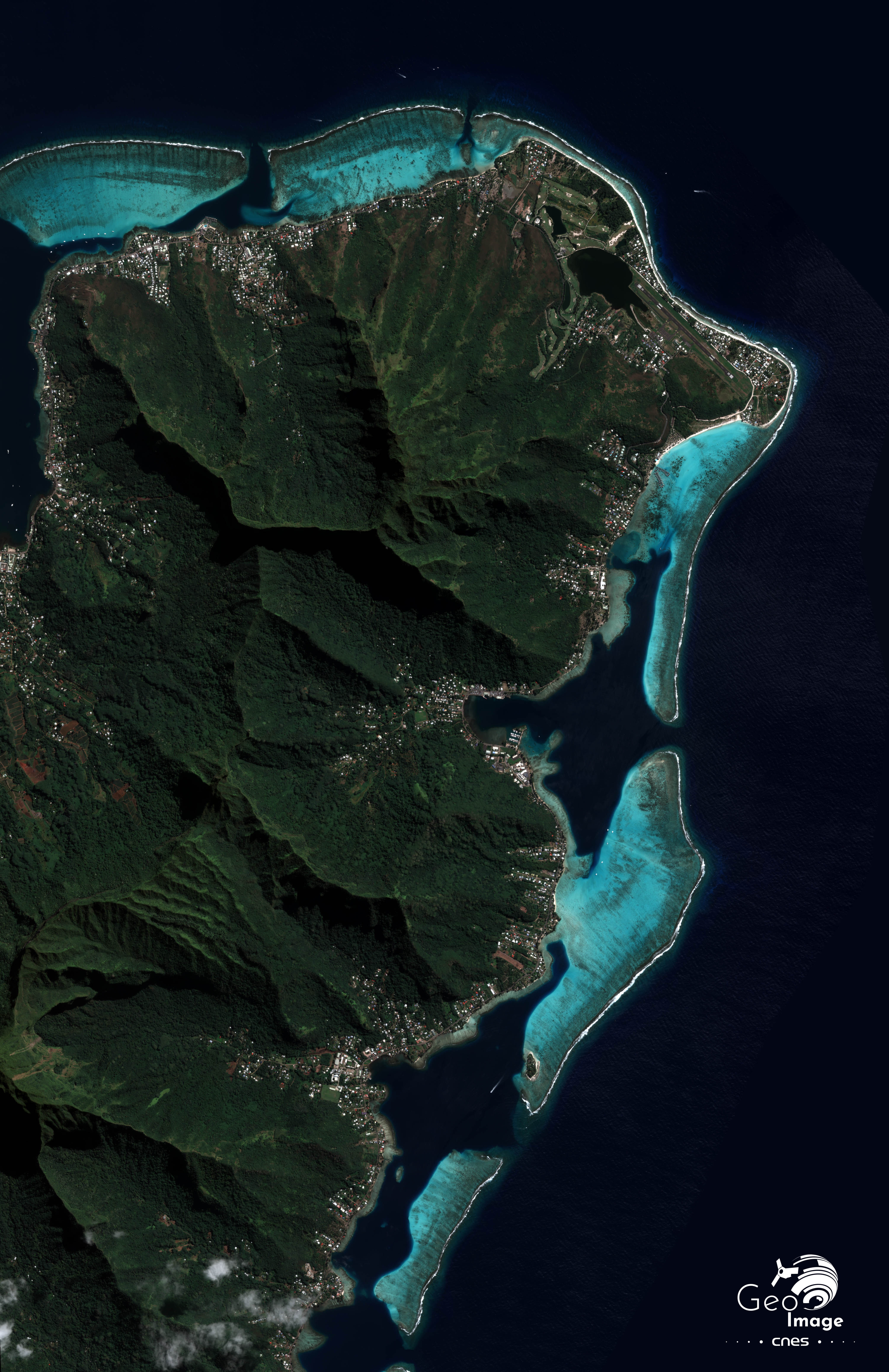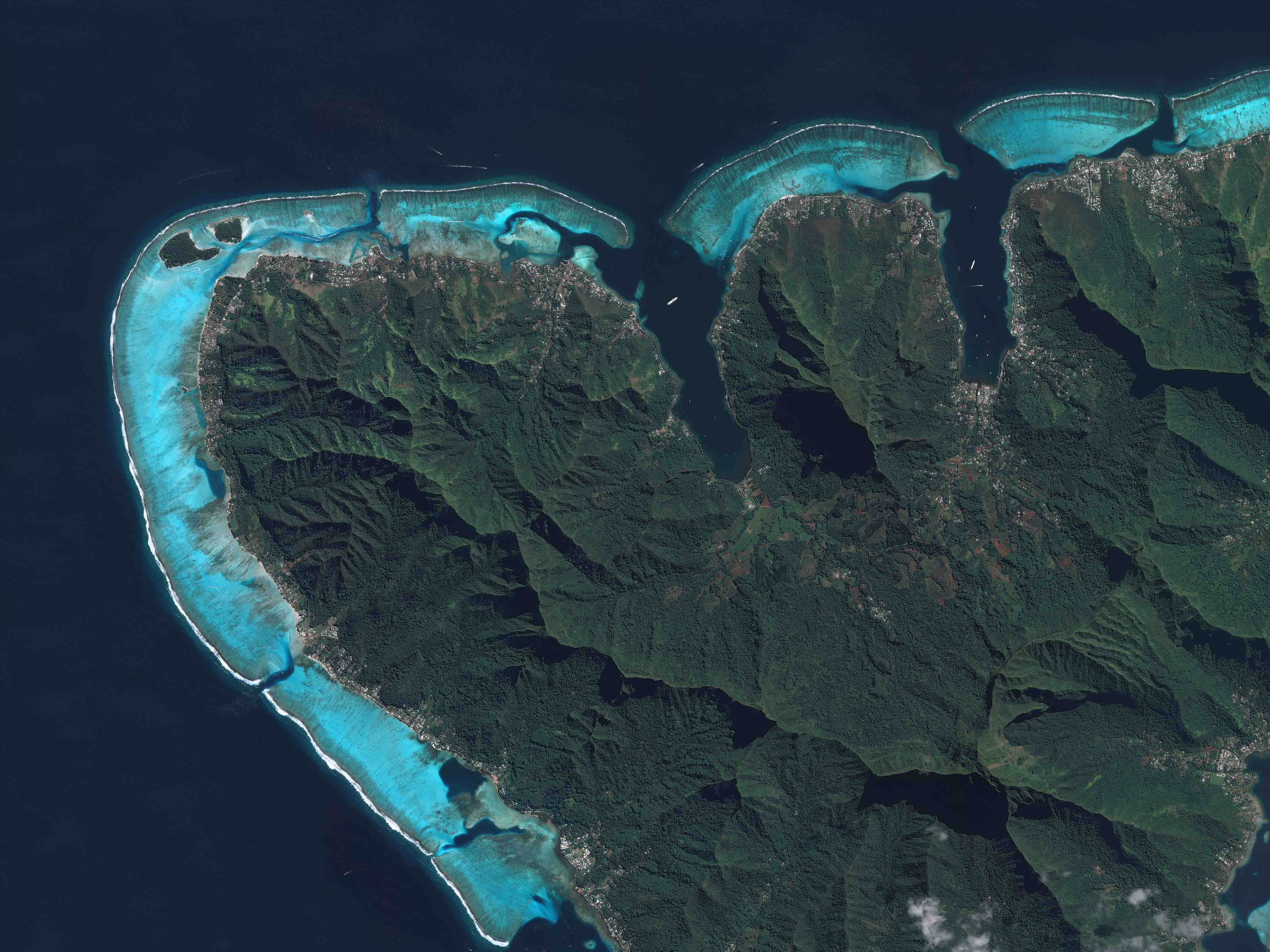 Cette image de l'île de Moʻoreʻa, au nord-ouest de Tahiti, a été prise par le satellite Sentinel-2B le 21 juin 2021. Il s’agit d’une image en couleurs naturelles de résolution native à 10m.