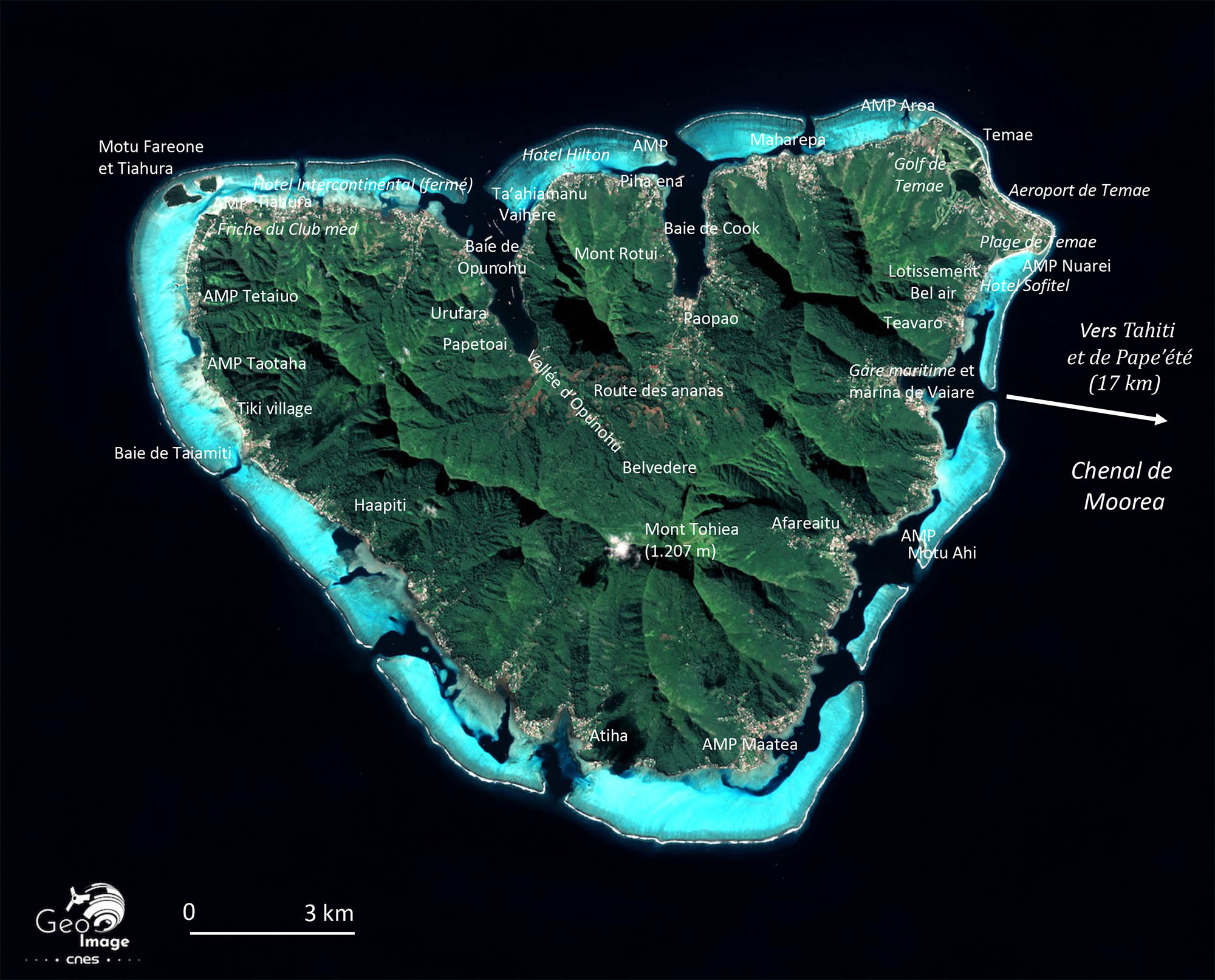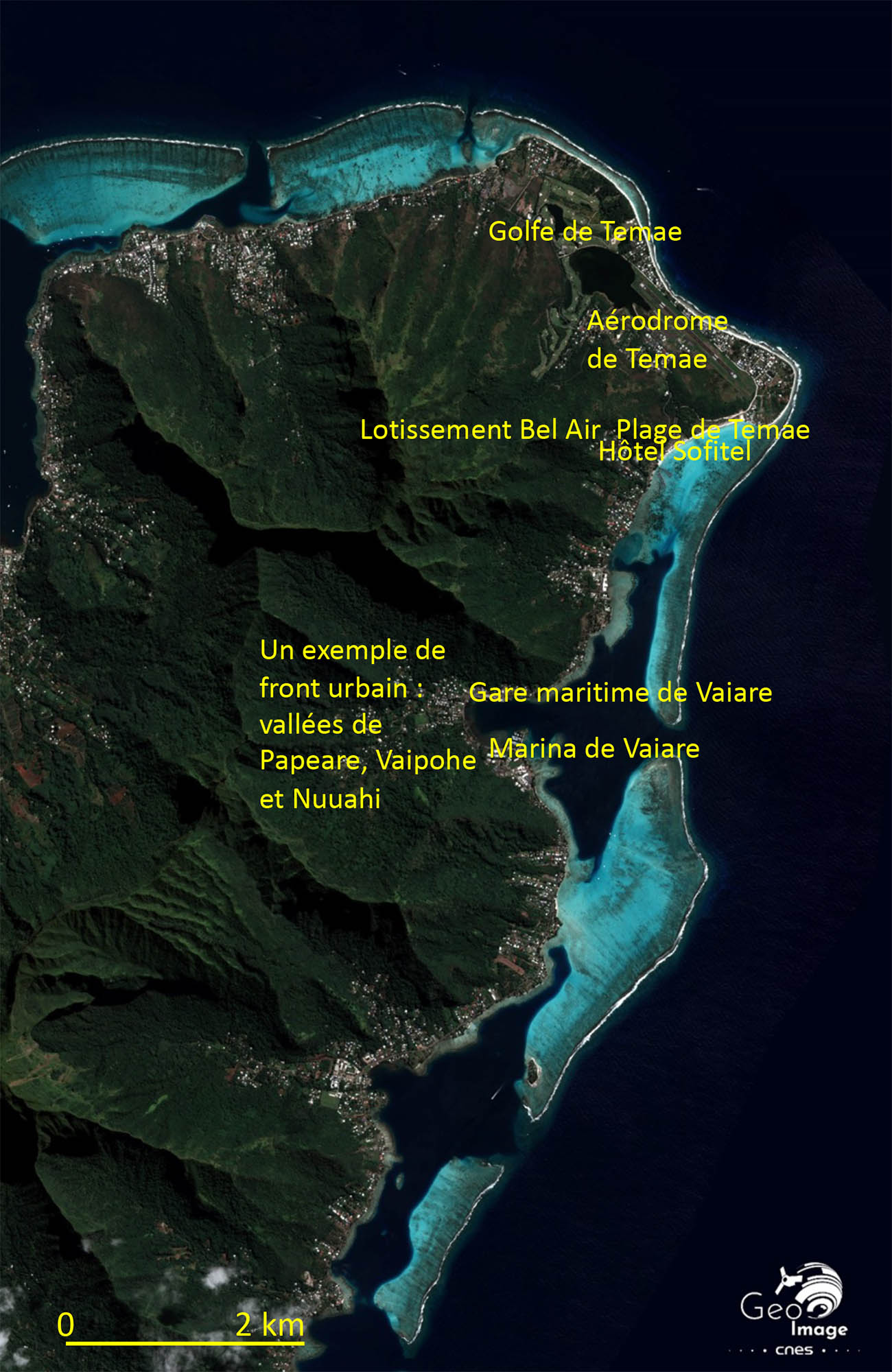 La Polynésie française comme l’archipel de la société, et au sein de celui-ci les îles du Vent, sont marqués par la macrocéphalie papeetienne et un modèle centre – périphérie très prégnant. Mo’orea est bien connectée à Tahiti, l’île principale, qui dispose d’un aéroport international, et avec laquelle elle entretient des liens quotidiens rendus possibles par des rotations maritimes multiples et régulières entre la gare maritime de Vaiare, à l’est de l’île, et celle de Pape’ete. Elle est ainsi devenue un espace périphérique de Tahiti et de l’aire urbaine de Pape’ete. « Île satellite », elle connait des dynamiques d’intégration à différentes échelles, du local au mondial. Cette intégration croissante peut se lire dans l’espace dévoilé par l’image satellite. Elle vise à répondre – temporairement ? – à une problématique de saturation de l’espace dans la zone urbaine de Pape’ete. Mo’orea est ainsi en voie d’annexion fonctionnelle au pôle dominant que constitue la capitale de la Polynésie française.
