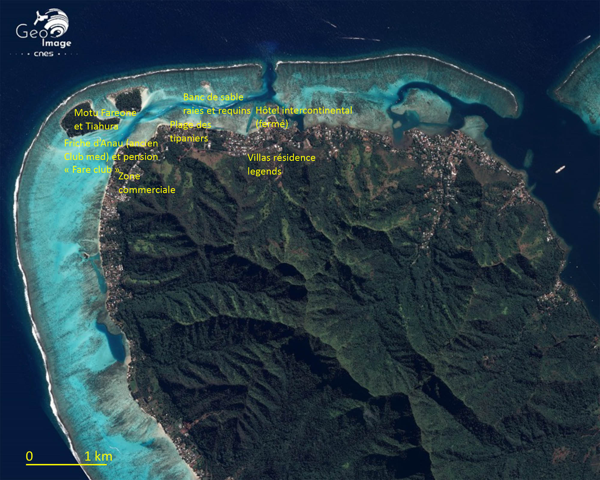 On ne s’étonne pas de la présence de différents types d’hébergements touristiques, du camping à l’hôtel 5* avec bungalows sur pilotis, en passant par des pensions de famille et résidences de villas luxueuses, qui sont essentiellement exploitées en tant que résidences secondaires ou locations de tourisme à l’exemple des villas Residence Legends côté montagne, face à l’hôtel Intercontinental. En face de la plage des Tipaniers, dont l’accès a été privatisé par l’hôtel du même nom, un banc de sable situé au-delà du chenal de navigation est dédié au nourrissage des raies pastenagues, l’une des principales attractions touristiques de Mo’orea. La concentration d’excursionnistes et de bateaux loués, dont quelques-uns sont visibles sur l’image satellite, qui déversent leurs lots de touristes dans le lagon, y est sans doute plus spectaculaire que celle des raies et des requins pointe noire évoluant parmi des touristes plus ou moins sereins.