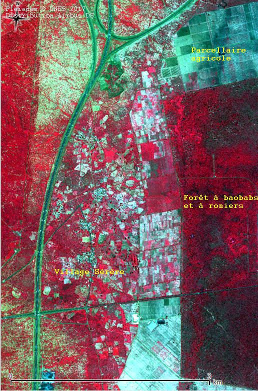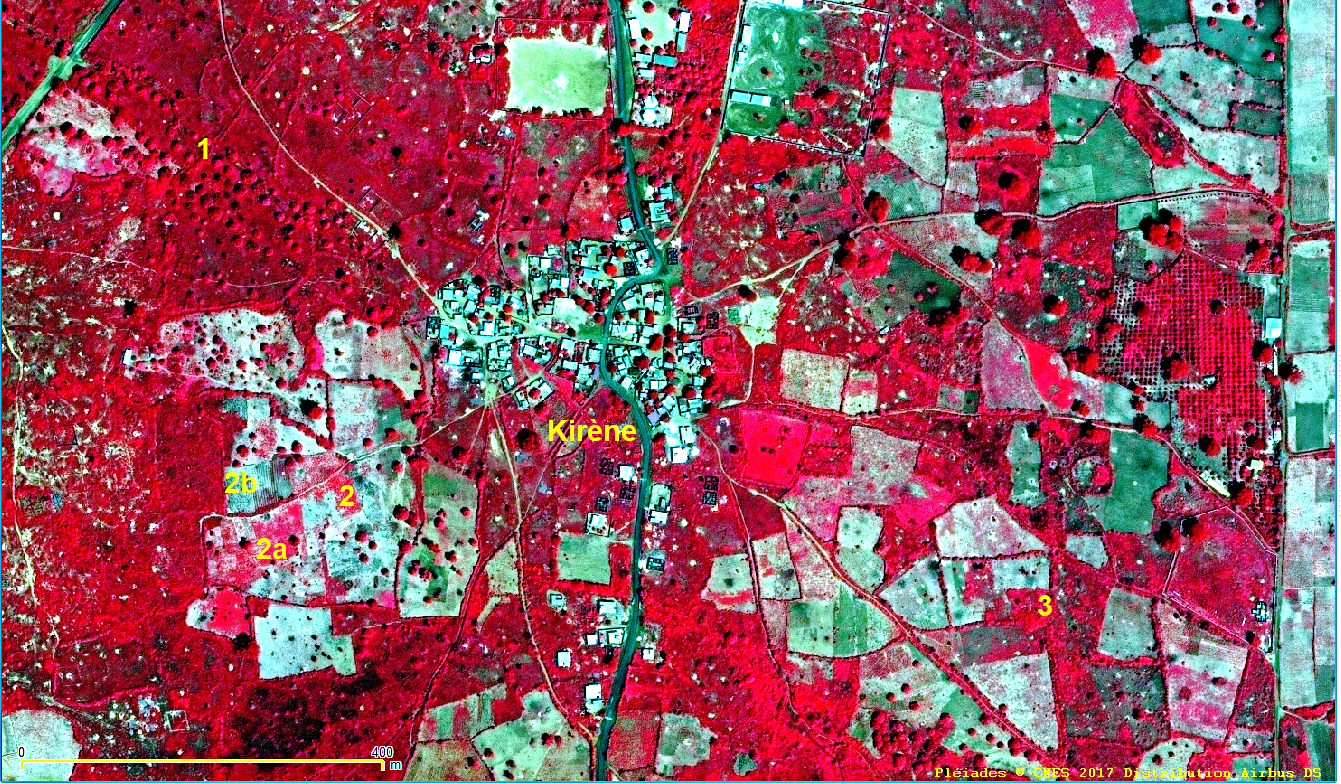 Dans l‘extrait d’image on distingue encore la notion de soles, même si elle un peu estompée aujourd’hui. On reconnait l’une en jachère (1) qui apparait en rouge intense du fait de la couverture herbacée en forte activité chlorophyllienne à la fin de la saison des pluies et ou le bétail va pâturer, tandis que les autres (2 et 3) sont occupées par des parcelles culturales dont on devine localement les rangs semés avec des cultures qui lèvent (en rouge claire) 2a et 2b. Traditionnellement ces cultures étaient du mil et des arachides.