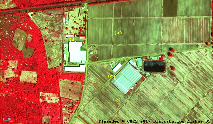 L’image Pléiades 1A du 08/10/2017 est restituée en composition colorée « fausse couleur » qui permet de mettre en évidence l’information enregistrée par le satellite dans le Proche infra-rouge. Cette composition donne une information supplémentaire à celle de l’œil humain. La couleur rouge correspond à des zones couvertes de végétaux ayant une activité chlorophyllienne, l’image été prise à la fin d’une saison des pluies normale.
