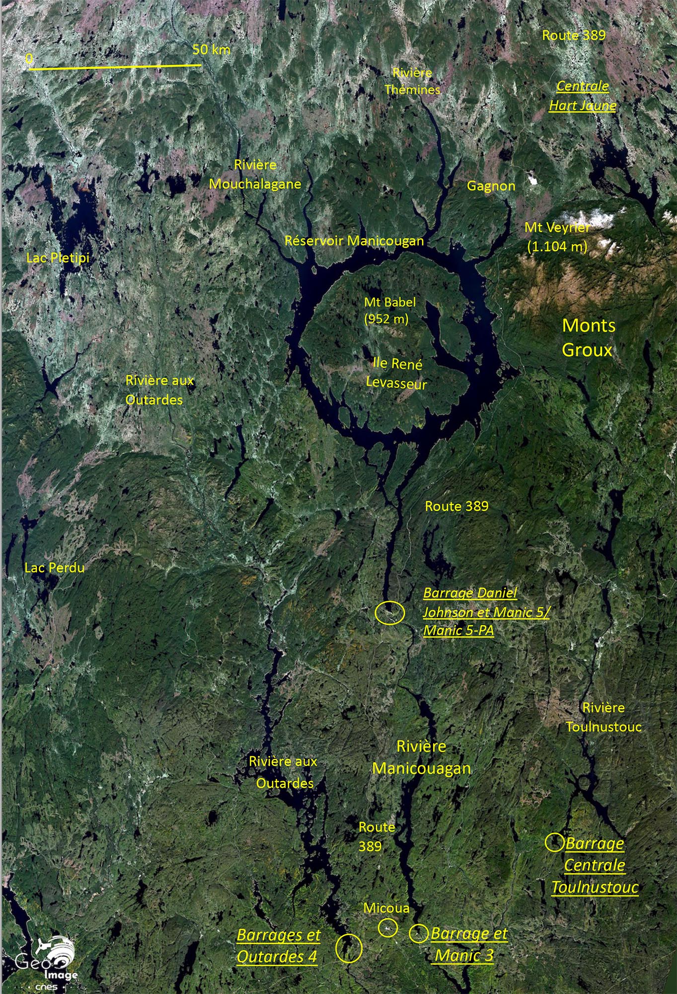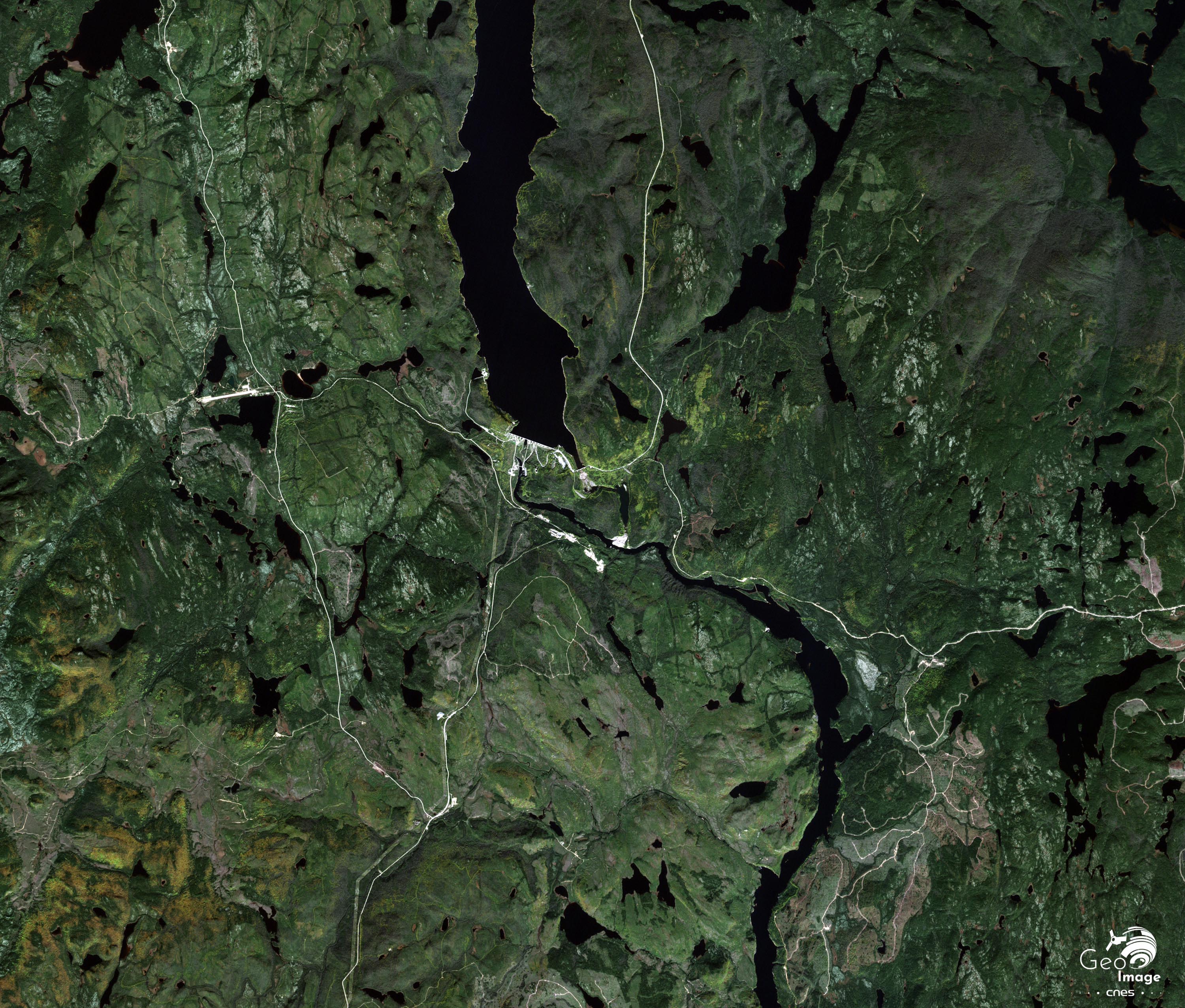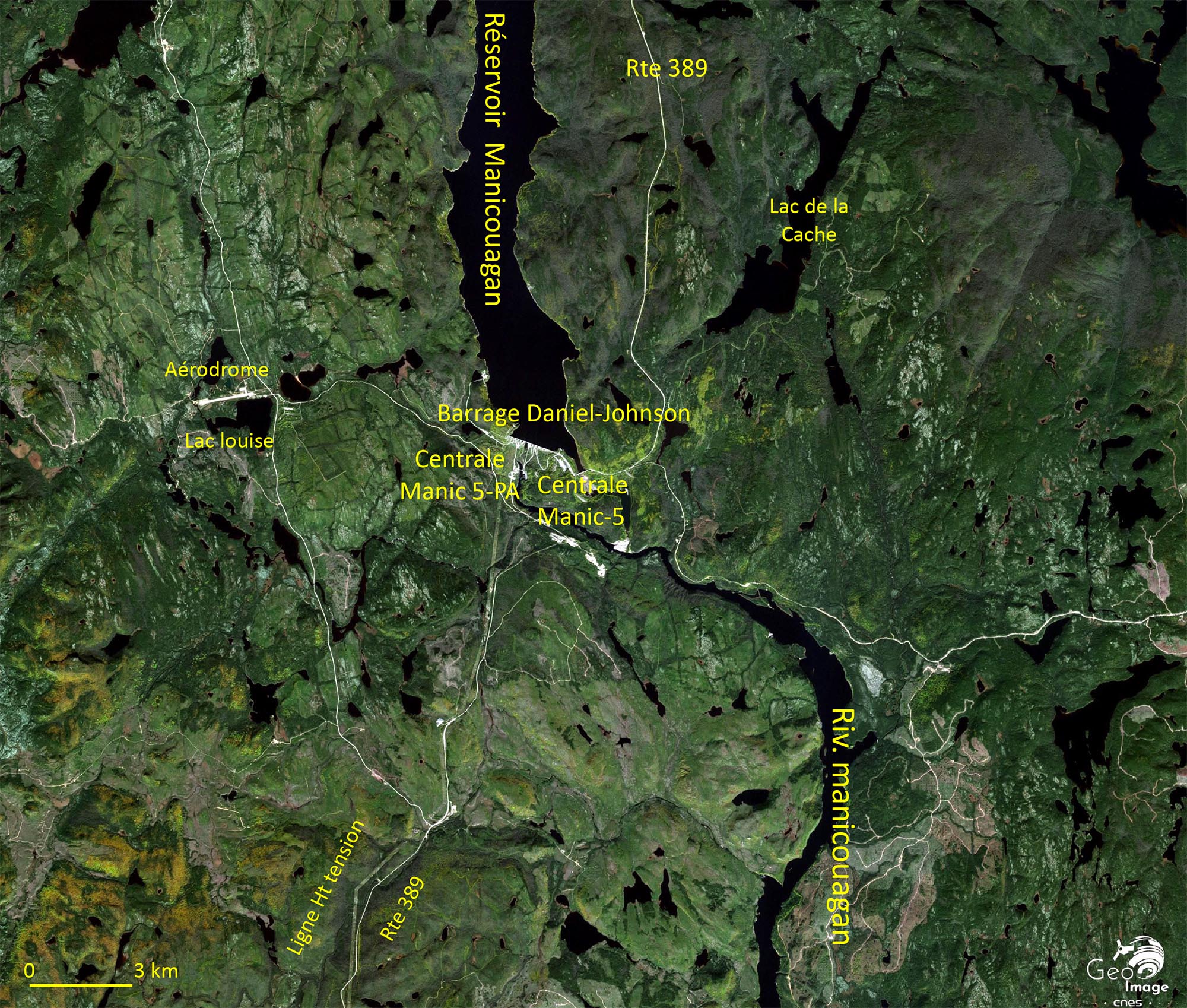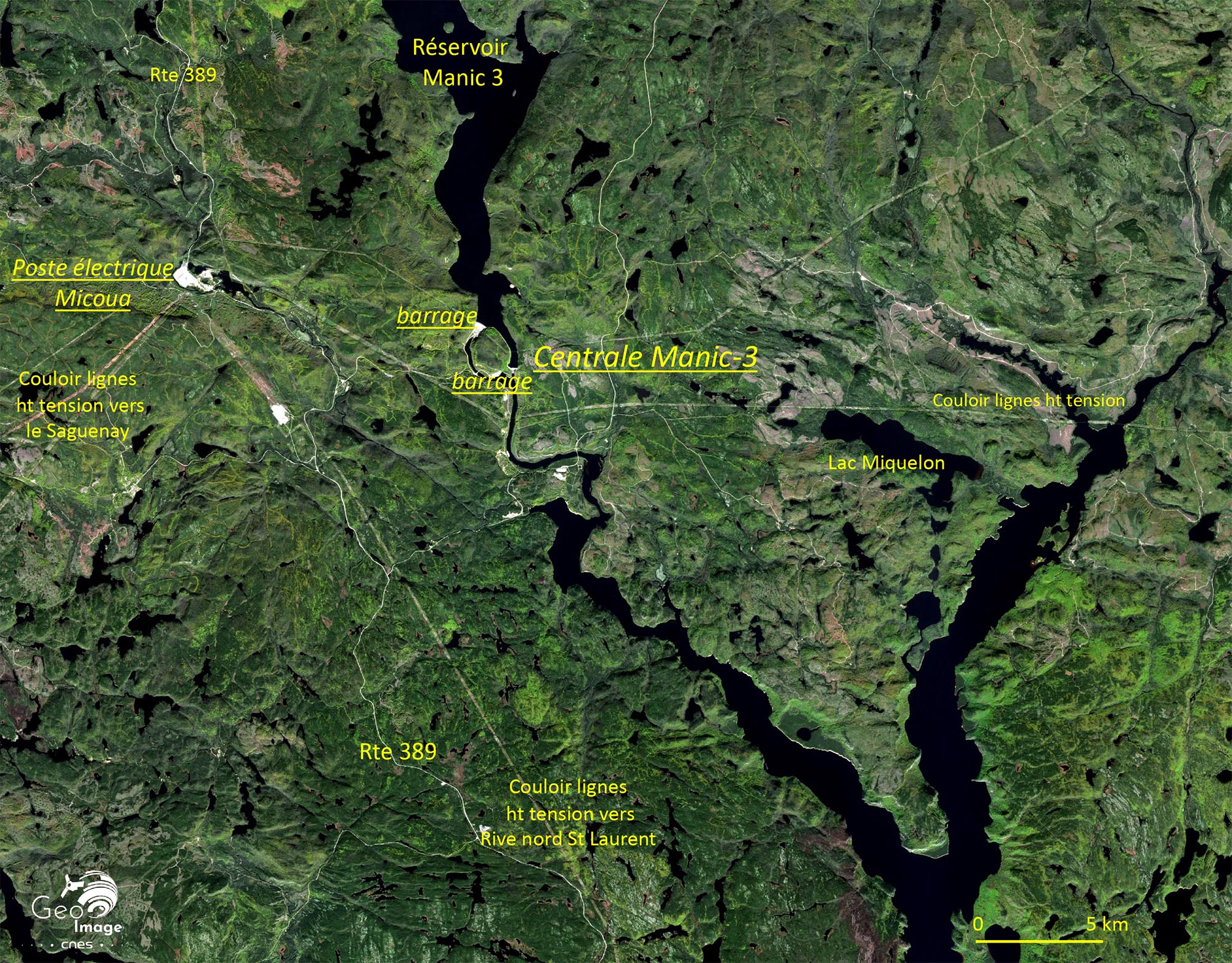 Cette image est centrée sur le complexe Manic-3. A quelques kilomètres à l’ouest (hors image) se trouve le complexe Outardes-4 sur la Rivière des Outardes. Les deux centrales sont connectées au poste électrique de MICOUA qui joue un rôle majeur dans la gestion des énormes flux électriques produits par le système régional.