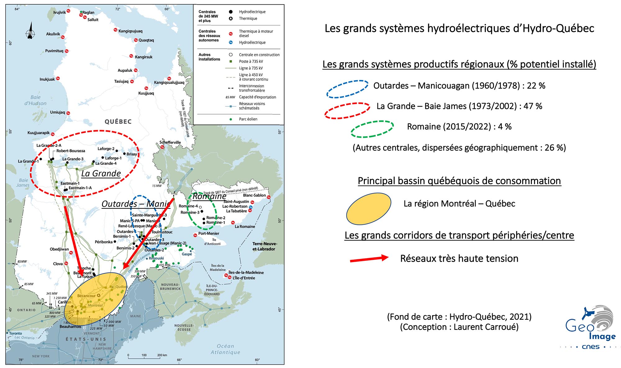Dans la région de la Côte Nord du Saint-Laurent, les hautes terres froides du bouclier laurentien vont être bouleversées par la construction entre 1959 et 1978 d’un vaste complexe hydroélectrique sur les rivières Manicouagan et Outardes. Les barrages vont créer de gigantesques lacs de retenues, dont le renommé « Œil du Québec », qui alimentent dix centrales dotées de 45 groupes d’une capacité totale de 8.228 mégawatts, soit 22 % du potentiel d’Hydro-Québec. Grâce à ces grands programmes d’aménagement, l’hydroélectricité fournit aujourd’hui 94 % de l’électricité du Québec et couvre 31 % de la consommation totale d’énergie. A l’origine symbole et levier géopolitique de la conquête de l’autonomie portée par la « Révolution tranquille », le complexe Outardes-Manic participe aujourd’hui d’un modèle provincial de développement plus durable - car largement décarboné - en phase avec la lutte contre le changement climatique.